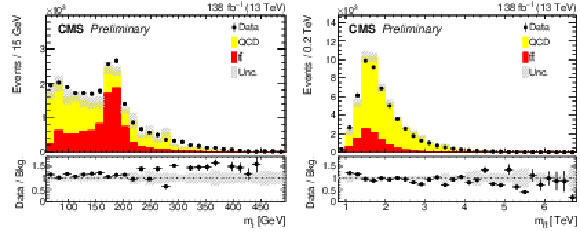 Run 2 data-to-MC comparison of distributions for the top mass of the leading jet (left) and the reconstructed $ {\mathrm{t}\overline{\mathrm{t}}} $ mass (right) in the inclusive central and forward categories, where both jets pass the top-tagging SR requirement. |