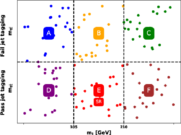 Illustration of the background estimation method. The dataset is separated into regions that pass and fail the subleading jet t-tagging requirement, as well as regions in the leading jet mass $ m_\mathrm{t} $ above and below the top quark mass window. A two-dimensional polynomial fit is used to estimate the QCD background in Region E from Regions A, B, C, D, and F. |