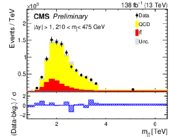 Post-fit $ {\mathrm{t}\overline{\mathrm{t}}} $ mass distribution in the $ m_\mathrm{t} $ sidebands after QCD background estimation, using the combined Run 2 dataset. The top panel corresponds to the central category, while the bottom panel corresponds to the forward category. Distributions are shown for the low $ m_\mathrm{t} $ (left) and high $ m_\mathrm{t} $ (right) sidebands. The lower part of each distribution shows the pull, defined as (Data-Bkg)/$ \sigma $, where $ \sigma $ denotes the total uncertainty. |