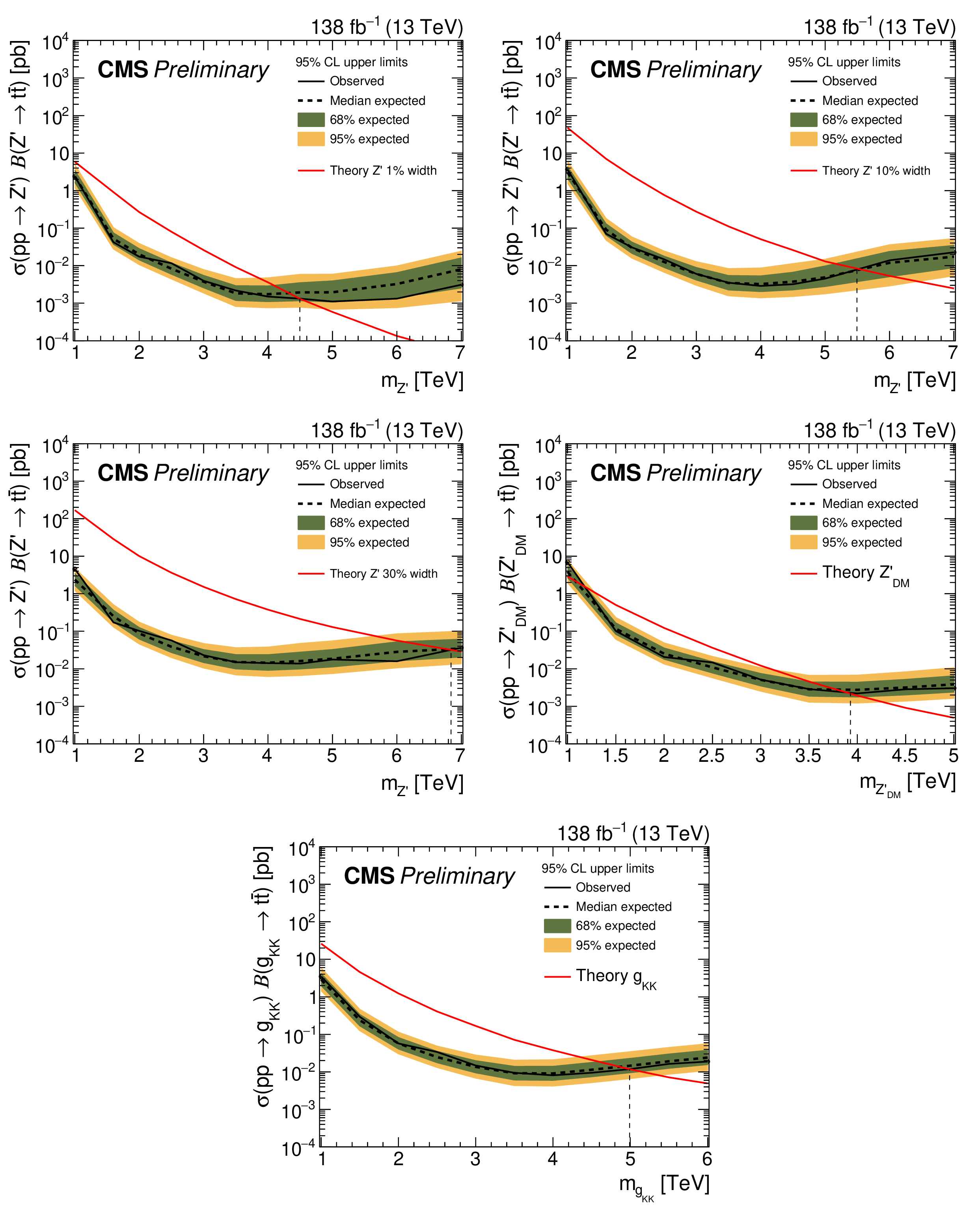 Expected and observed 95% CL upper limits on the cross section times branching ratio for five signal scenarios with three different width hypotheses: 1%, 10%, and 30%, as well as $ Z_{DM} $ and $ g_{KK} $, as a function of the new heavy particle mass. The five models considered are: a Z' boson with a width of 1% of its mass (upper left), a Z' boson with a width of 10% (upper right), a Z' boson with a width of 30% (lower left), $ Z_{DM} $ (lower right), and an RS KK gluon (bottom). The dashed black line represents the median expected limit, while the solid black line denotes the observed limit. The green (yellow) bands correspond to the one (two) sigma expected limit deviations. The solid red line shows the theoretical cross section expected for the signal process of interest. |