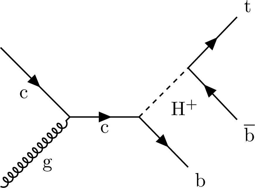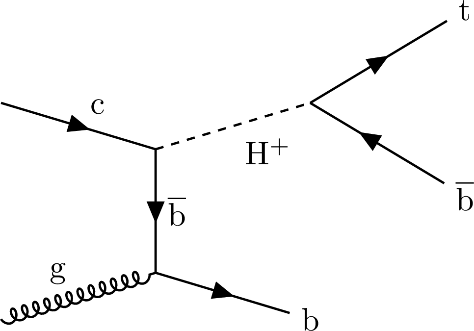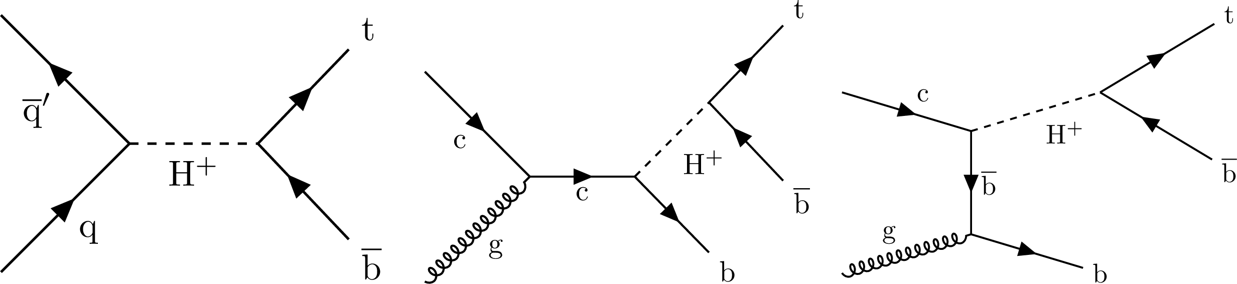 Representative tree-level Feynman diagrams for the signal processes: $ \mathrm{p}\mathrm{p}\to\mathrm{H}^{+}, \mathrm{H}^+\to\mathrm{t}\overline{\mathrm{b}} $ (left), and $ \mathrm{p}\mathrm{p}\to\overline{\mathrm{q}}\mathrm{H}^{+},\mathrm{H}^+\to\mathrm{t}\overline{\mathrm{b}} $ (middle and right). |