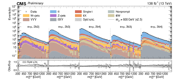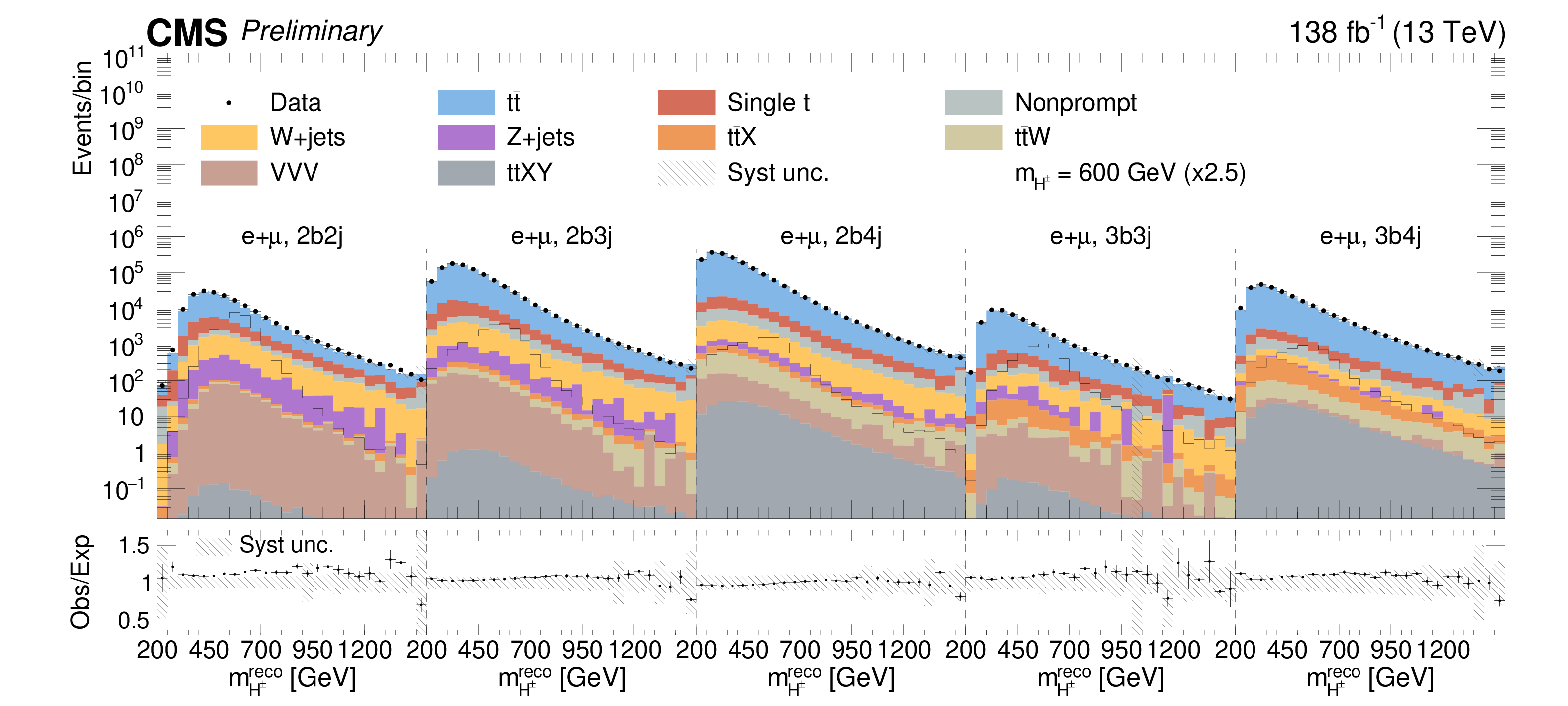 The pre-fit reconstructed $ \mathrm{\widetilde{H}^{\pm}} $ mass distributions in each region using full Run 2 data. Predictions for the signal with $ m_{\mathrm{\widetilde{H}^{\pm}}}= $ 600 GeV, is also shown. Beneath each plot the ratio of data to predictions is shown. The uncertainty bars in the ratio plots represent systematic uncertainties. |