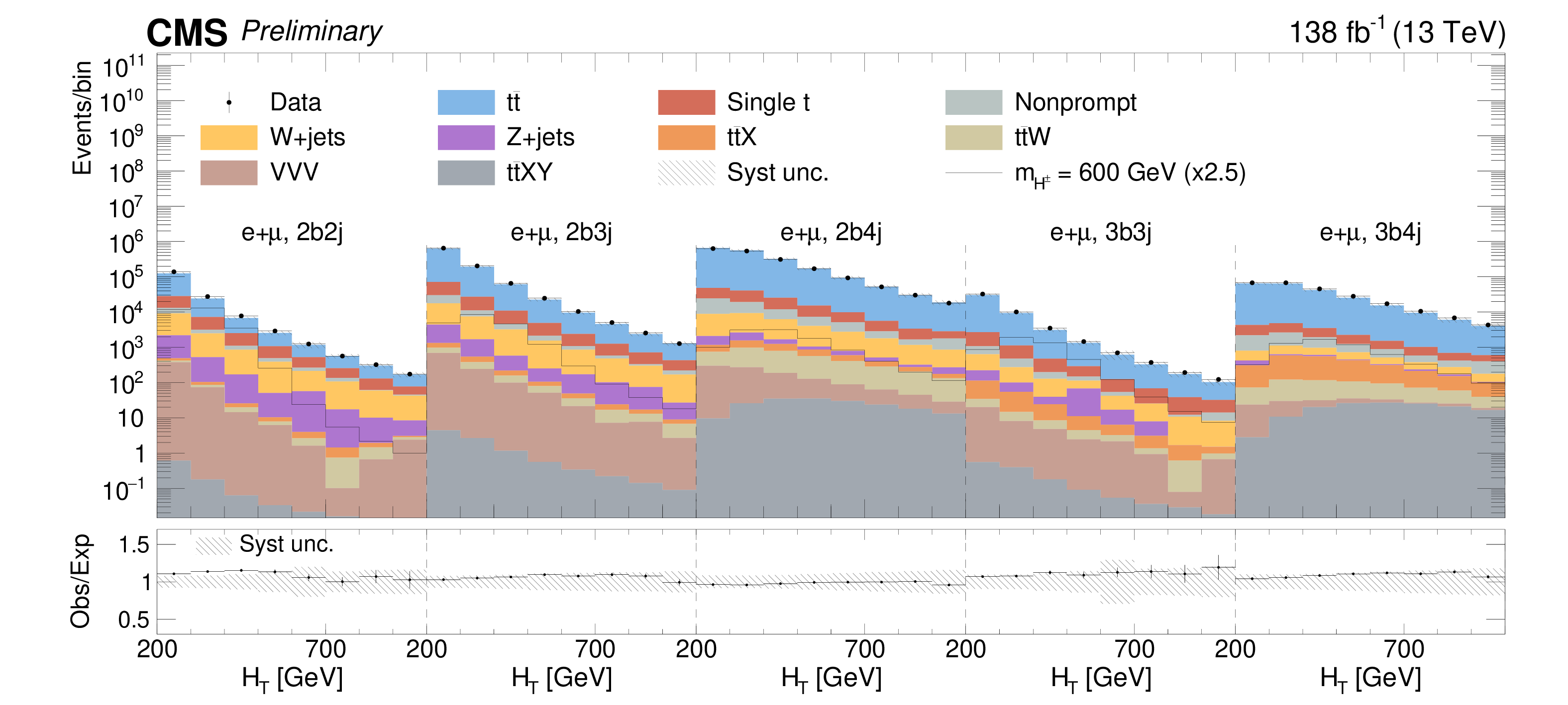 The pre-fit reconstructed $ H_{\mathrm{T}} $ distributions in each region using full Run 2 data. Predictions for the signal with $ m_{\mathrm{\widetilde{H}^{\pm}}}= $ 600 GeV, is also shown. Beneath each plot the ratio of data to predictions is shown. The uncertainty bars in the ratio plots represent systematic uncertainties. |