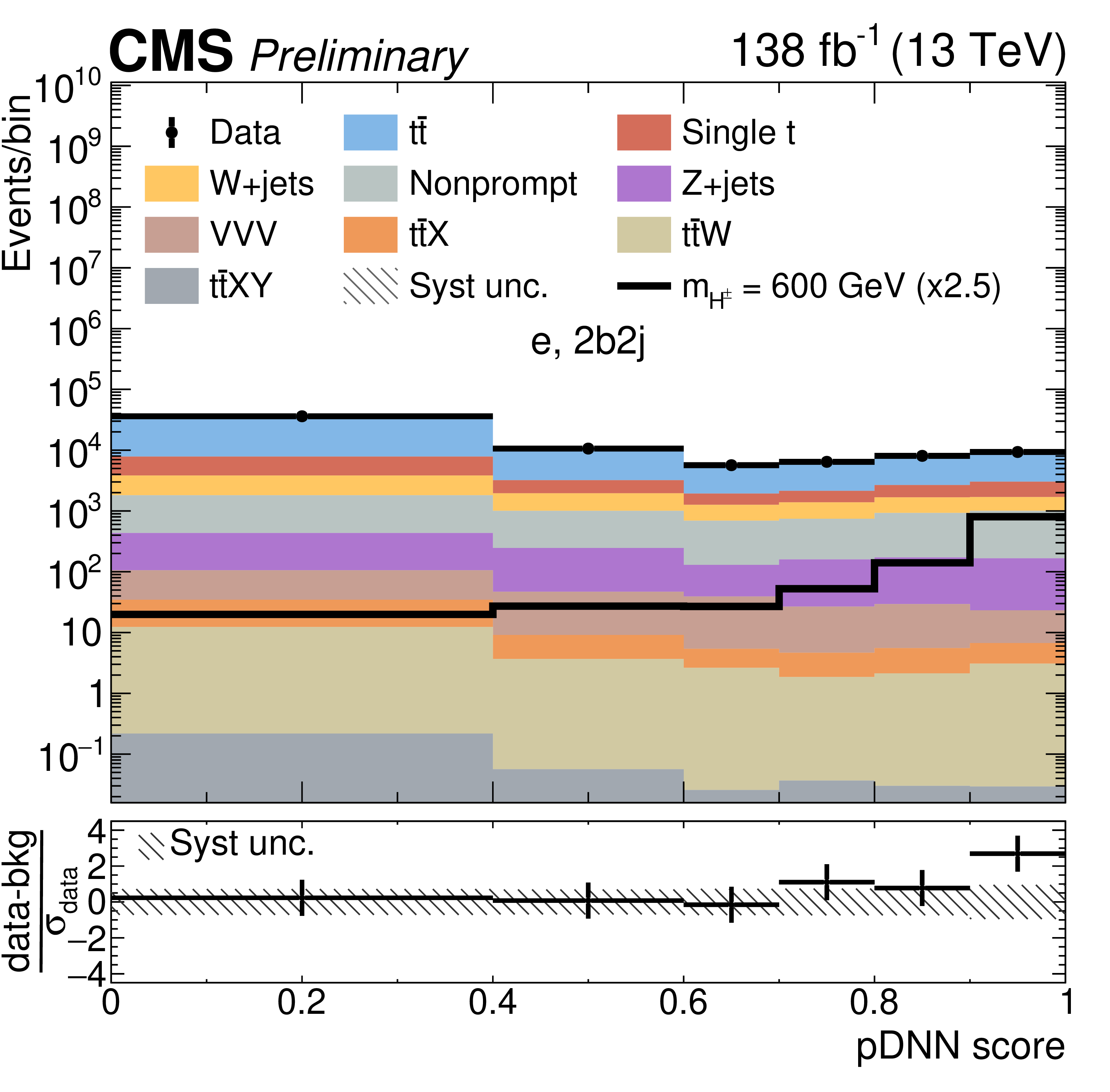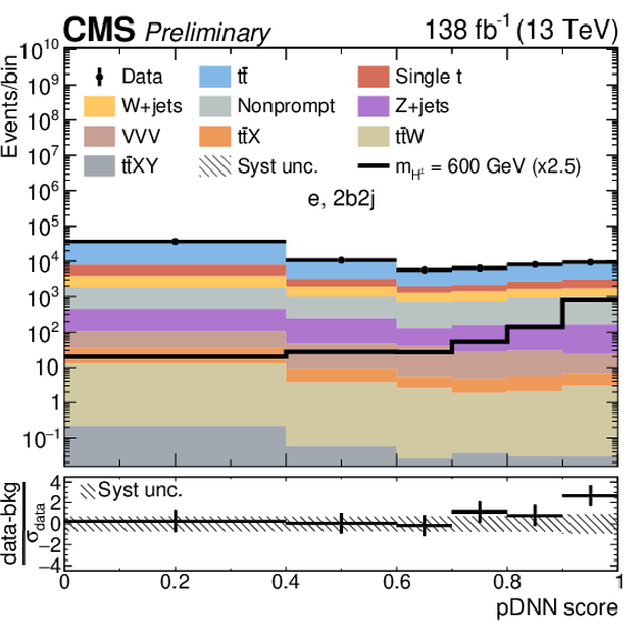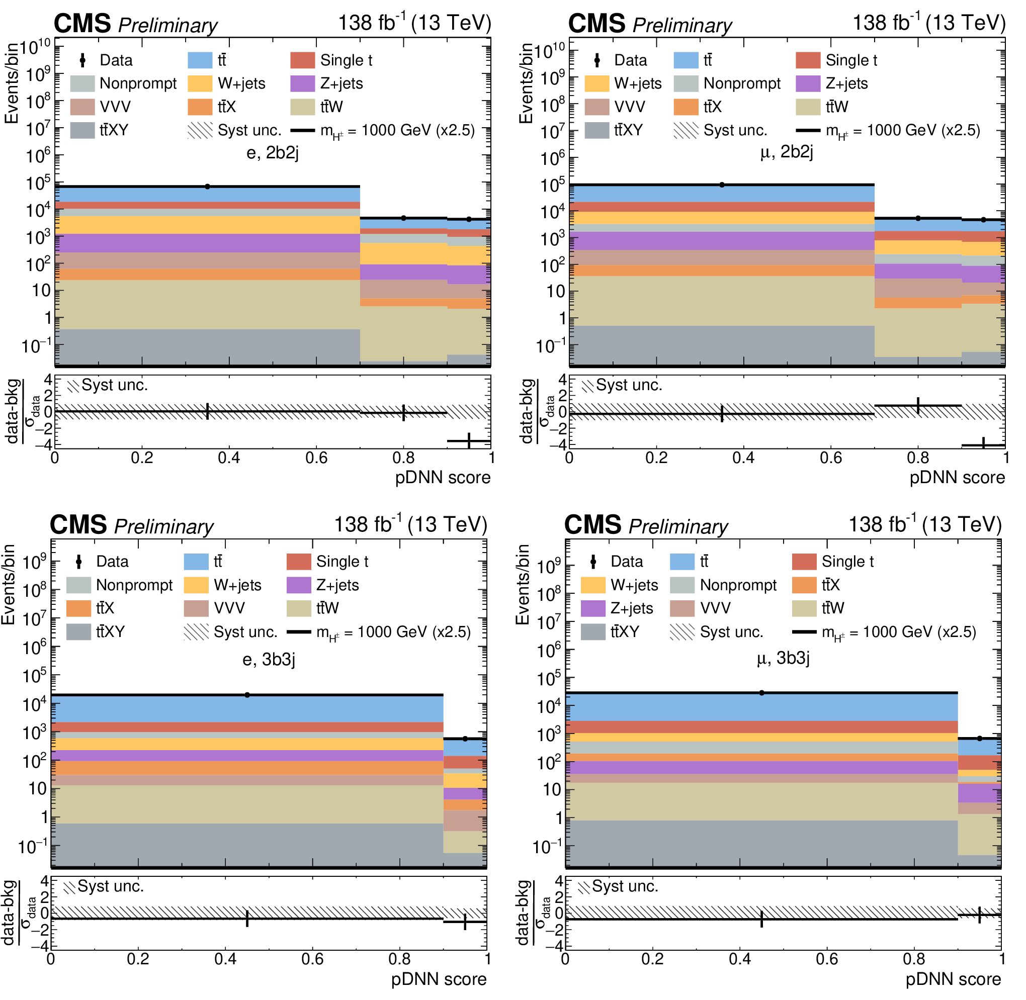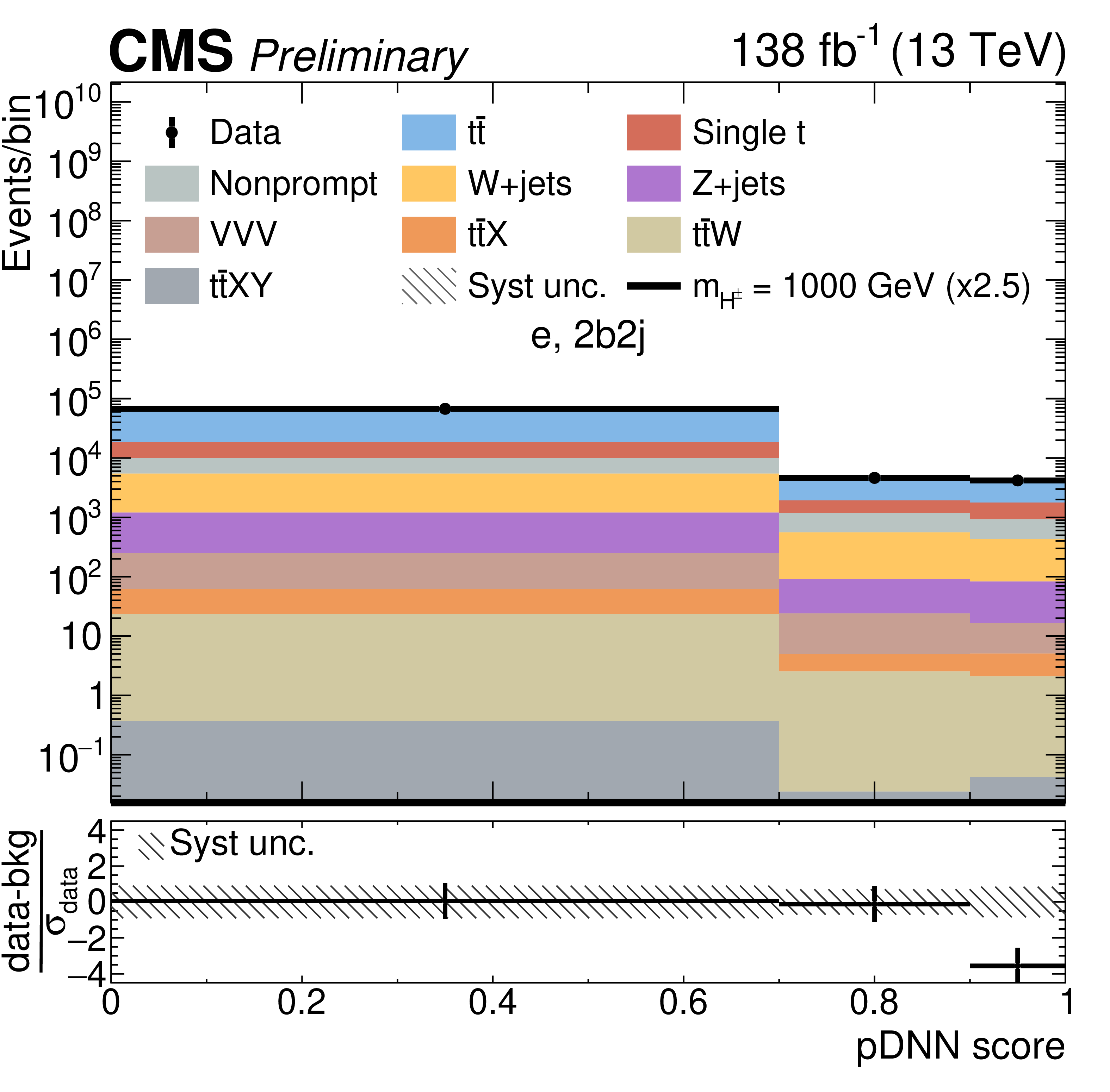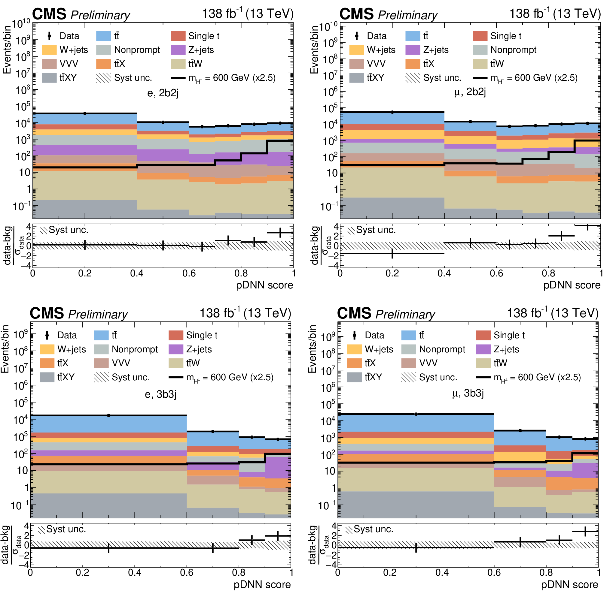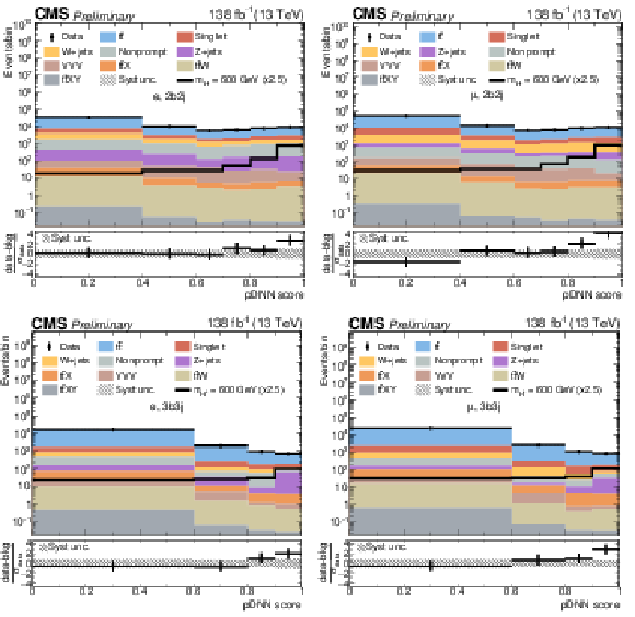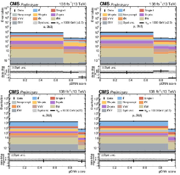The post-fit pDNN distributions in the SR 2b2j (upper) and 3b3j (lower) for electron (left) and muon (right) channels assuming $ m_{\mathrm{\widetilde{H}^{\pm}}}= $ 600 GeV using full Run 2 data. Predictions for the signal with $ m_{\mathrm{\widetilde{H}^{\pm}}}= $ 600 GeV, $ \rho_{tc}= $ 0.4, $ \rho_{tt}= $ 0.6 are shown. Beneath each plot the ratio of data to predictions is shown. The uncertainty bars in the ratio plots represent systematic uncertainties. |