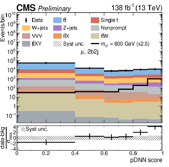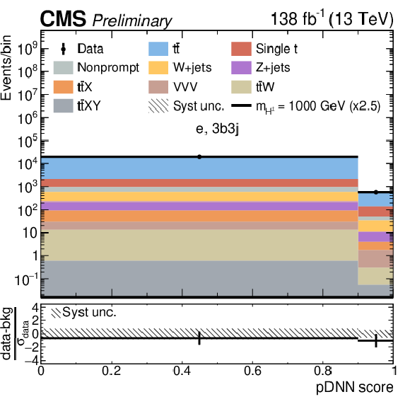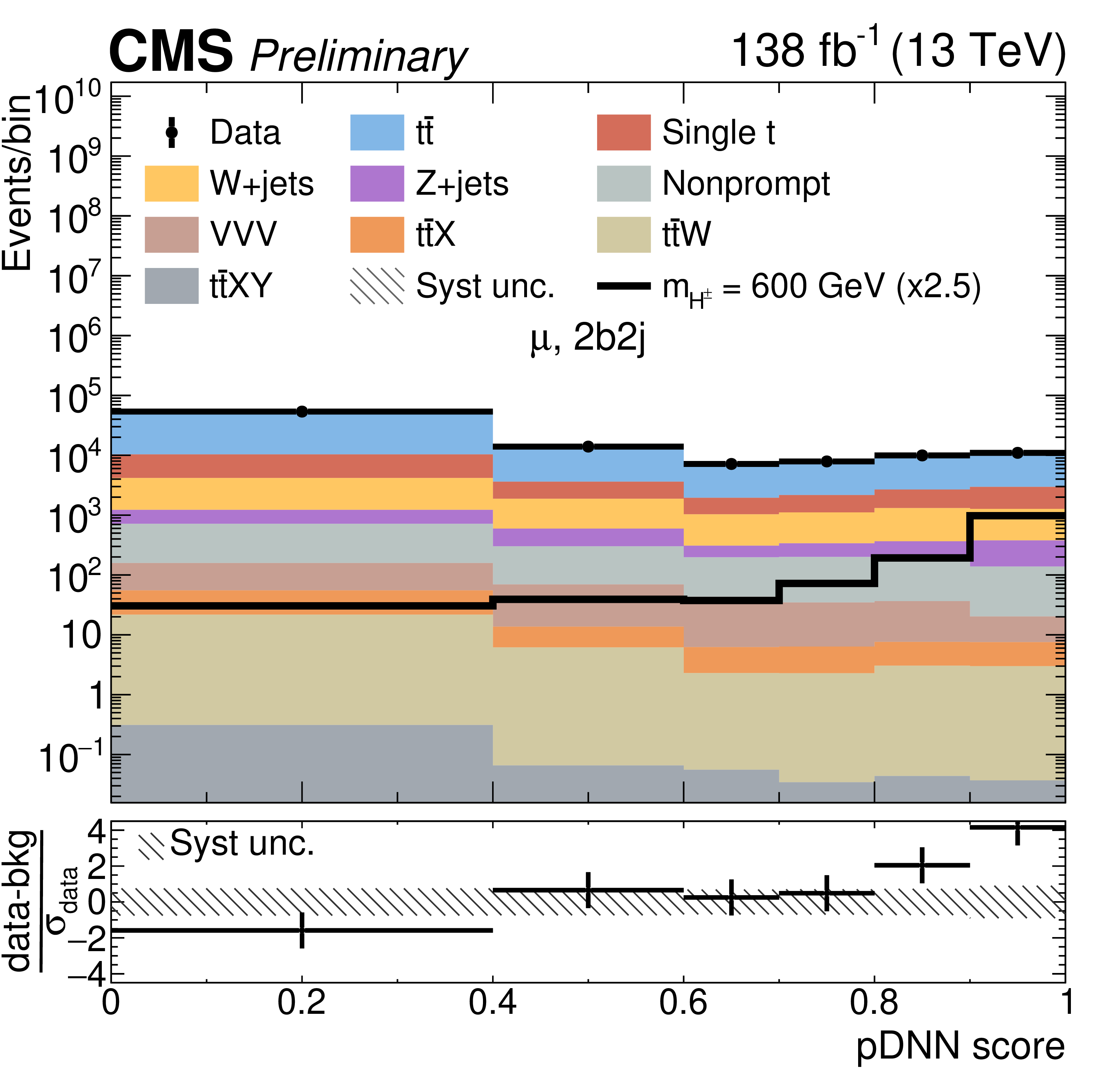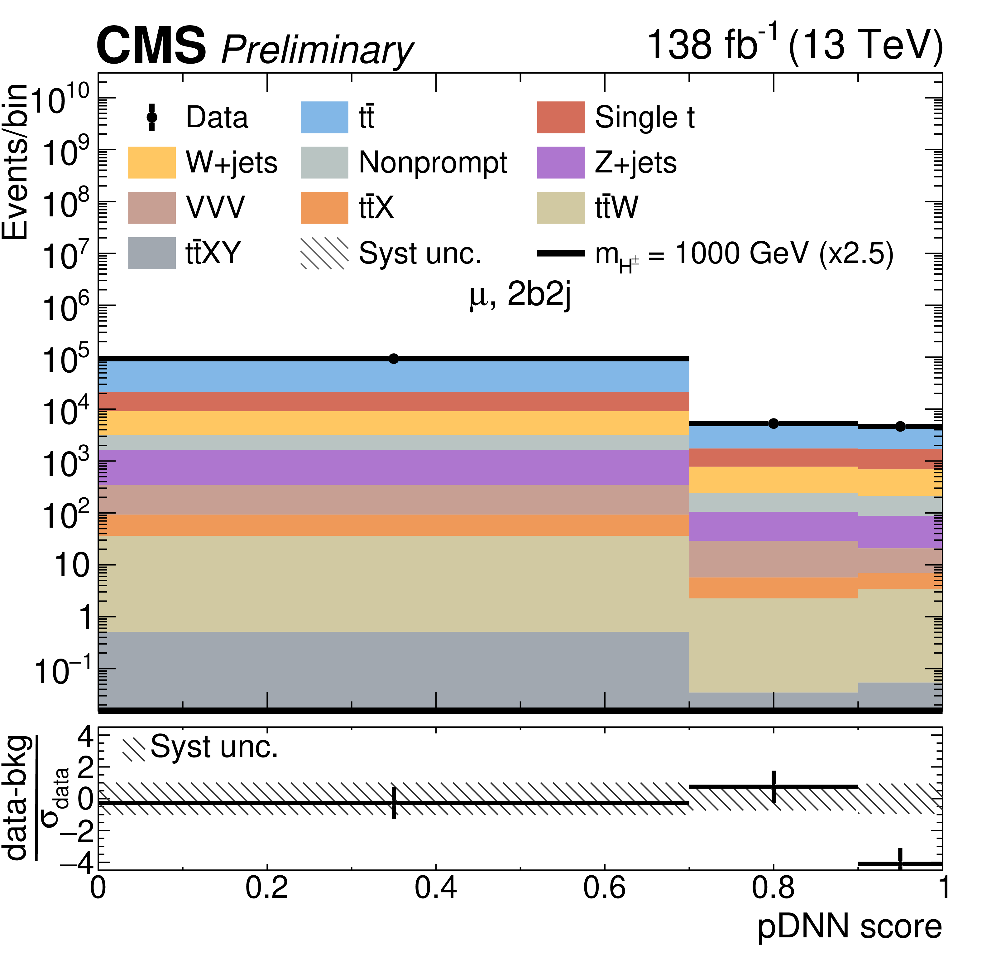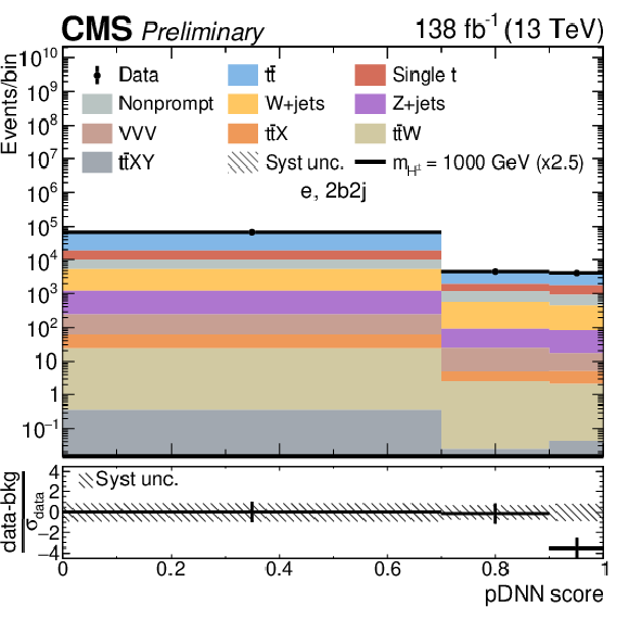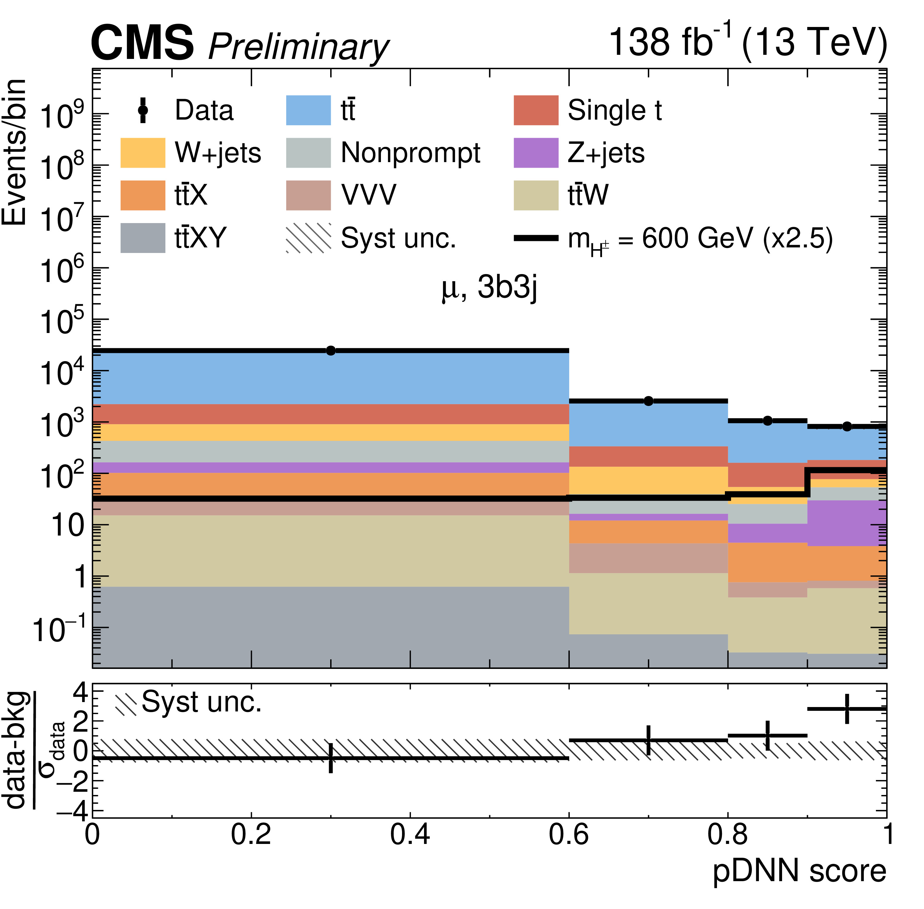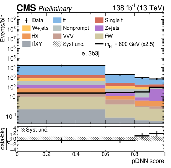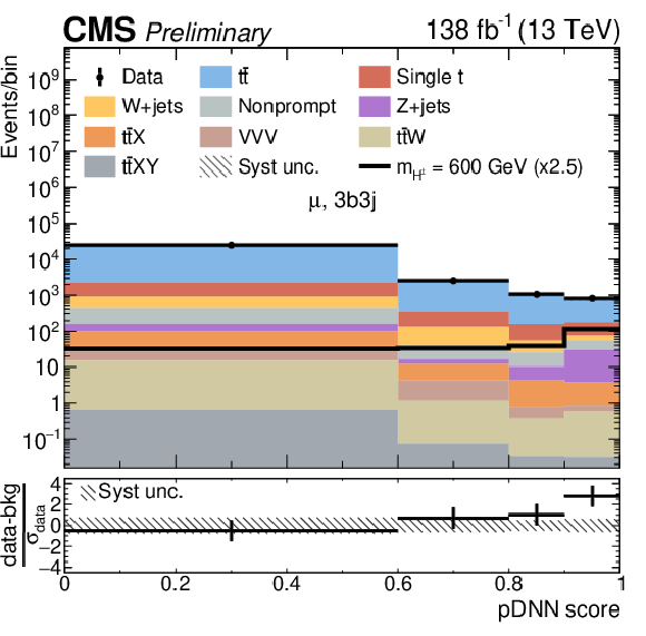The post-fit pDNN distributions in the SR 2b2j (upper) and 3b3j (lower) for electron (left) and muon (right) channels assuming $ m_{\mathrm{\widetilde{H}^{\pm}}}= $ 600 GeV using full Run 2 data. Predictions for the signal with $ m_{\mathrm{\widetilde{H}^{\pm}}}= $ 600 GeV, $ \rho_{tc}= $ 0.4, $ \rho_{tt}= $ 0.6 are shown. Beneath each plot the ratio of data to predictions is shown. The uncertainty bars in the ratio plots represent systematic uncertainties. |