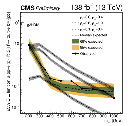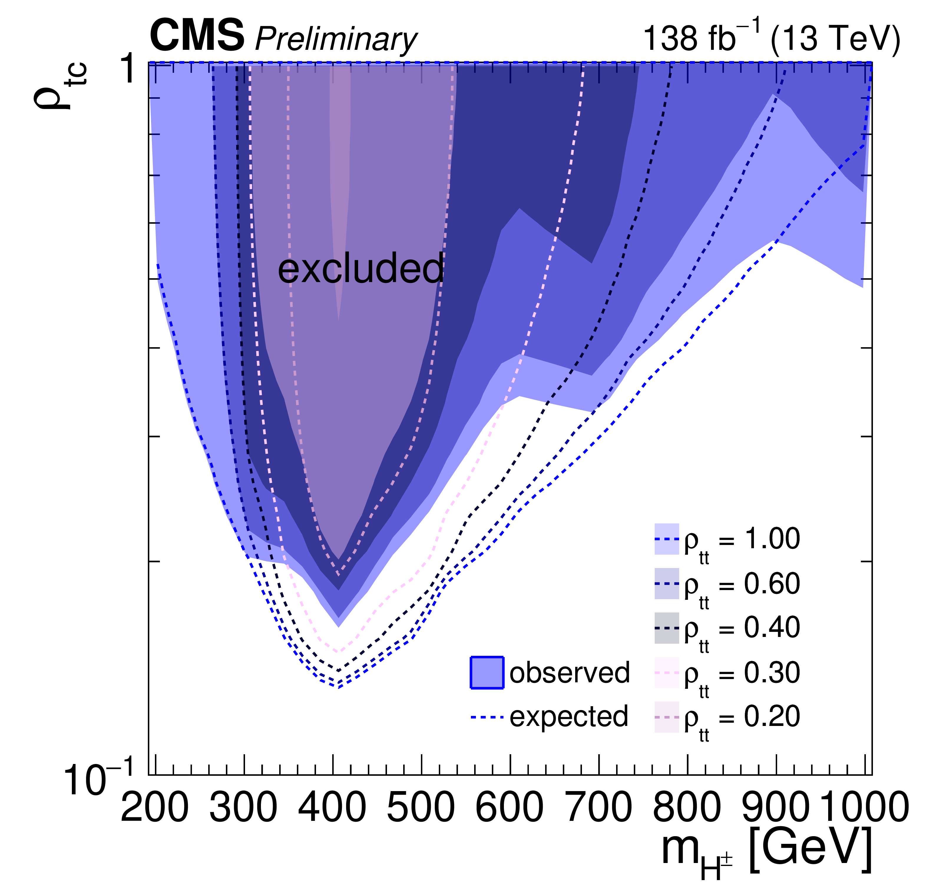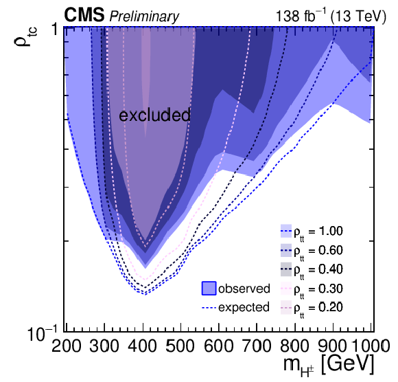 Observed (expected) excluded phase-space regions as a function of $ m_{\mathrm{\widetilde{H}^{\pm}}} $ and $ \rho_{\mathrm{t}\mathrm{c}} $ for various assumed $ \rho_{\mathrm{t}\mathrm{t}} $ values represented with different colors. The limits are extracted from the pDNN distributions based on g2HDM assuming all the extra Yukawa couplings except $ \rho_{\mathrm{t}\mathrm{t}} $ and $ \rho_{\mathrm{t}\mathrm{c}} $ are zero. The results are obtained from the 95% CL limits on the cross section times branching ratio in Fig 6. |