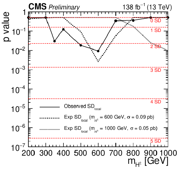 Observed and expected 95% CL limits on the cross section times branching ratio for different $ \mathrm{\widetilde{H}^{\pm}} $ mass hypotheses with $ \rho_{tc} = $ 0.4 and $ \rho_{tt} = $ 0.6 (left). The inner (green) band and the outer (yellow) band represent the regions containing 68% and 95%, respectively, of the distribution of limits expected under the background-only hypothesis. Theoretical prediction with different $ \rho_{tc} $ and $ \rho_{tt} $ couplings are shown with the grey bands representing the corresponding uncertainties for the QCD factorization and renormalization scales and the PDFs. Observed local significance (right) extracted from the pDNN distribution using the full Run 2 results. Expected significances are obtained with the injection of a $ \sigma=$ 0.09 (0.05) pb of g2HDM signal with $ m_{\mathrm{\widetilde{H}^{\pm}}}= $ 600 GeV (1 TeV) $. The injected cross sections are picked as the best fit value for $ m_{\mathrm{\widetilde{H}^{\pm}}}= $ 600 GeV, and the theoretical prediction for $ m_{\mathrm{\widetilde{H}^{\pm}}}= $ 1 TeV assuming $ \rho_{tc,tt}= $ 0.6. |