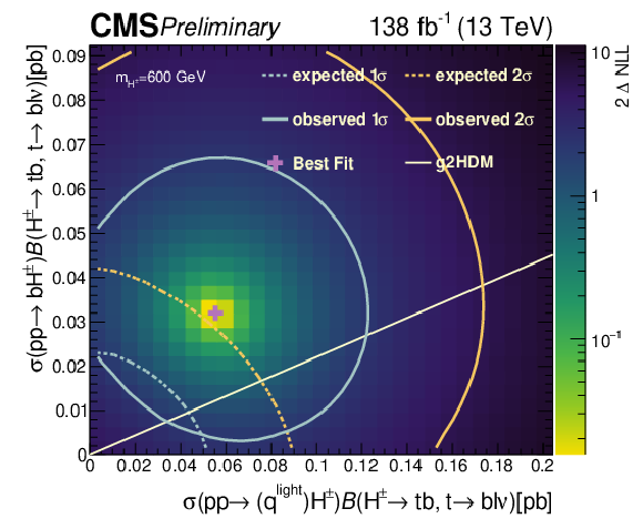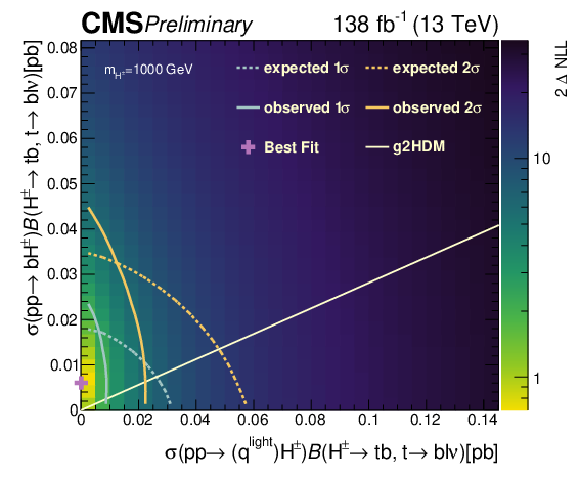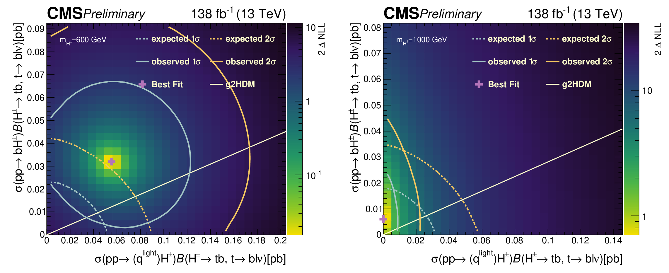 Two times the difference of the negative log-likelihood (NLL) as a function of $ \sigma(\mathrm{p}\mathrm{p}\to(\mathrm{q}^\text{light})\mathrm{H}^\pm)\mathcal{B}(\mathrm{H}^\pm\to\mathrm{t}\mathrm{b}, {\mathrm{t}\to\mathrm{b} \text{l}\nu}) $ and $ \sigma(\mathrm{p}\mathrm{p}\to\mathrm{b}\mathrm{H}^\pm)\mathcal{B}(\mathrm{H}^\pm\to\mathrm{t}\mathrm{b}, {\mathrm{t}\to\mathrm{b} \text{l}\nu}) $ with the best fit point extracted from the pDNN distribution for the signal mass $ m_{\mathrm{\widetilde{H}^{\pm}}} = $ 600 GeV (left), and $ m_{\mathrm{\widetilde{H}^{\pm}}} = $ 1000 GeV (right) using all data-taking periods. The SM and the g2HDM predictions are also shown. The points along the g2HDM prediction line represent different $ \rho_{\mathrm{t}\mathrm{t}} $, $ \rho_{\mathrm{t}\mathrm{c}} $ coupling sets, with all other extra Yukawa couplings assumed to be zero. |