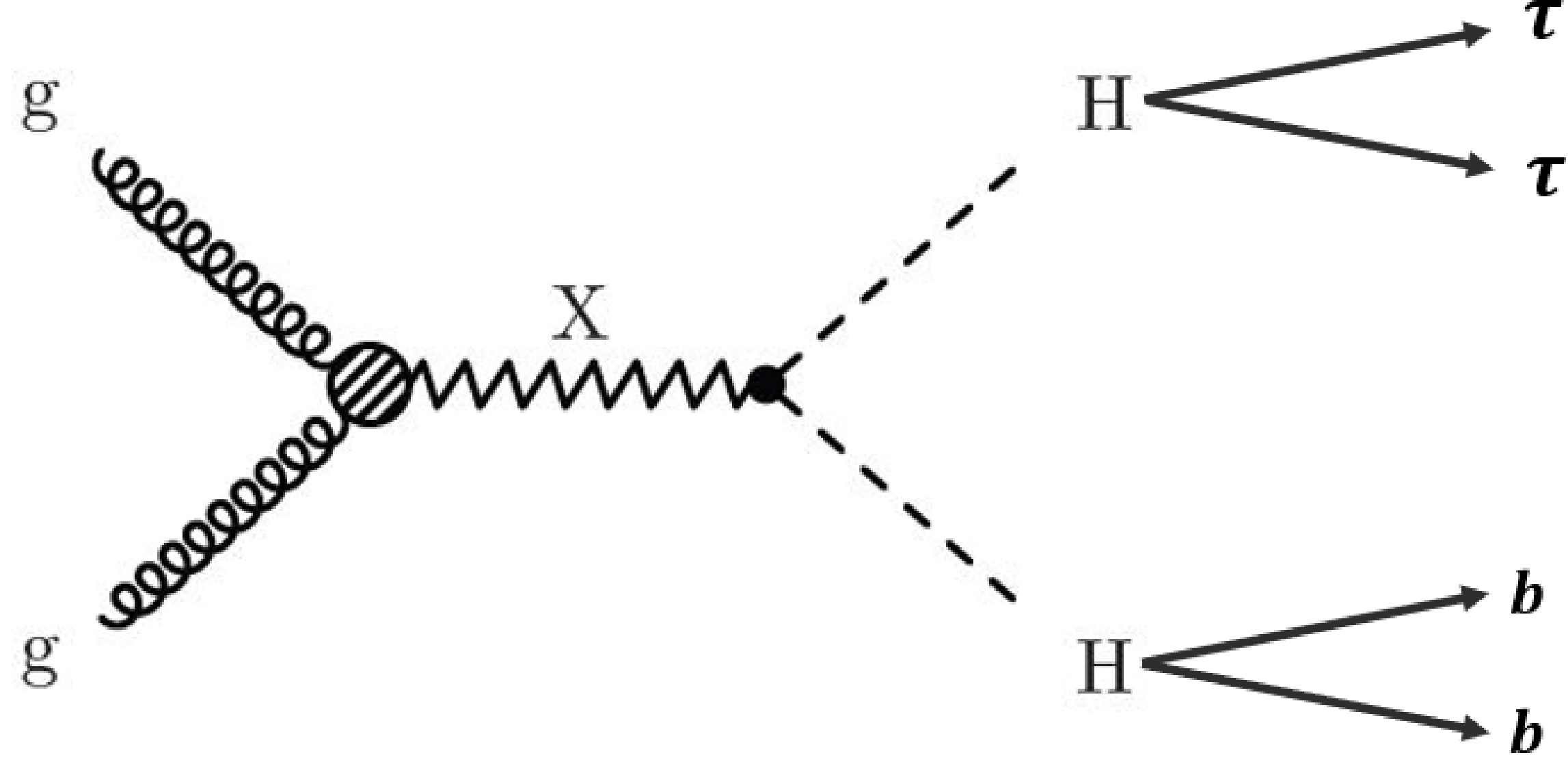 Representative Feynman diagram for the production of either a spin-0 radion or a spin-2 graviton X, which decays into two SM Higgs bosons. The Higgs boson pairs decay into a $ \mathrm{b}\overline{\mathrm{b}} \tau^+\tau^- $ final state. |