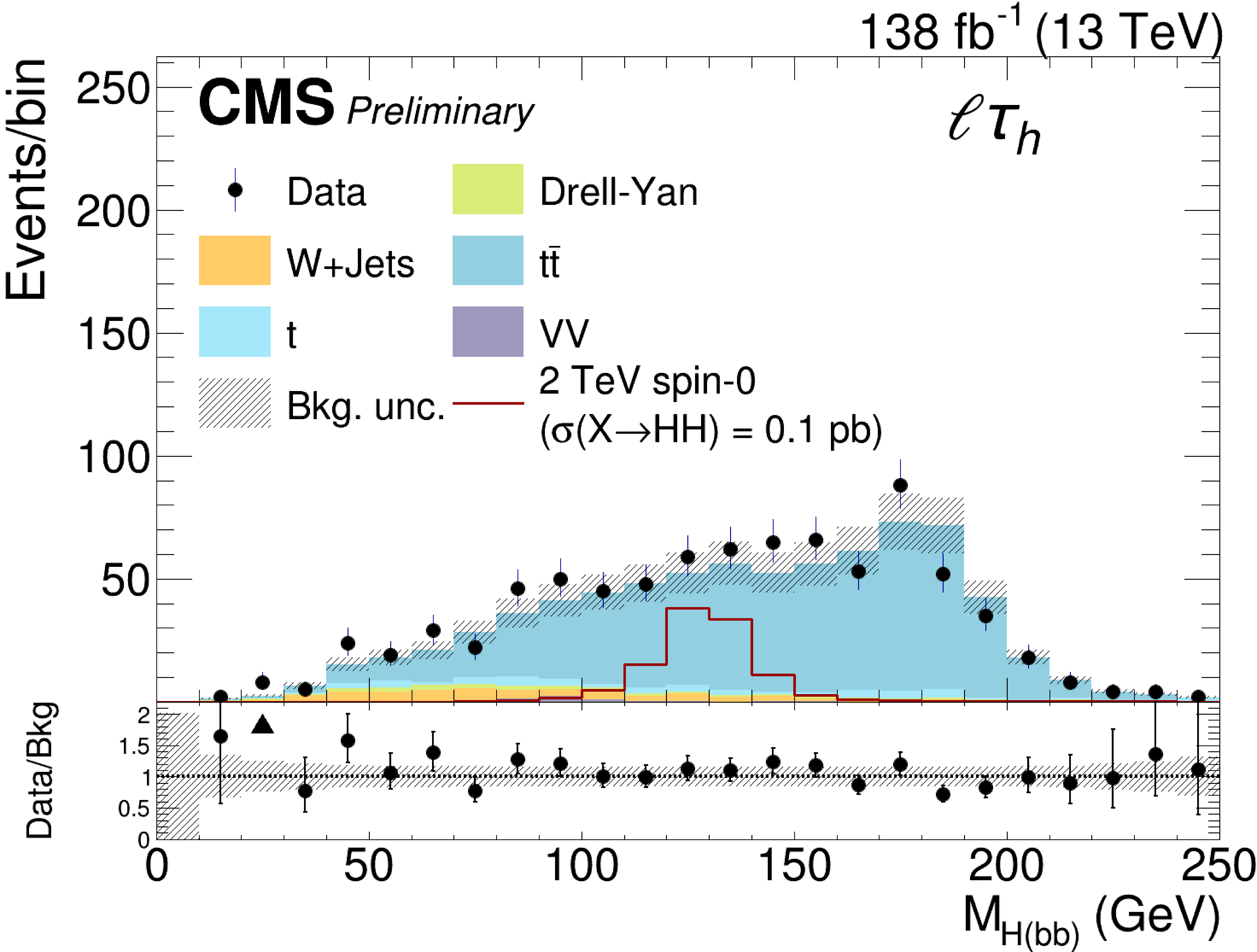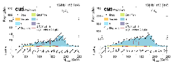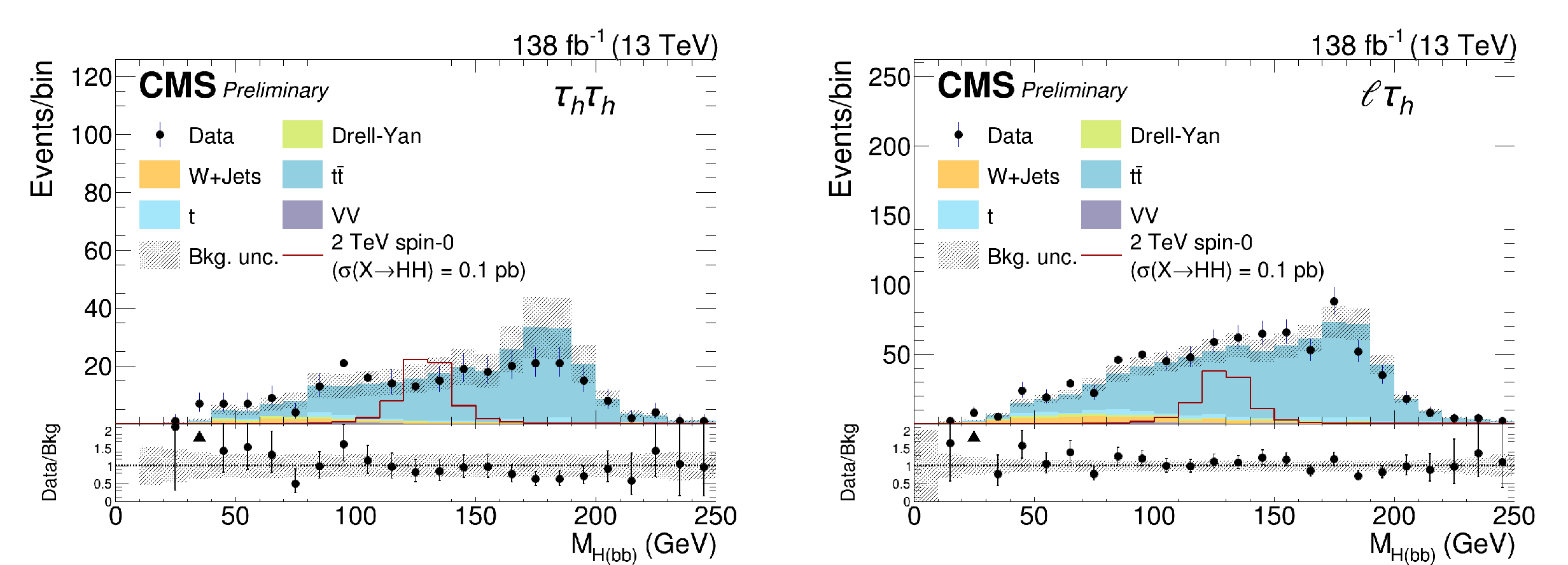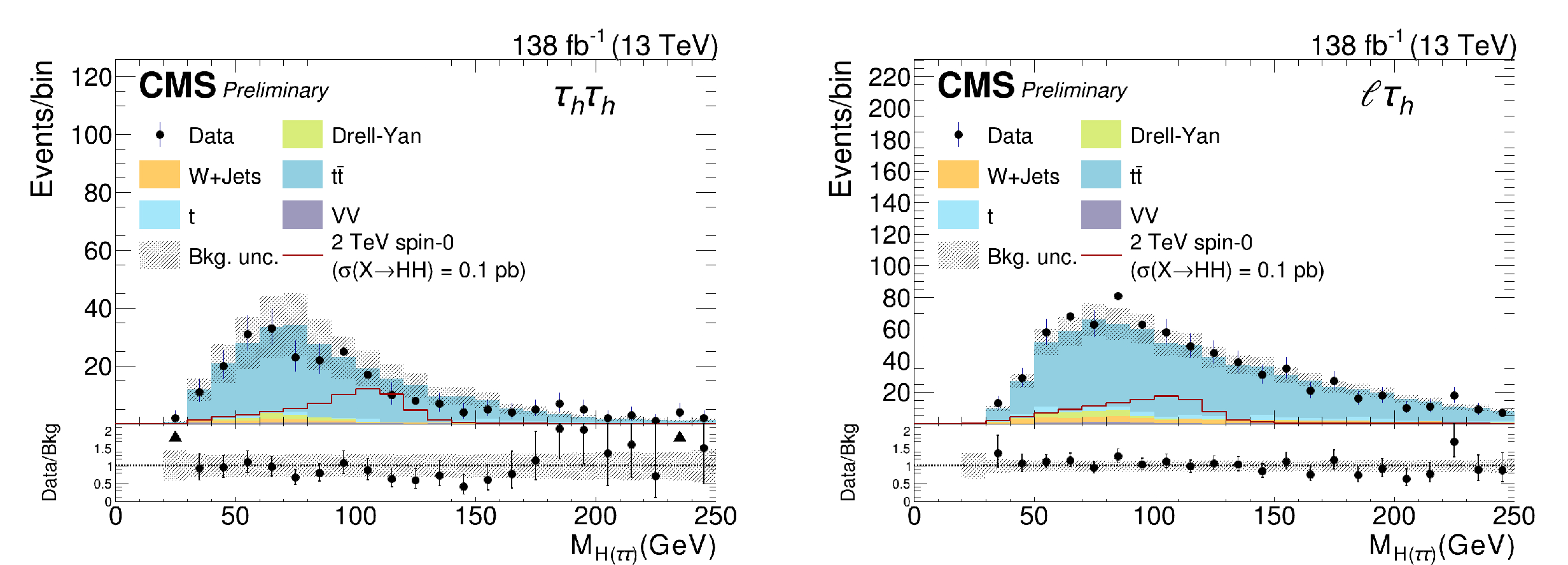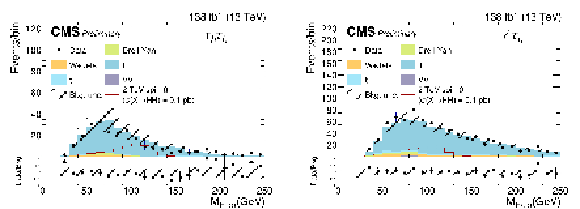Invariant mass ($ \mathrm{M}_\mathrm{H(bb)} $) of the leading AK8 jet (obtained from ParticleNet regression) in the event after the full event selection. The signal region (SR) is defined as 100 GeV $ \leq \mathrm{M} _ \mathrm{H(bb)} \leq $ 150 GeV. Sideband (SB) regions are defined on either side of the SR. $ \tau_h\tau_h $ channel is shown on the left and $ \ell\tau_h $ channel on the right. The data are compared with simulation, and the grey uncertainty bands in the plot represent postfit uncertainties of a few prominent parameters in the fit along with statistical uncertainties. |