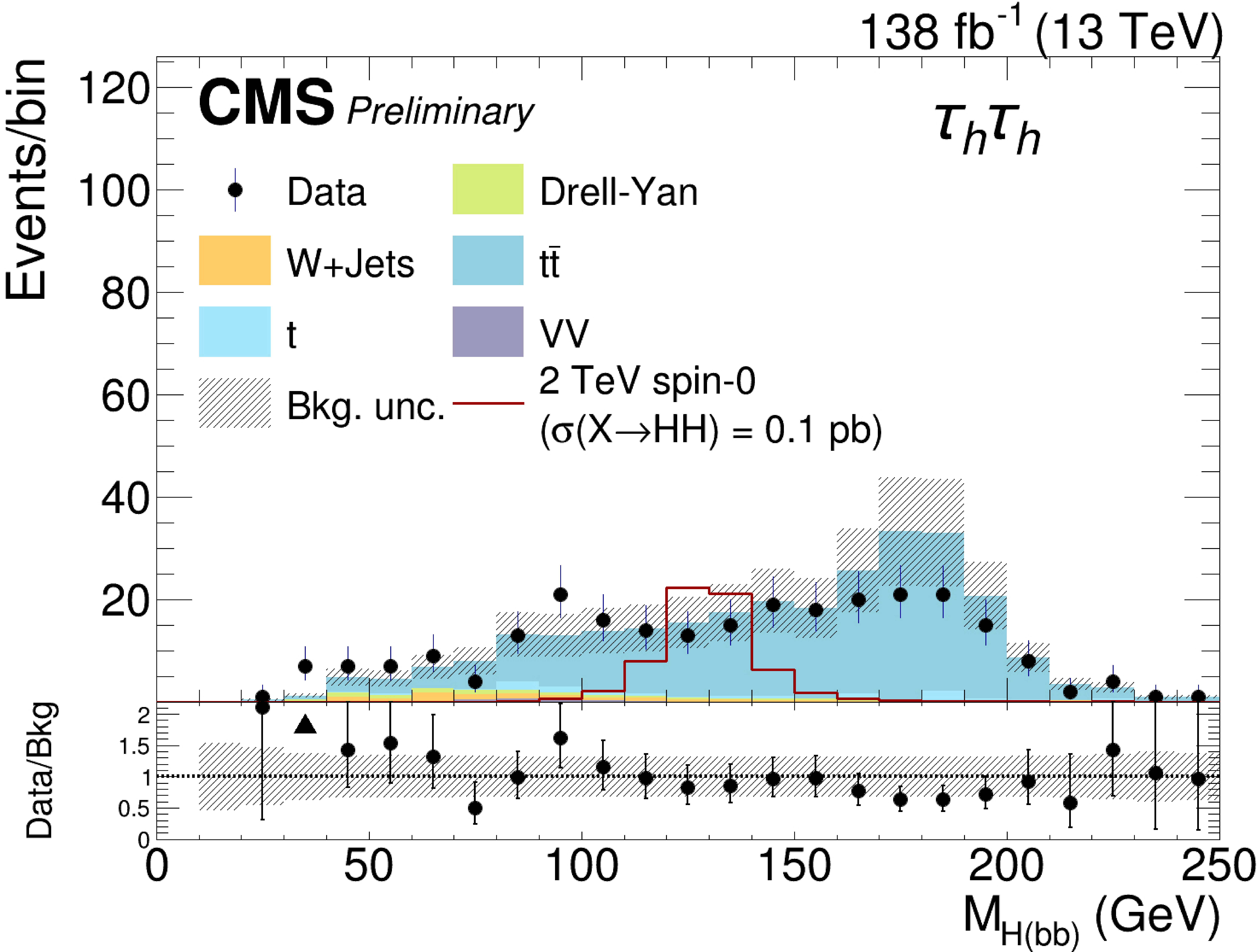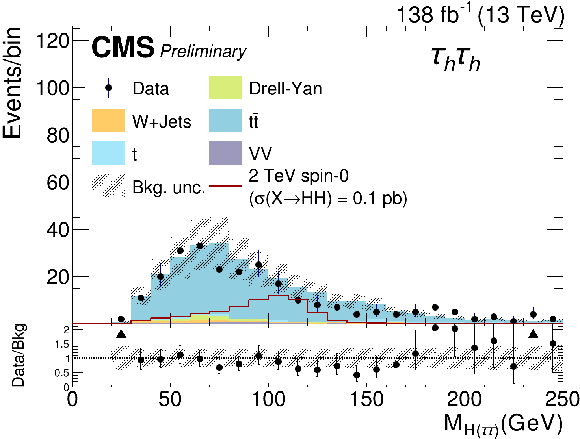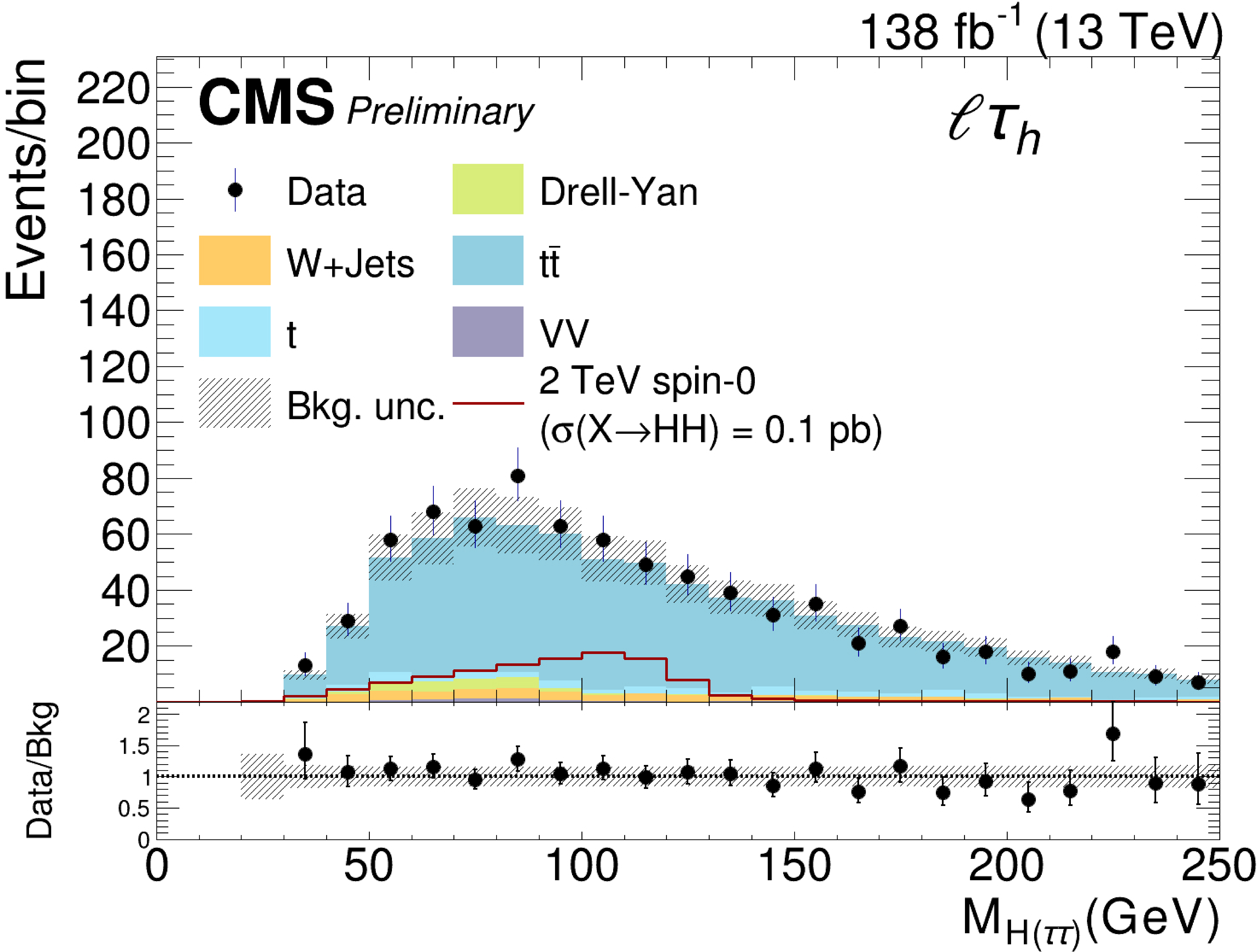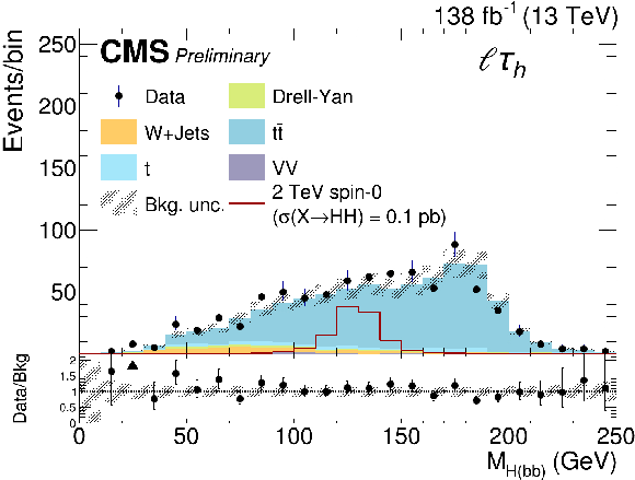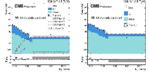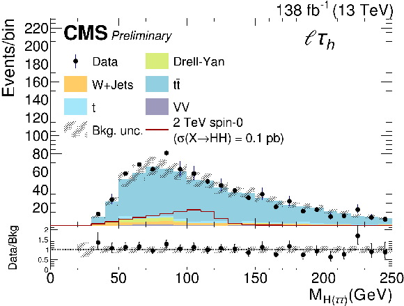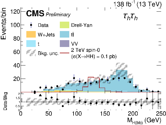 Invariant mass ($ \mathrm{M}_\mathrm{H(bb)} $) of the leading AK8 jet (obtained from ParticleNet regression) in the event after the full event selection. The signal region (SR) is defined as 100 GeV $ \leq \mathrm{M} _ \mathrm{H(bb)} \leq $ 150 GeV. Sideband (SB) regions are defined on either side of the SR. $ \tau_h\tau_h $ channel is shown on the left and $ \ell\tau_h $ channel on the right. The data are compared with simulation, and the grey uncertainty bands in the plot represent postfit uncertainties of a few prominent parameters in the fit along with statistical uncertainties. |