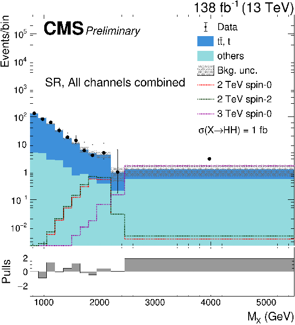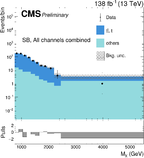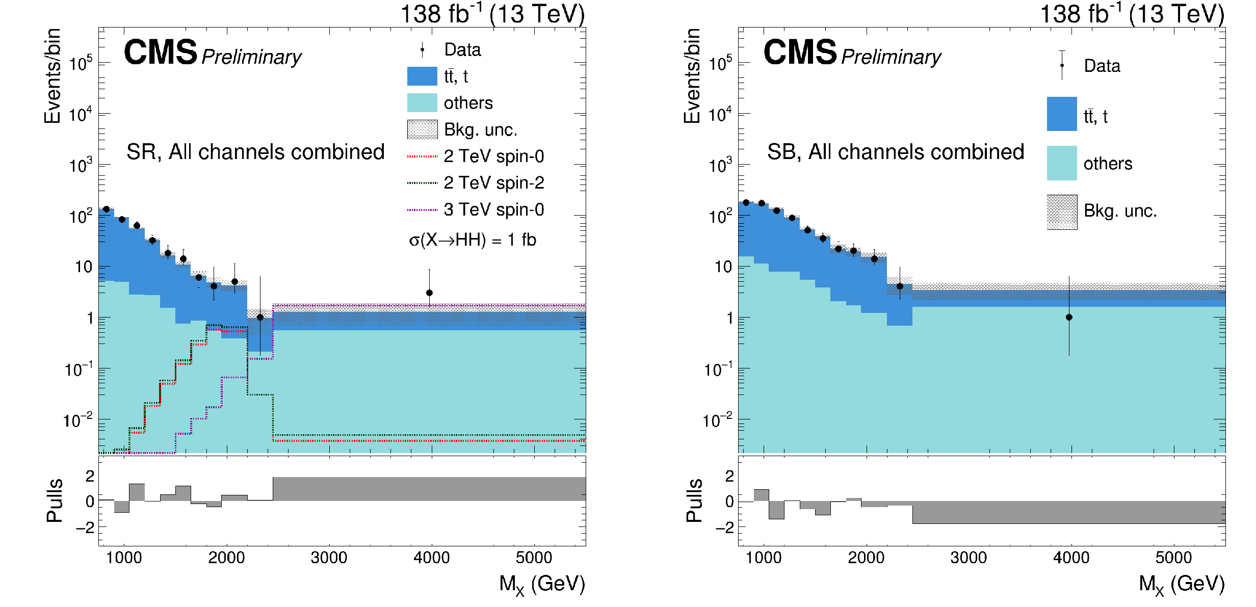 Post-fit reconstructed mass distribution of resonance X ($ \text{M}_\text{X} $) in the SR (left) and SB (right) after applying the complete selection criteria. The plots correspond to the merged $ \tau_h\tau_h $ and $ \ell\tau_h $ channels. Minor background contributions are grouped into a single category labeled as others. |