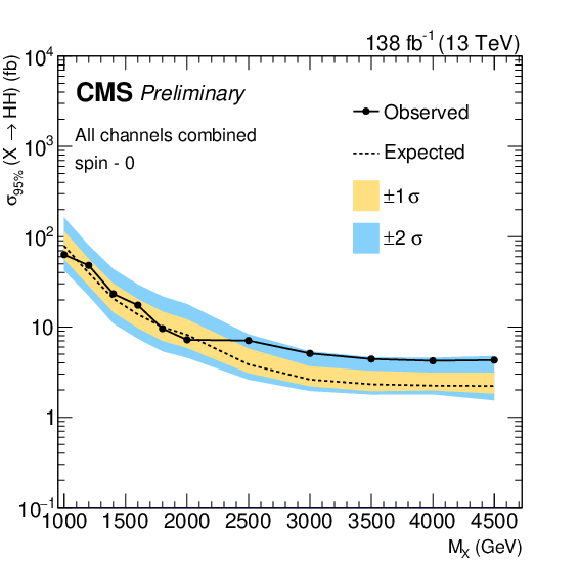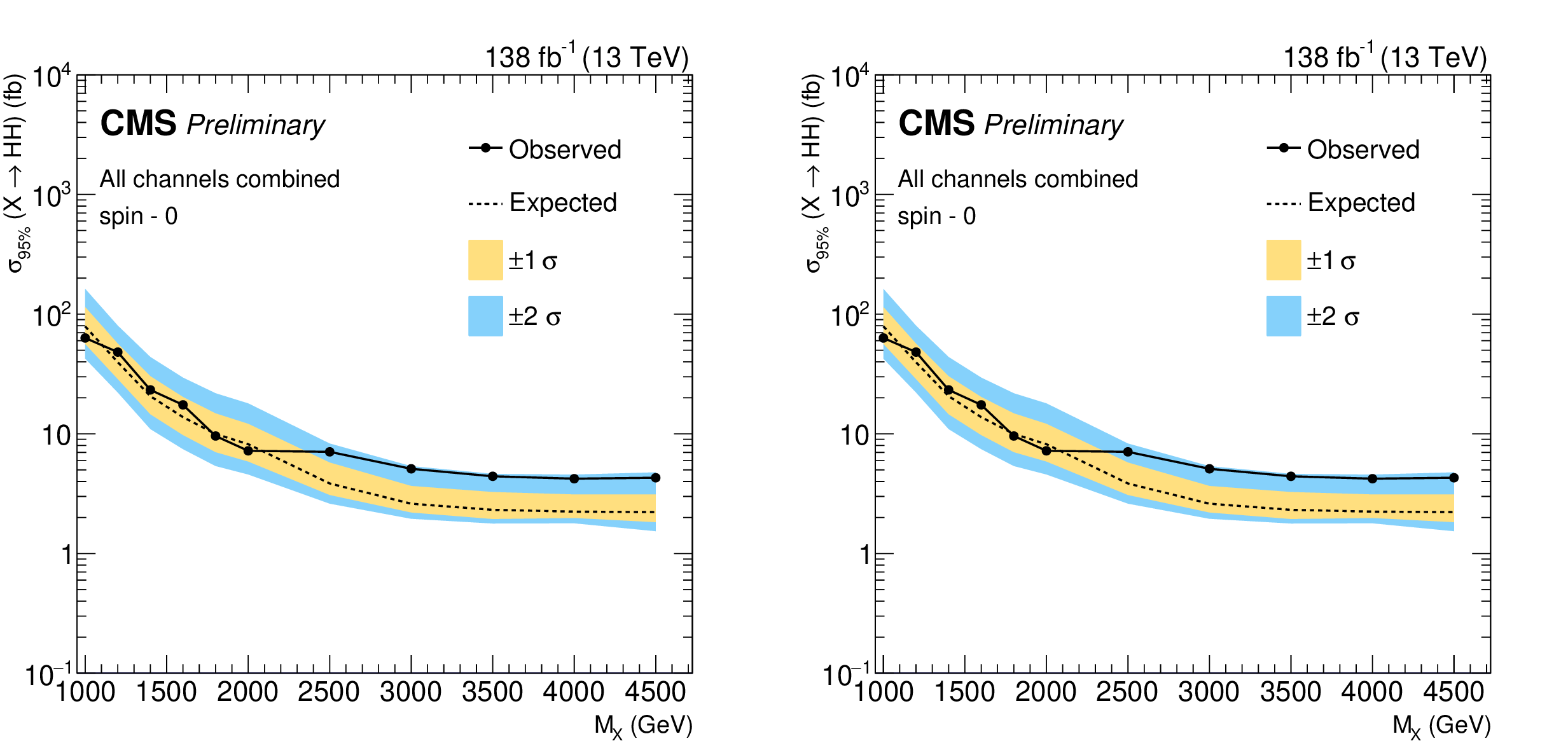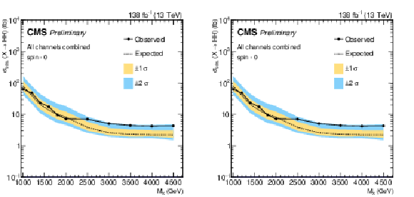 Expected and observed upper limits at 95% CL on the production cross section of resonant HH production for a spin-0 (left) and spin-2 (right) narrow resonance hypothesis. |