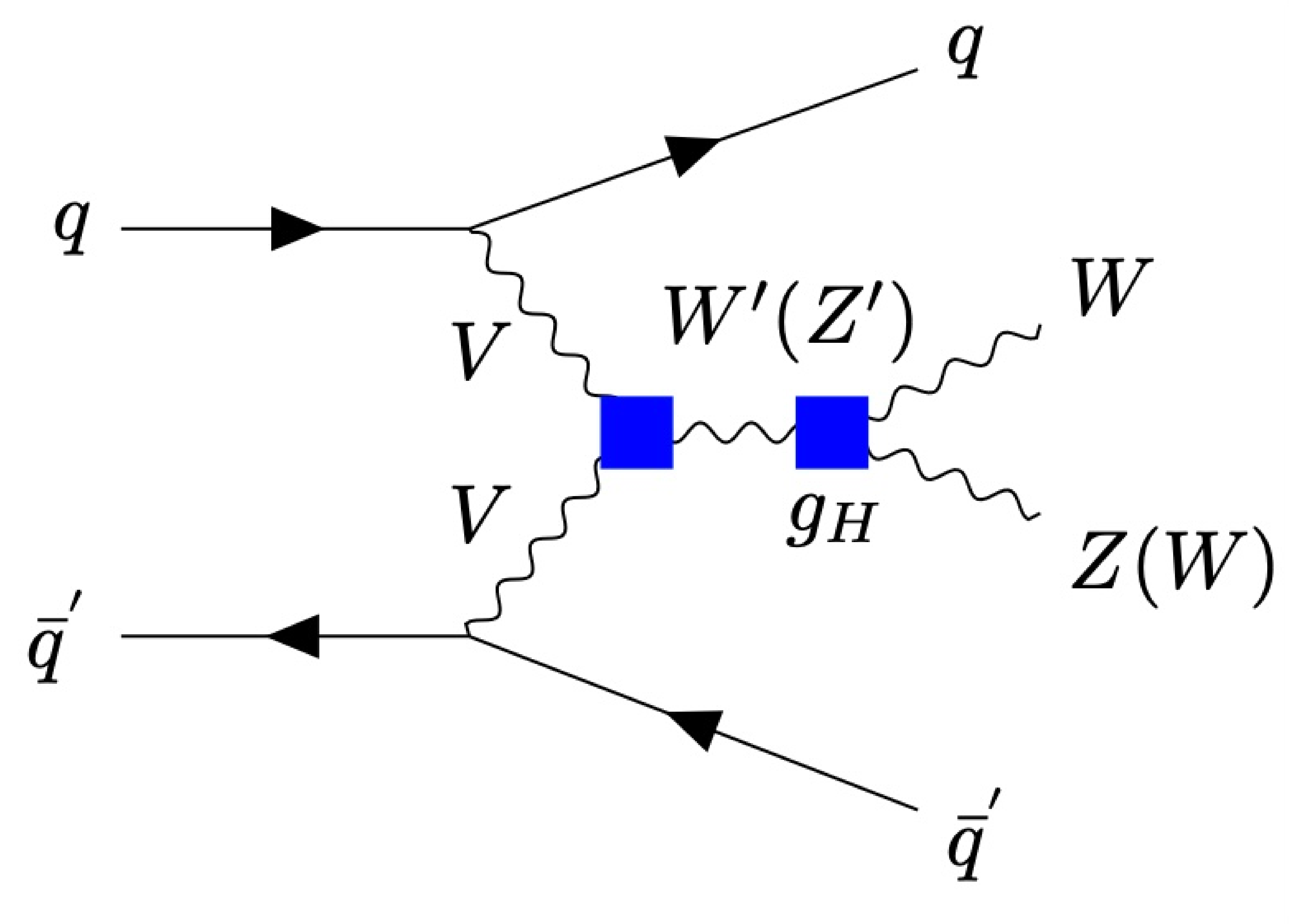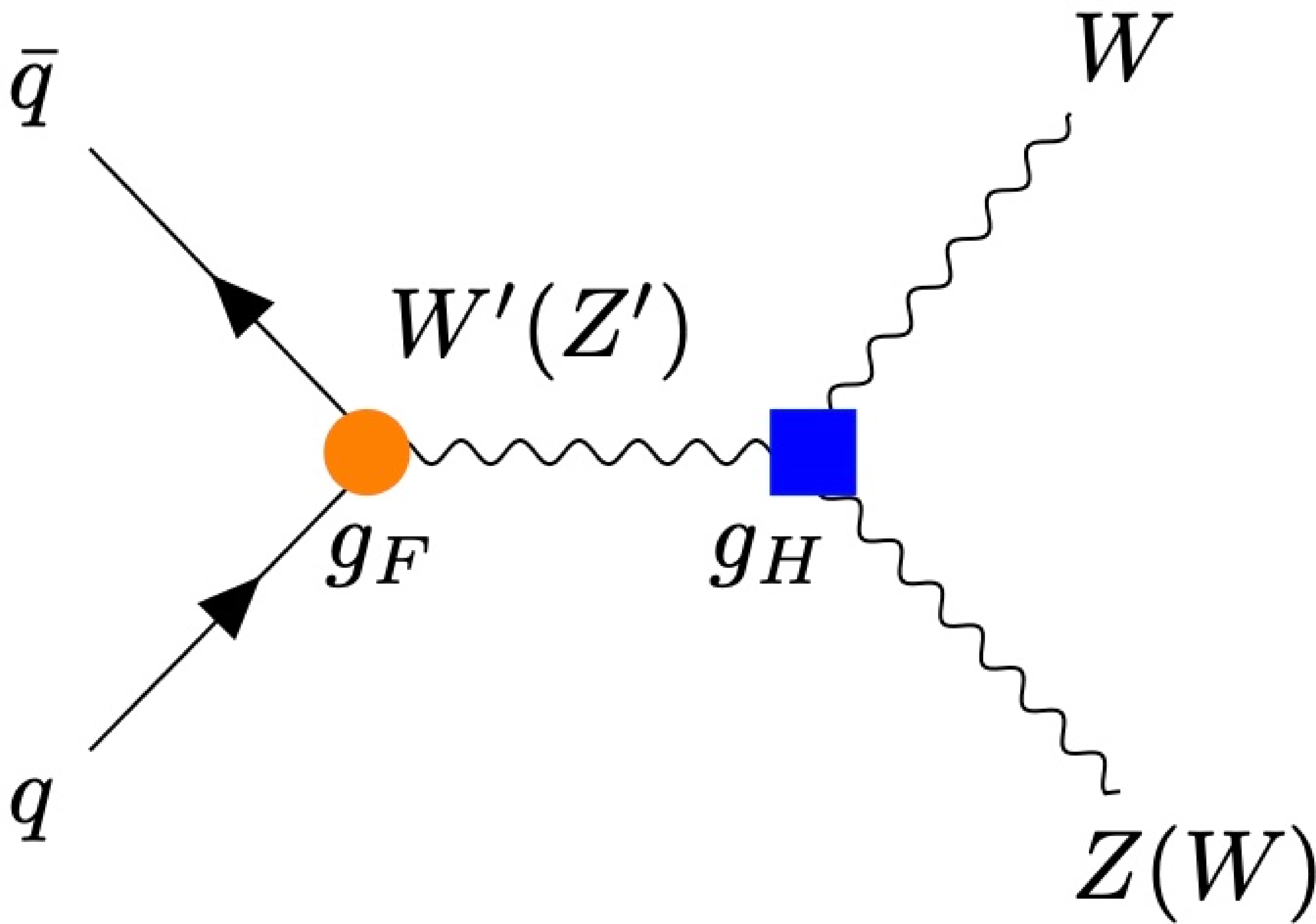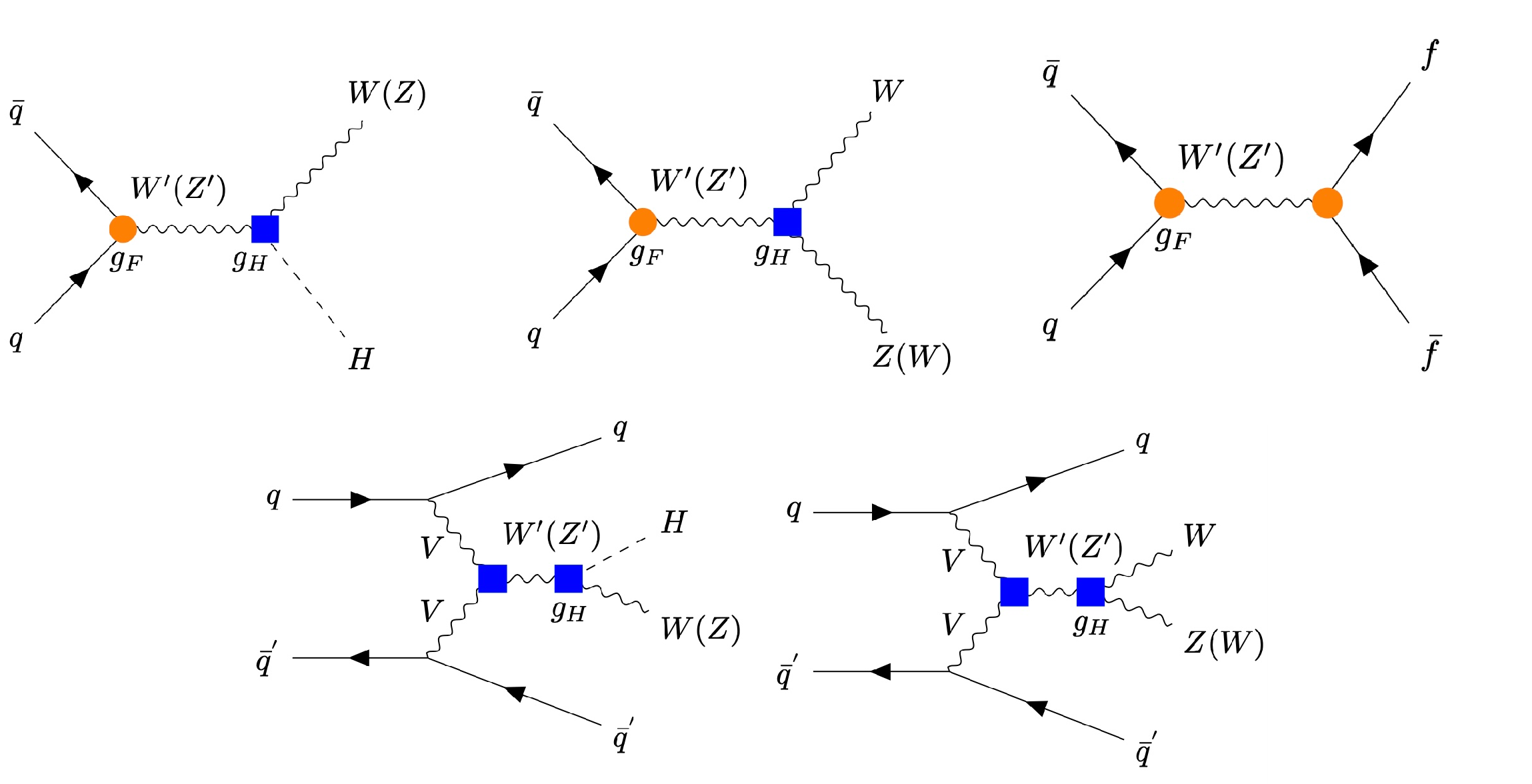 Feynman diagrams for the production and decay of Z' and W' bosons via the Drell--Yan process (upper row) and the VBF process (lower row). The W' (Z') boson decays to WH (ZH) (upper left, lower left), WZ (WW) (upper middle, lower right), and fermion-antifermion pairs (upper right). |