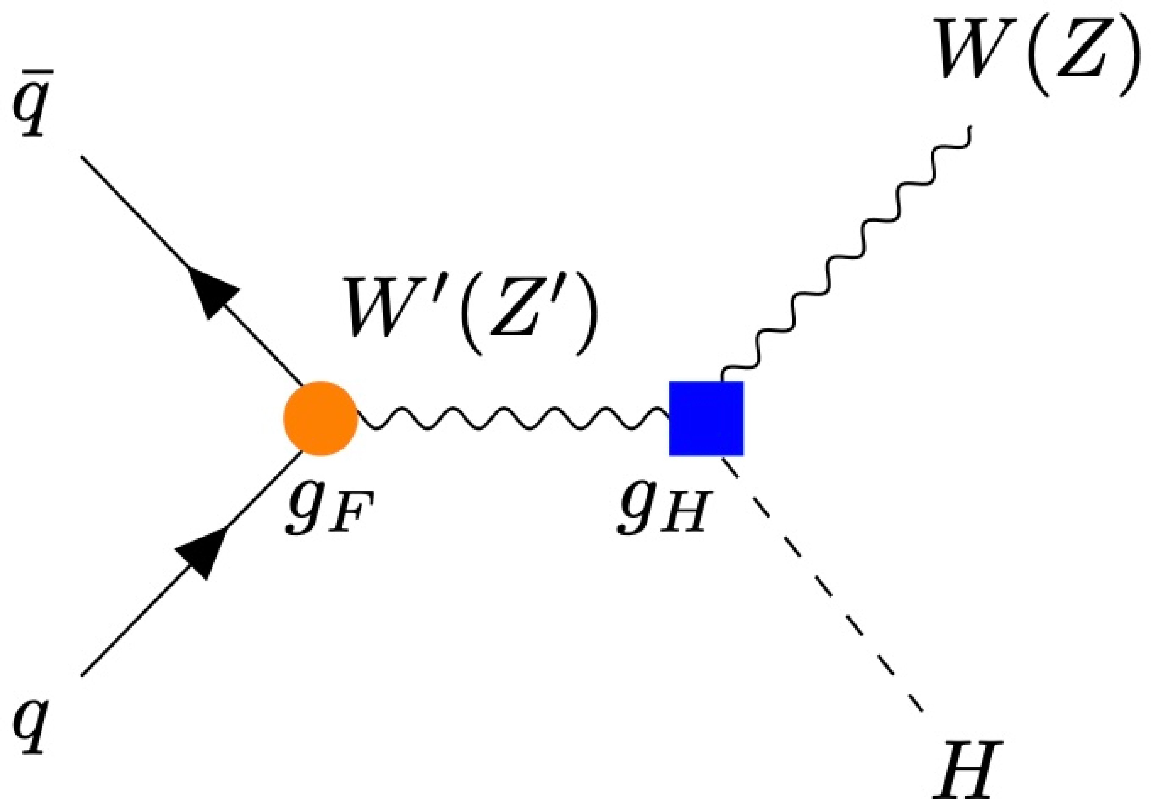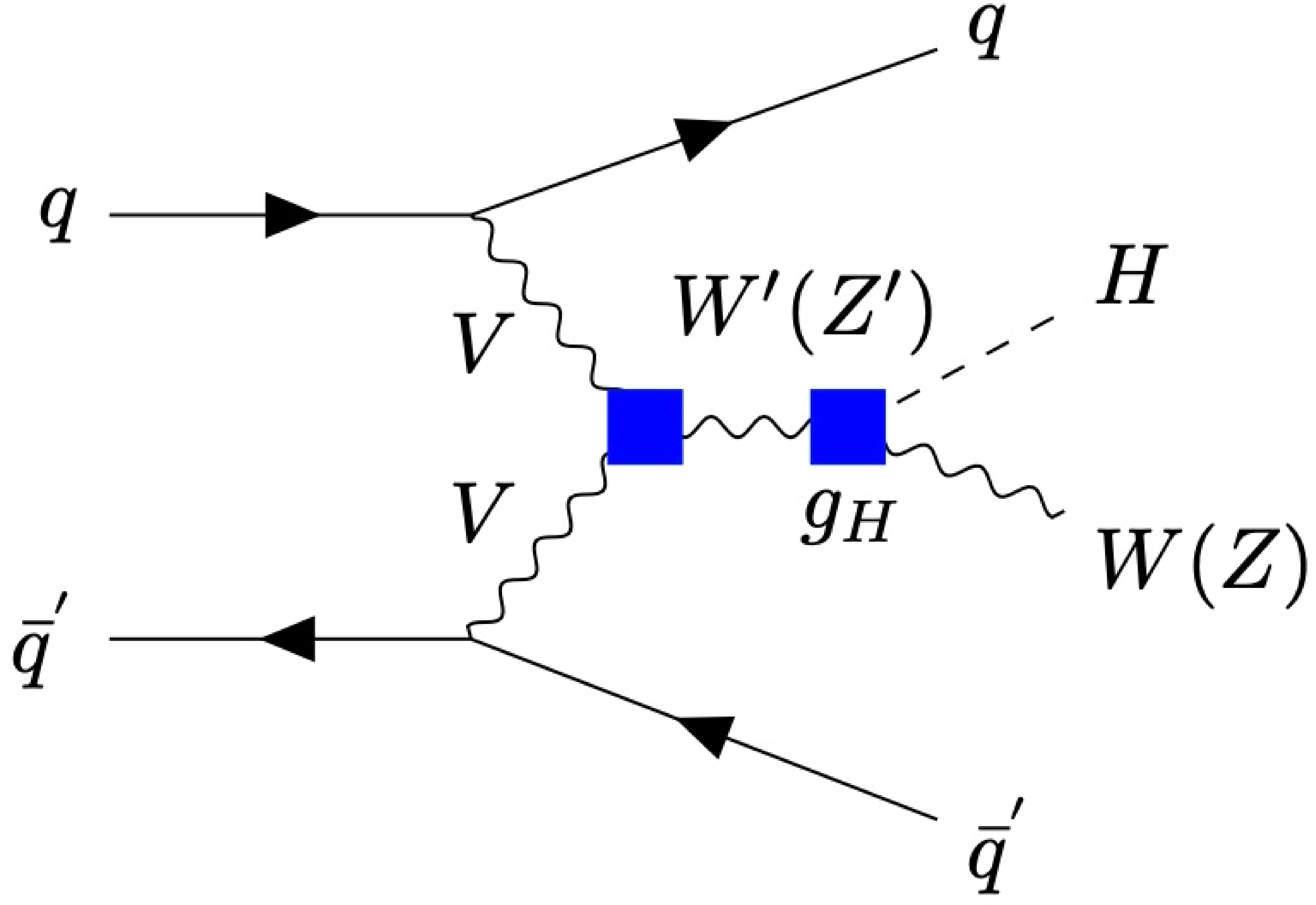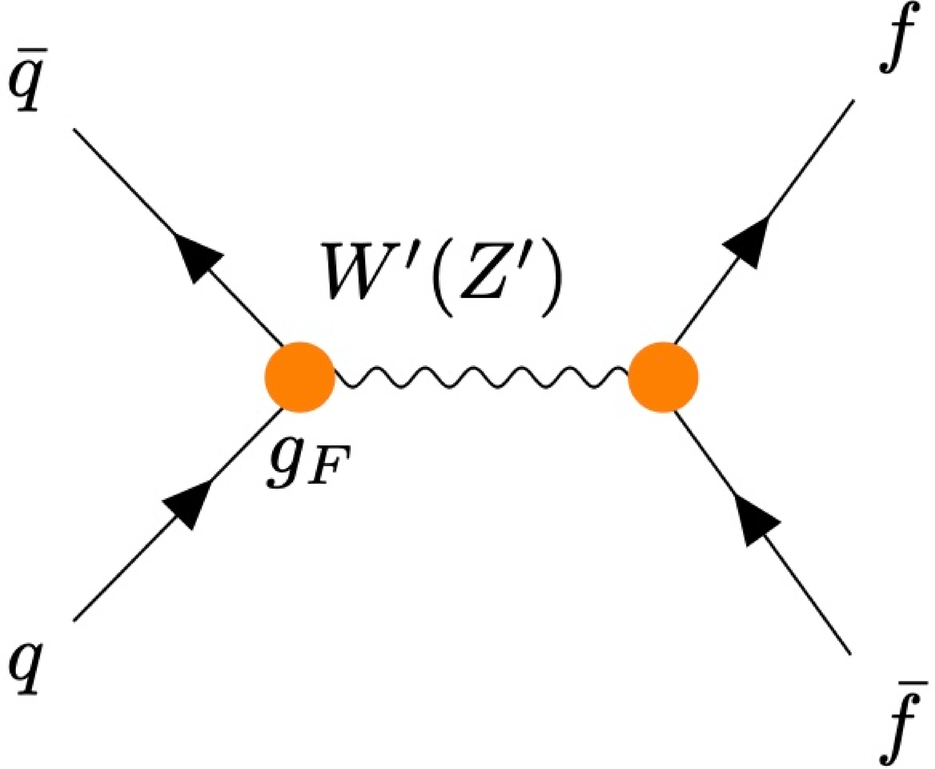 Feynman diagrams for the production and decay of Z' and W' bosons via the Drell--Yan process (upper row) and the VBF process (lower row). The W' (Z') boson decays to WH (ZH) (upper left, lower left), WZ (WW) (upper middle, lower right), and fermion-antifermion pairs (upper right). |
