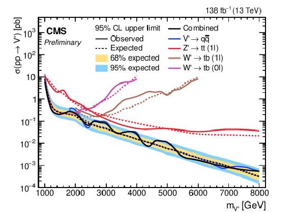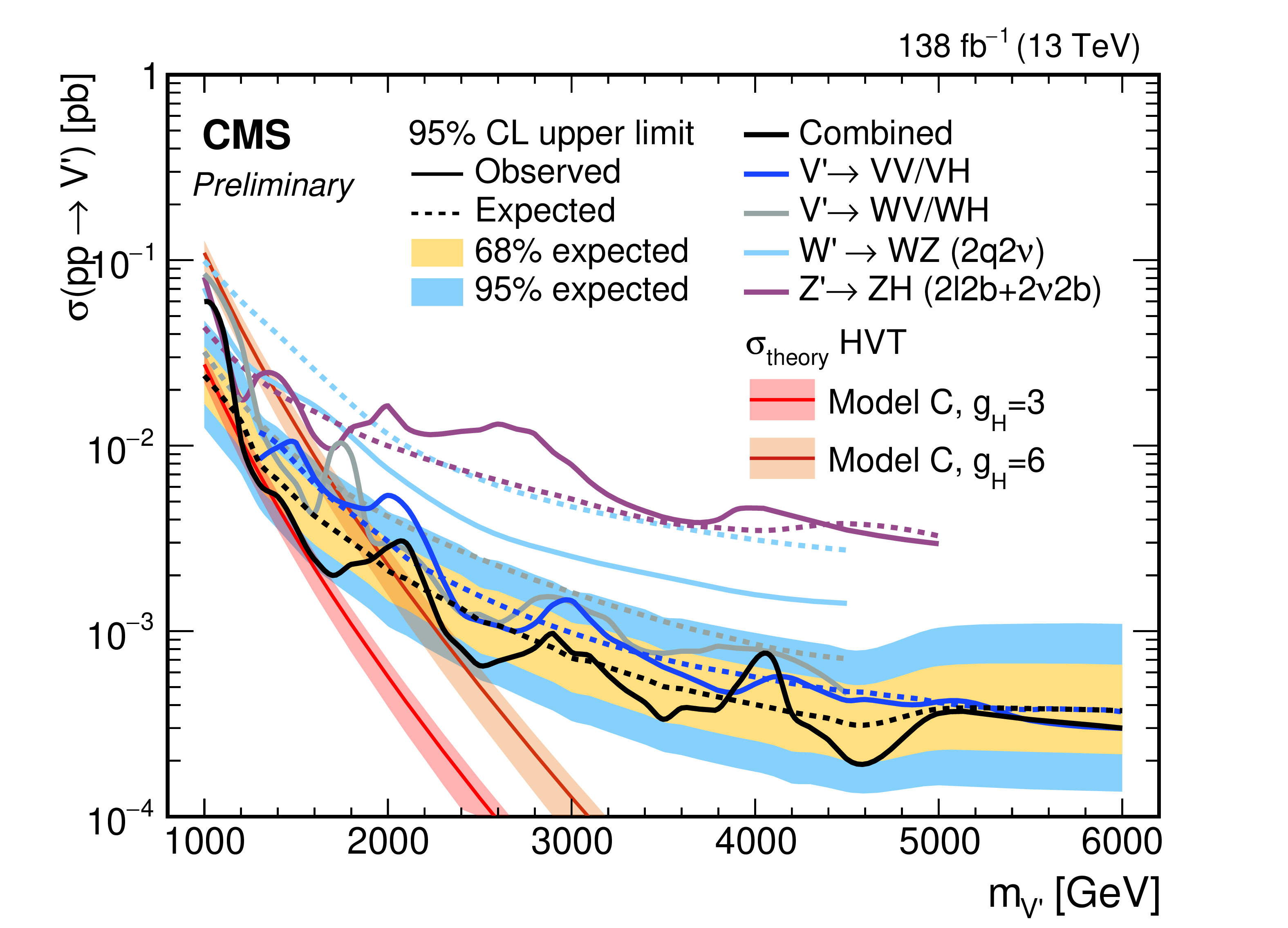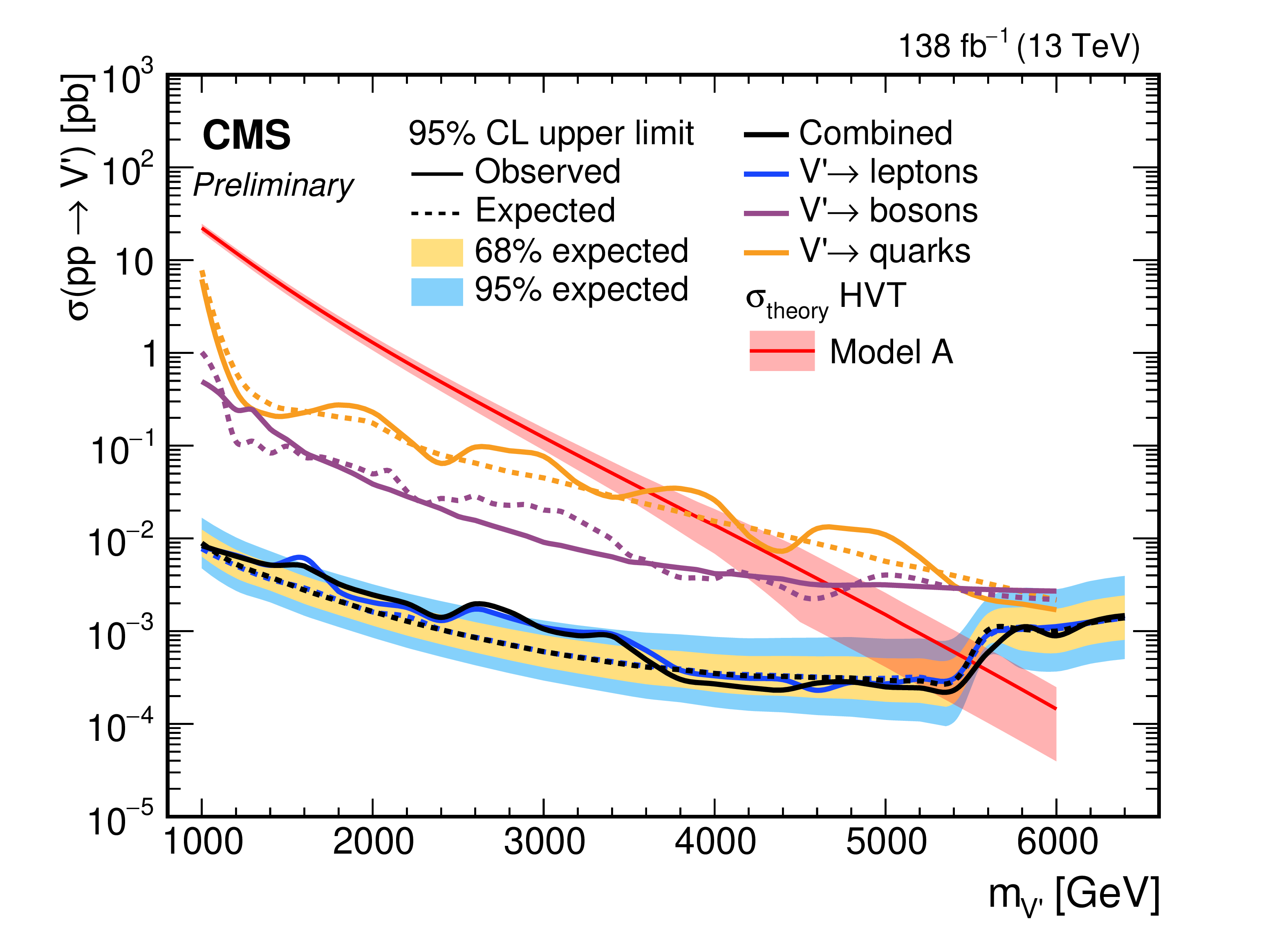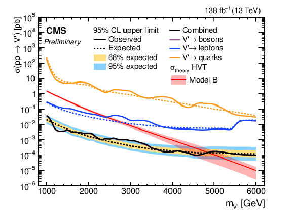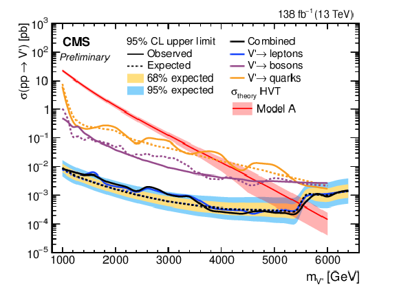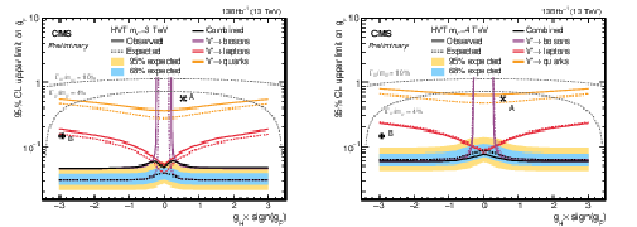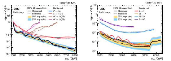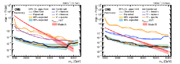 Expected and observed 95% CL upper limits on the V' production cross section as a function of the resonance mass $ m_{\mathrm{V}'} $ shown separately for the quarkonic (left) and leptonic (right) final states. The limits are evaluated under the HVT model A scenario. |