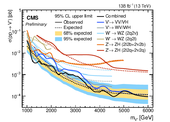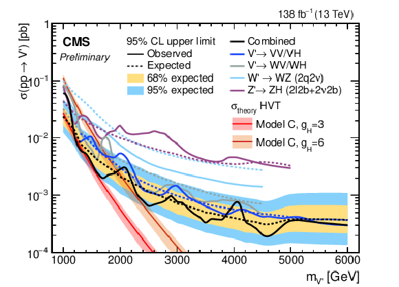 Expected and observed 95% CL upper limits on the V' production cross section as a function of the resonance mass $ m_{\mathrm{V}'} $ shown separately for the bosonic final states. The limits are evaluated under the HVT model B scenario. |