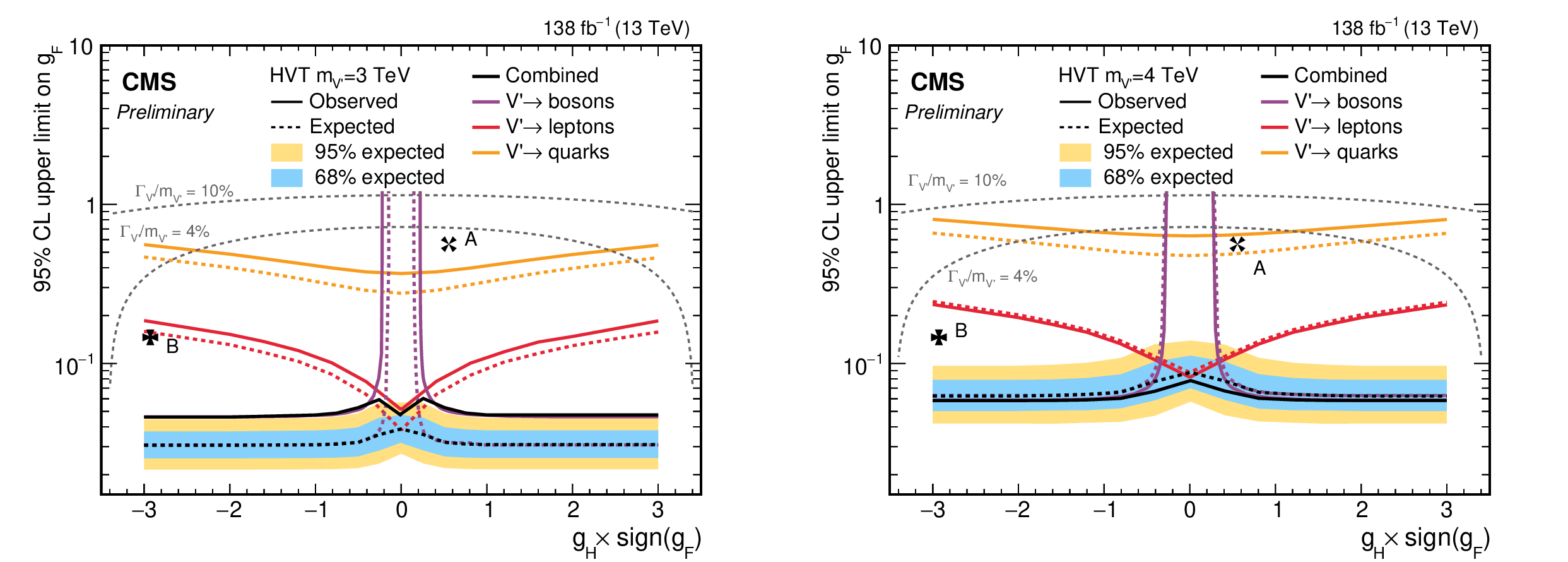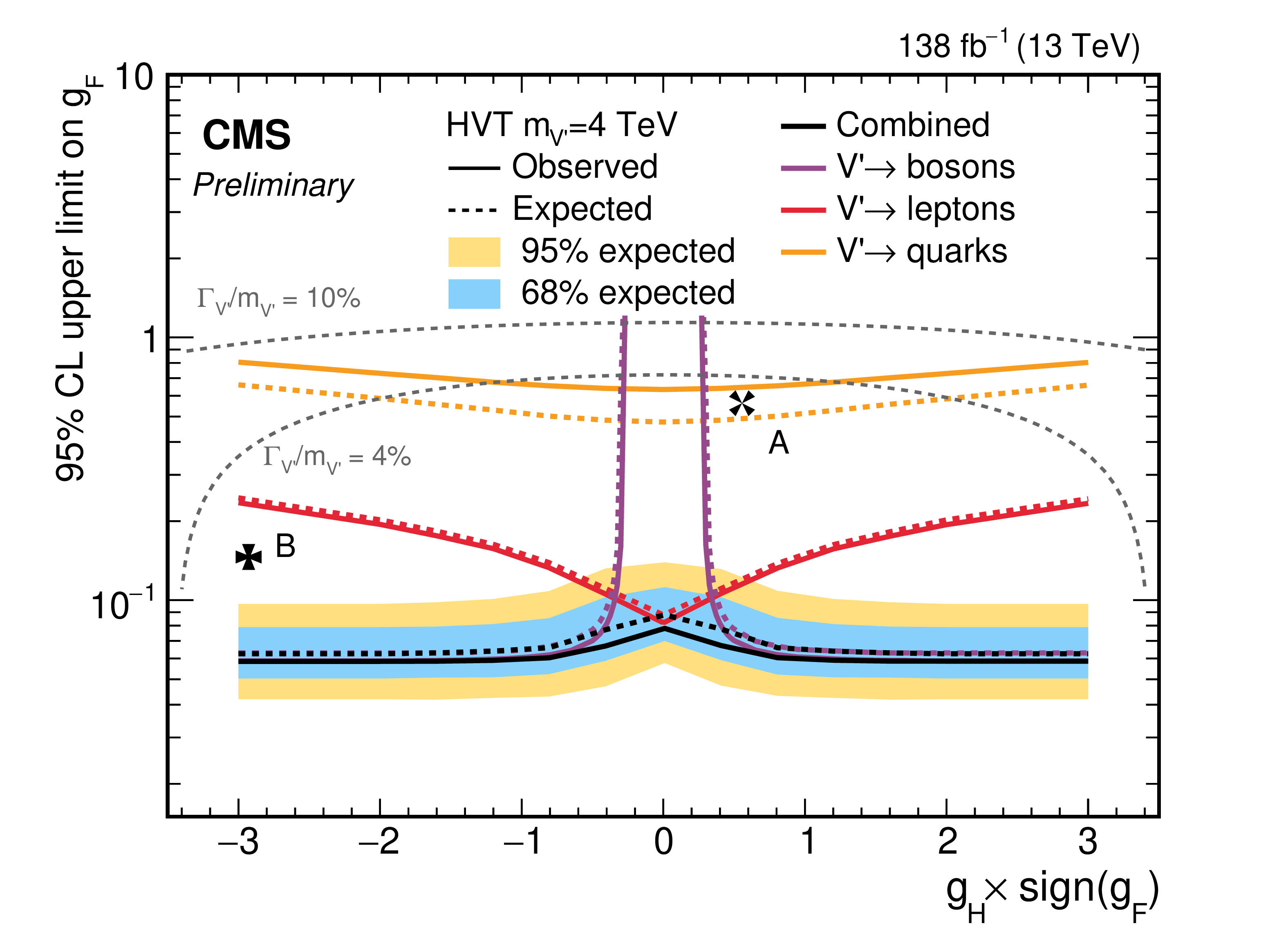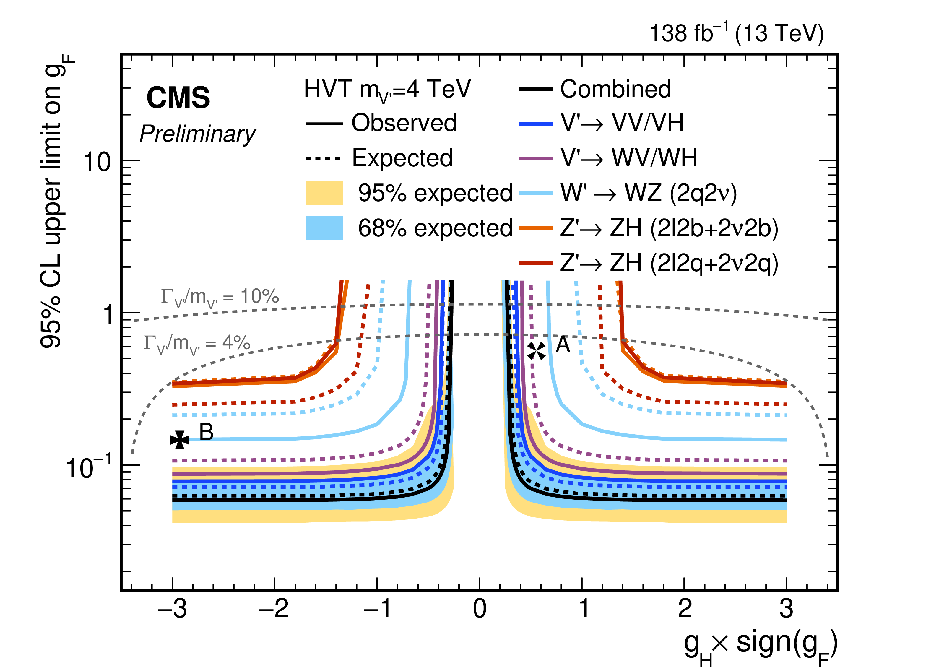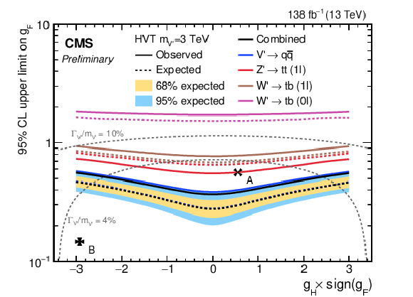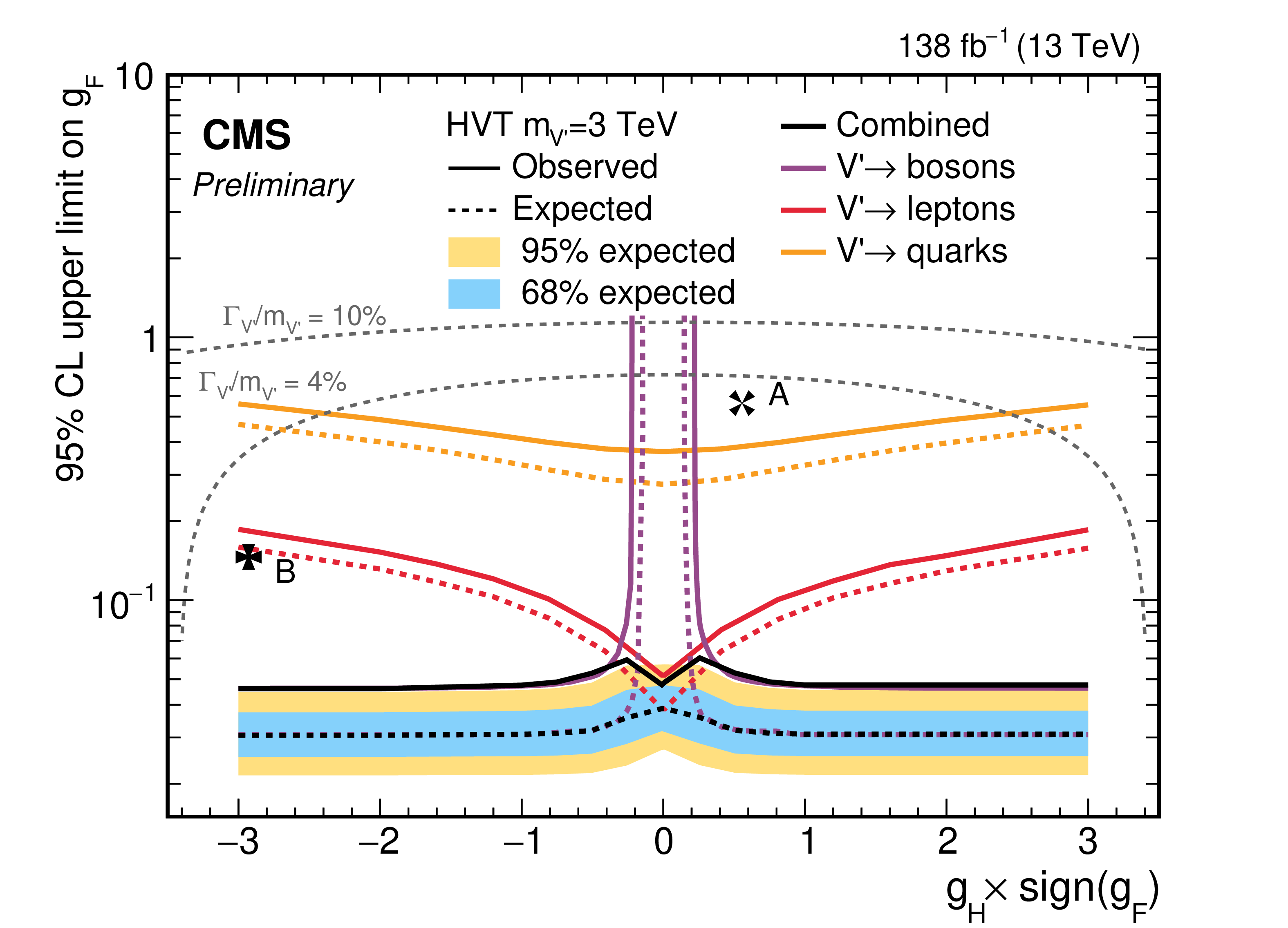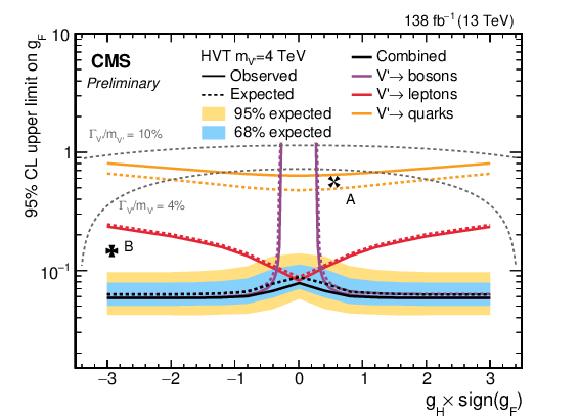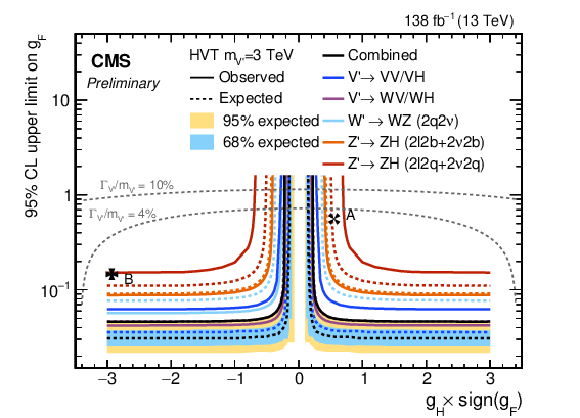 Expected and observed 95% CL upper limits on the coupling parameter $ g_{\mathrm{F}} $ as a function of $ g_{\mathrm{H}} $, under the assumption $ g_{\mathrm{V}} = $ 1. The combined results from all channels are shown for resonance masses of 3 TeV (left) and 4 TeV (right). The results from the individual channels are also shown. The gray dotted lines denote coupling values above which the relative width of the resonance, $ \Gamma_{\mathrm{V}'}/m_{\mathrm{V}'} $, exceeds 4 and 10%. The couplings corresponding to the HVT models A and B are indicated by cross markers. |