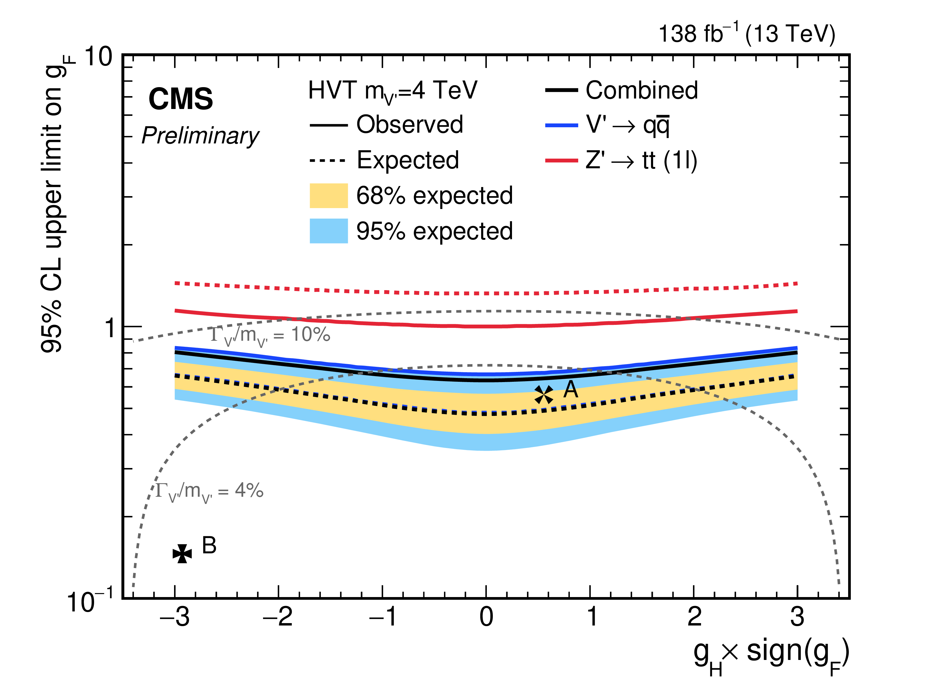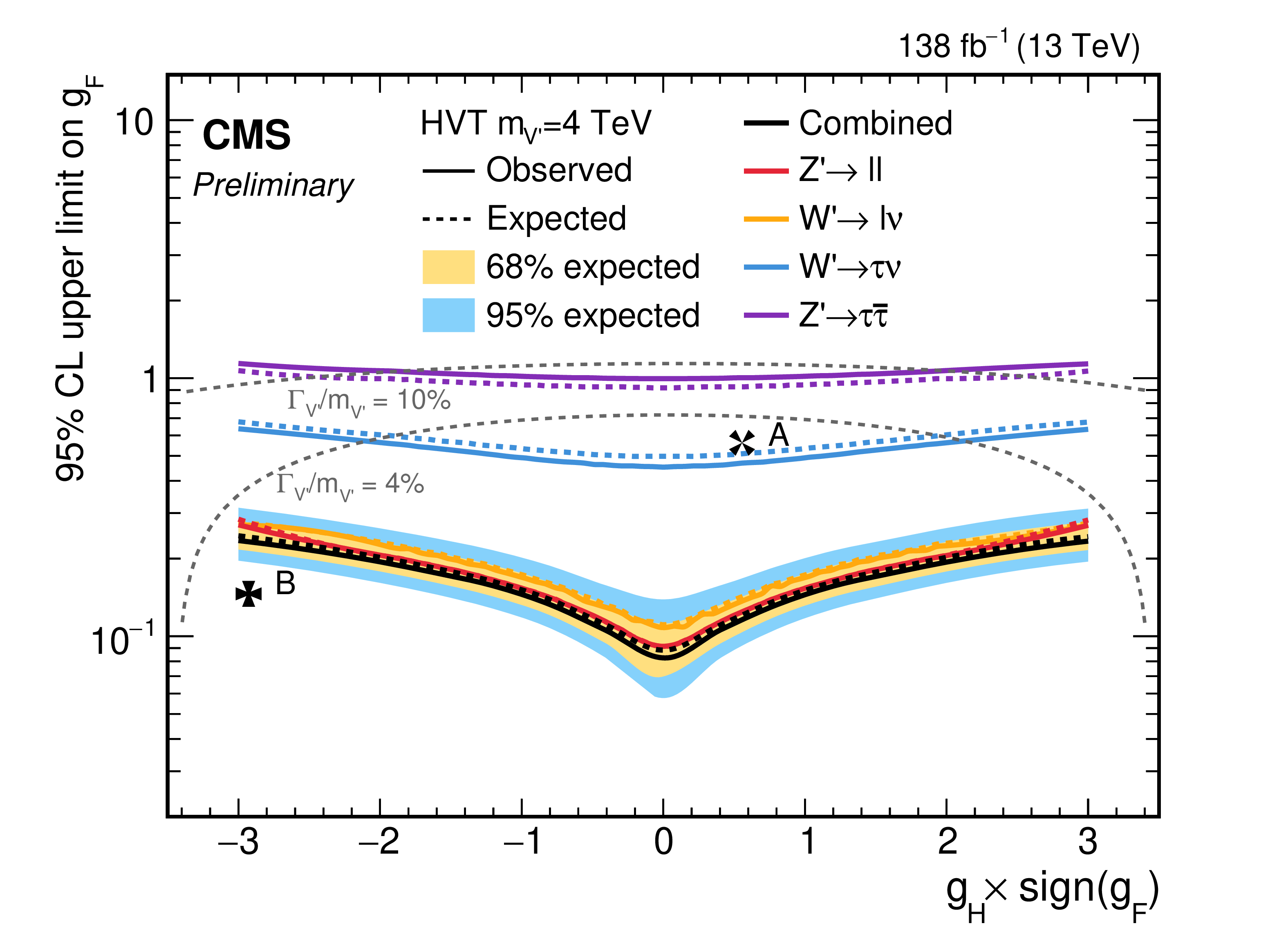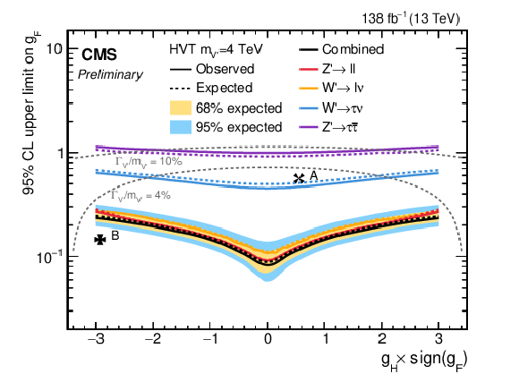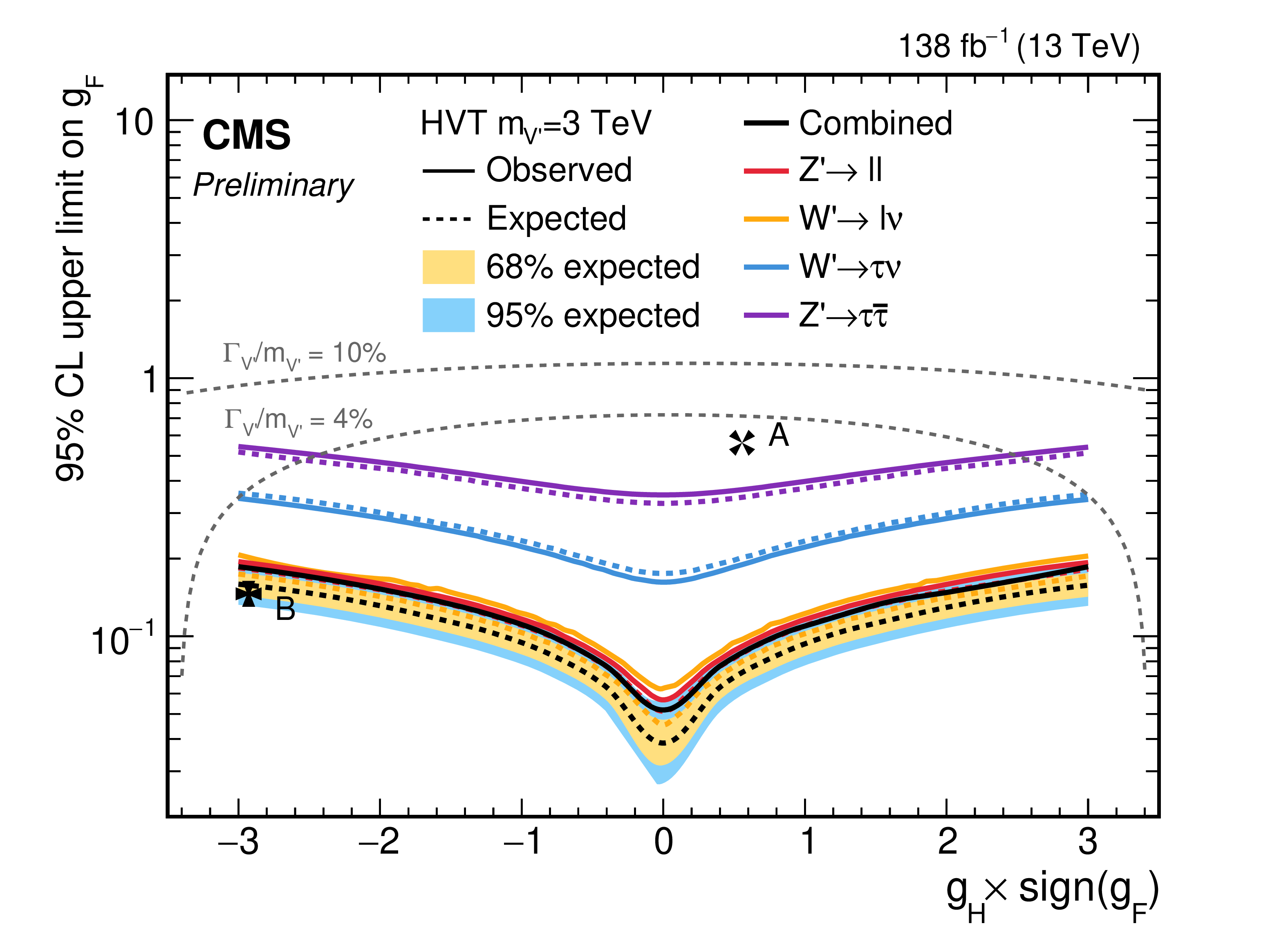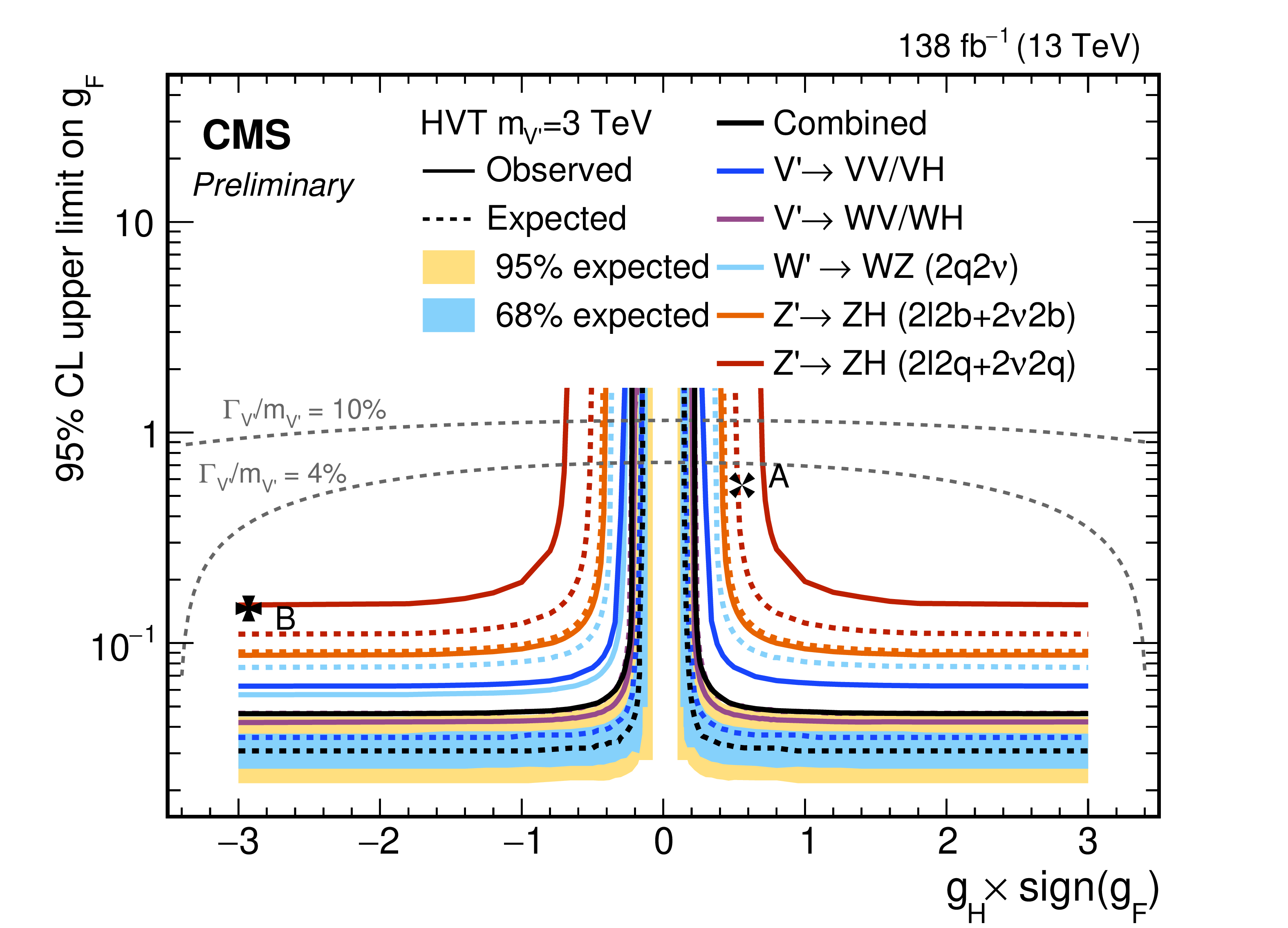 Expected and observed 95% CL upper limits on the coupling parameter $ g_{\mathrm{F}} $ as a function of $ g_{\mathrm{H}} $, under the assumption $ g_{\mathrm{V}} = $ 1. The combined results from all channels are shown for resonance masses of 3 TeV (left) and 4 TeV (right). The results from the individual channels are also shown. The gray dotted lines denote coupling values above which the relative width of the resonance, $ \Gamma_{\mathrm{V}'}/m_{\mathrm{V}'} $, exceeds 4 and 10%. The couplings corresponding to the HVT models A and B are indicated by cross markers. |