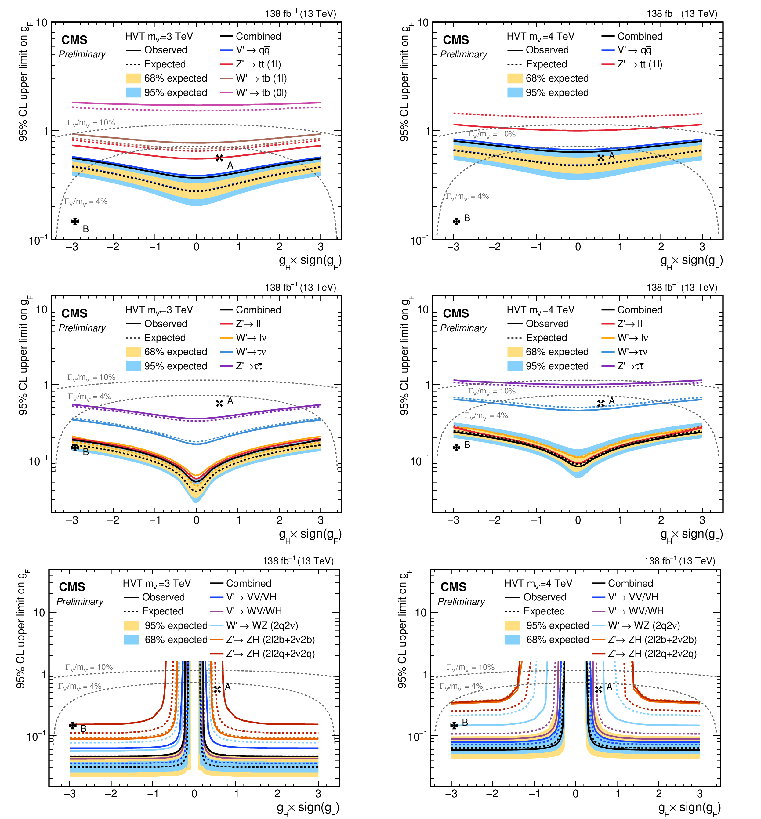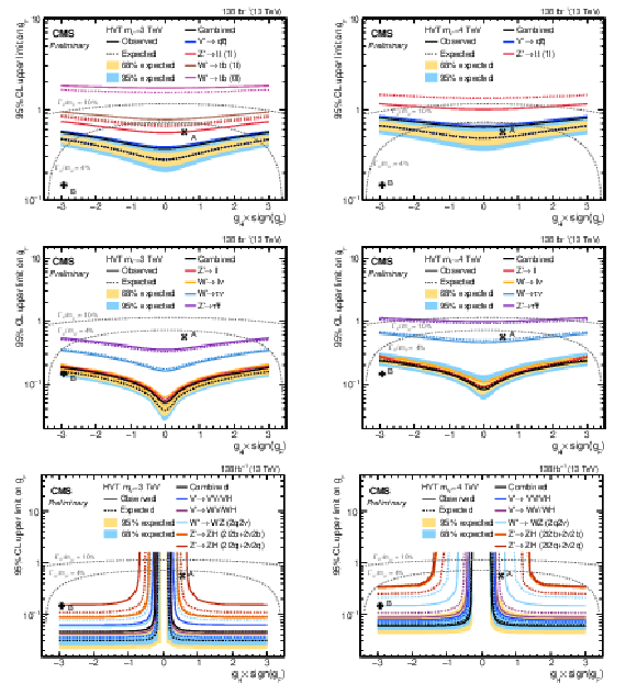 Expected and observed 95% CL upper limits on the coupling parameter $ g_{\mathrm{F}} $ as a function of $ g_{\mathrm{H}} $, under the assumption $ g_{\mathrm{V}} = $ 1. The results are shown separately for the quarkonic (upper), leptonic (middle), and bosonic (lower) channels at resonance masses of 3 TeV (left) and 4 TeV (right). The results from the individual channels are also shown. The gray dotted lines denote coupling values above which the relative width of the resonance, $ \Gamma_{\mathrm{V}'}/m_{\mathrm{V}'} $, exceeds 4 and 10%. The couplings corresponding to the HVT models A and B are indicated by cross markers. |
