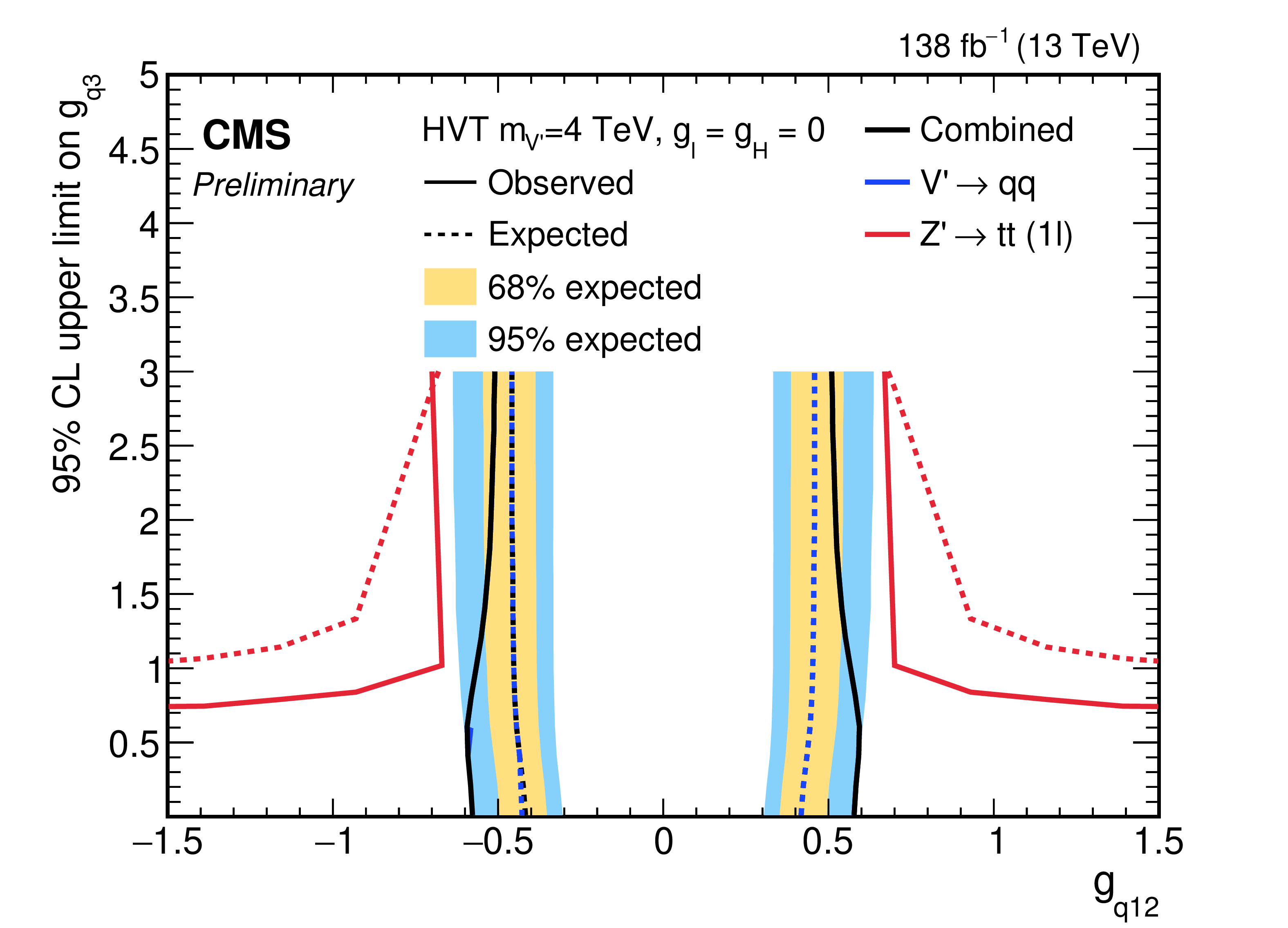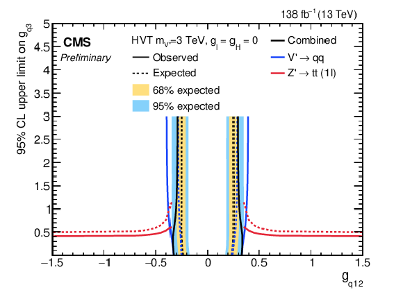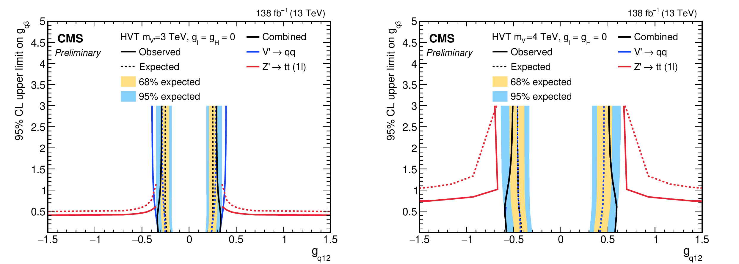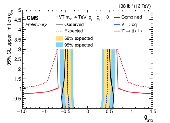 Expected and observed 95% CL upper limits in the $ g_{q_{3}} $--$ g_{q_{12}} $ coupling plane, under the assumption $ g_{\mathrm{V}} = $ 1, $ g_{l_{12}} = $ 0, $ g_{l_{3}}= $ 0, and $ g_{\mathrm{H}} = $ 0. The results are shown for the diquark channels at resonance masses of 3 TeV (left) and 4 TeV (right). The contributions from individual channels are also shown. |