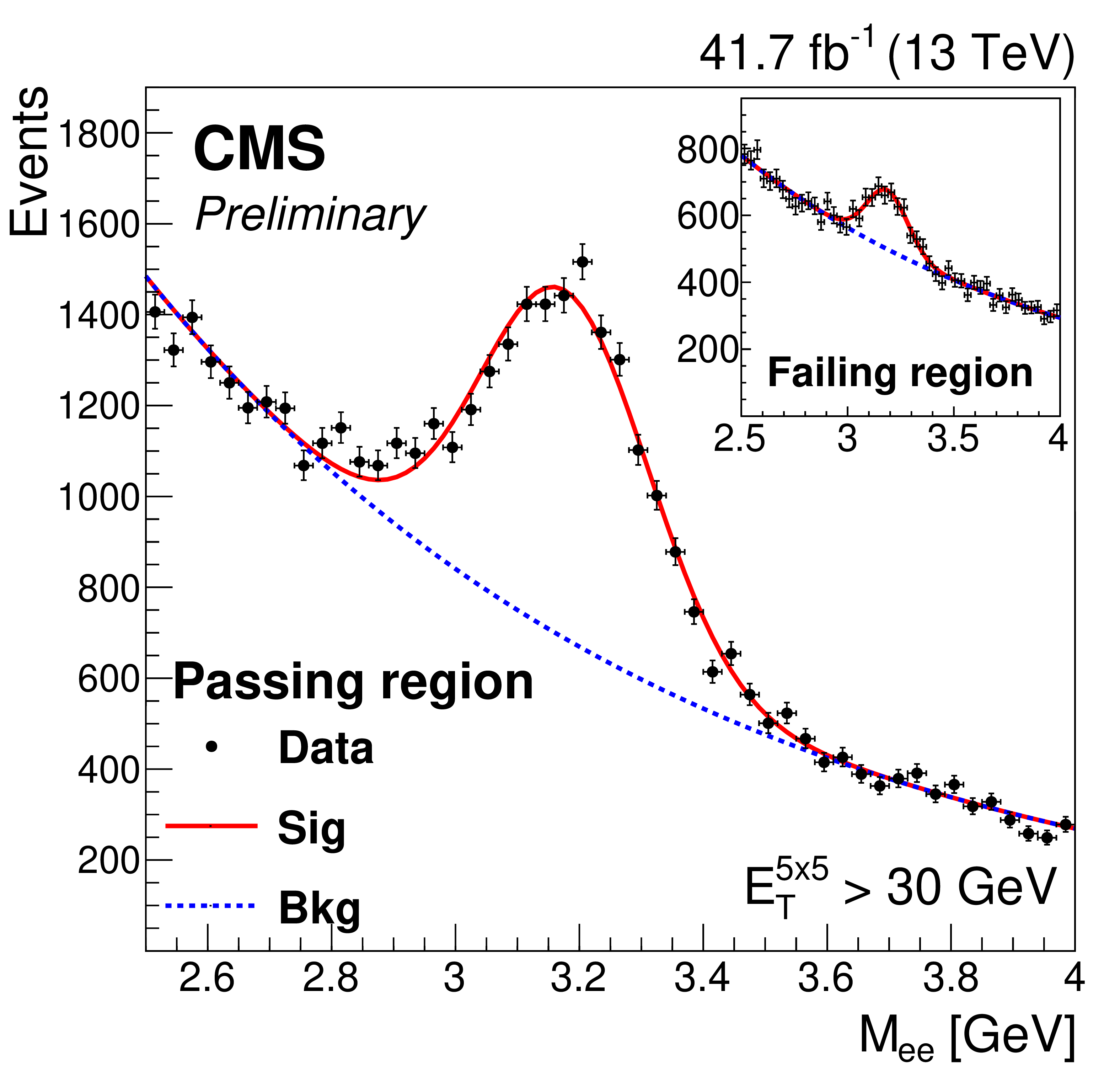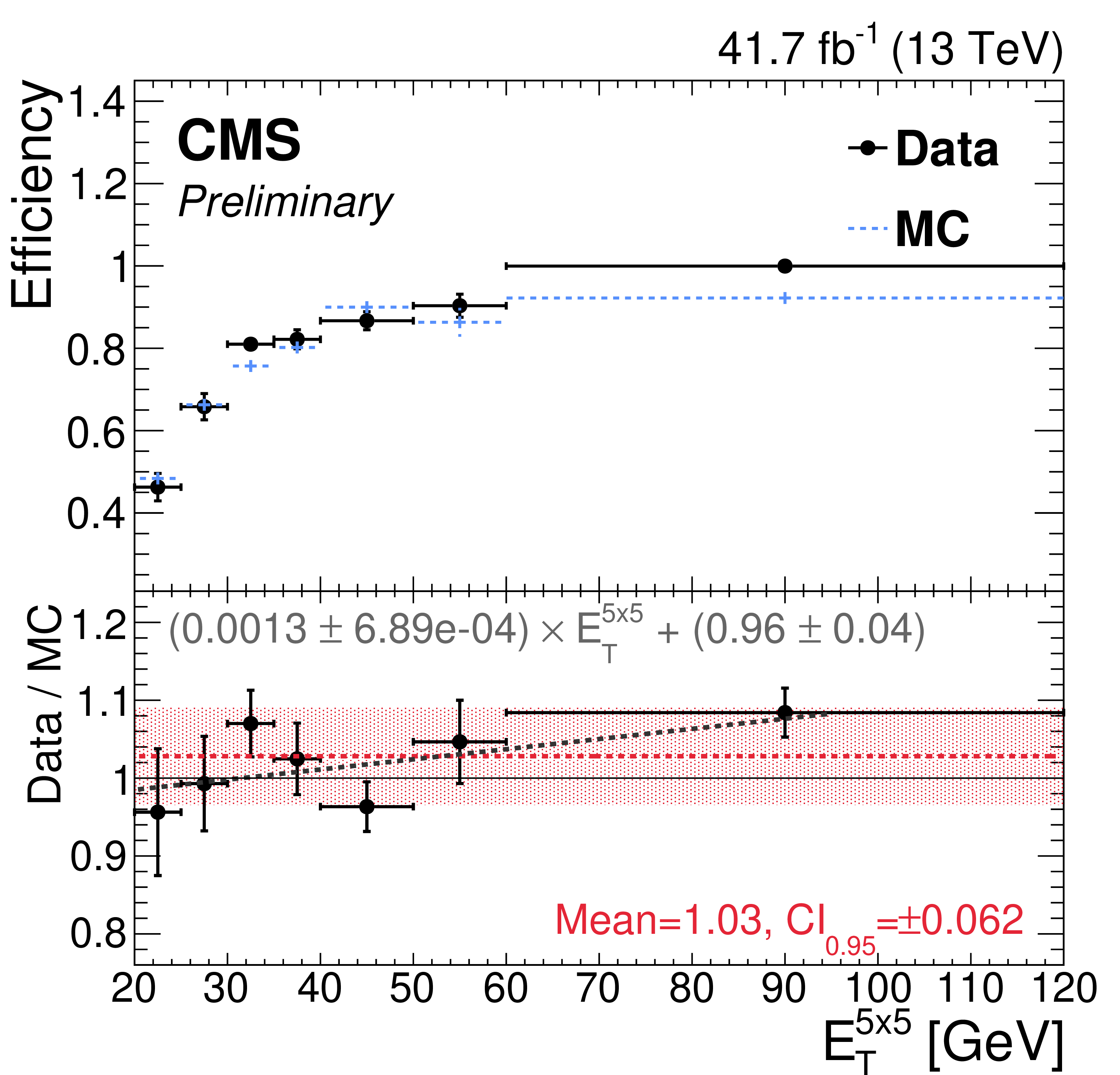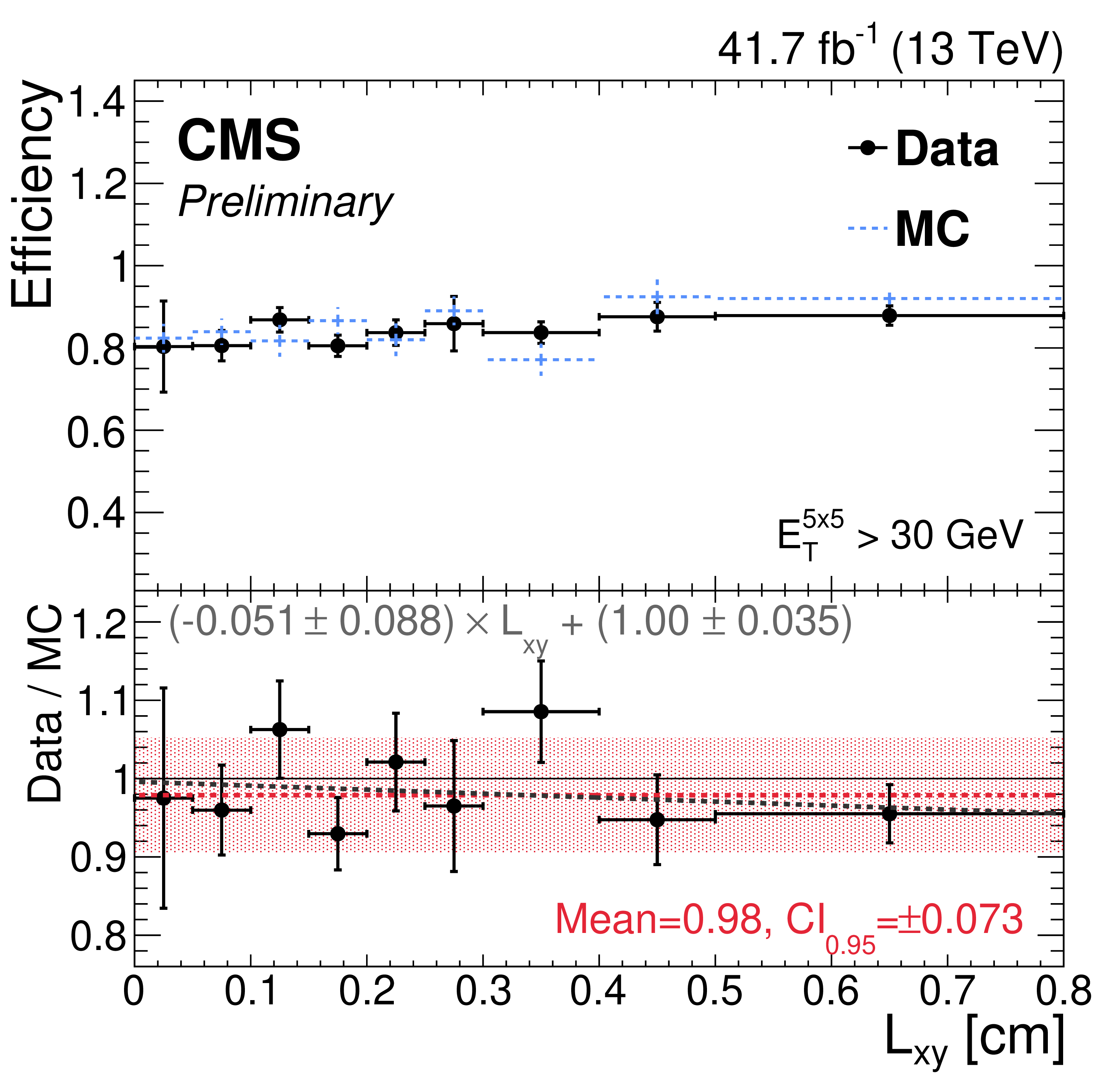 Efficiency and SF for the model with secondary tracks as a function of (upper left) $ E_{T}^{5\times5} $ and (upper right) $ L_{xy} $ with $ E_{\mathrm{T}}^{5\times5} > $ 30 GeV. The red and gray dashed lines depict the constant and first-order polynomial fit, respectively. (lower) The nominal dielectron mass distribution of $ \mathrm{J}/\psi $ candidates in data with $ {E_{\mathrm{T}}}^{5\times5} > $ 30 GeV that pass or fail the merged electron ID. The dielectron mass is reconstructed using tracks of electron candidates. |