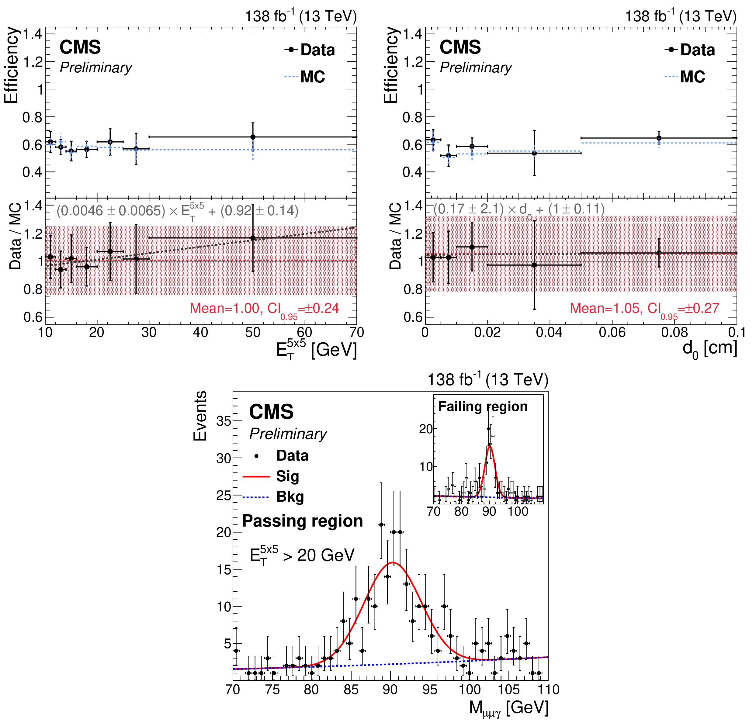 Efficiency and SF as a function of (upper left) $ {E_{\mathrm{T}}}^{5\times5} $ and (upper right) $ d_{0} $ for the model without secondary tracks. The red and gray dashed lines depict the constant and first-order polynomial fit, respectively. (lower) The nominal Z boson candidate mass distribution in data using $ \mu\mu\gamma $ events with $ {E_{\mathrm{T}}}^{5\times 5} > $ 20 GeV. The passing and failing regions represent the Z boson candidate mass distributions with $ \mathrm{e}_{\mathrm{ME}} $ candidates that pass or fail the $ \mathrm{e}_{\mathrm{ME}} $ ID. |