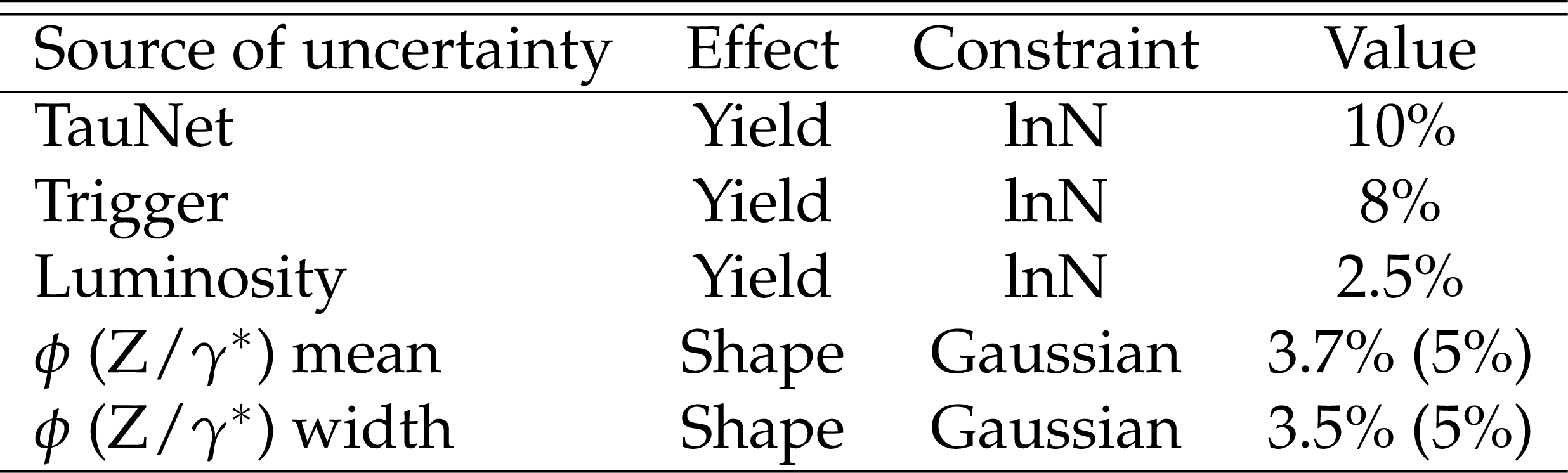 Summary of the systematic uncertainties in the signal yield and shape. The ``lnN'' denotes lognormal distribution. |