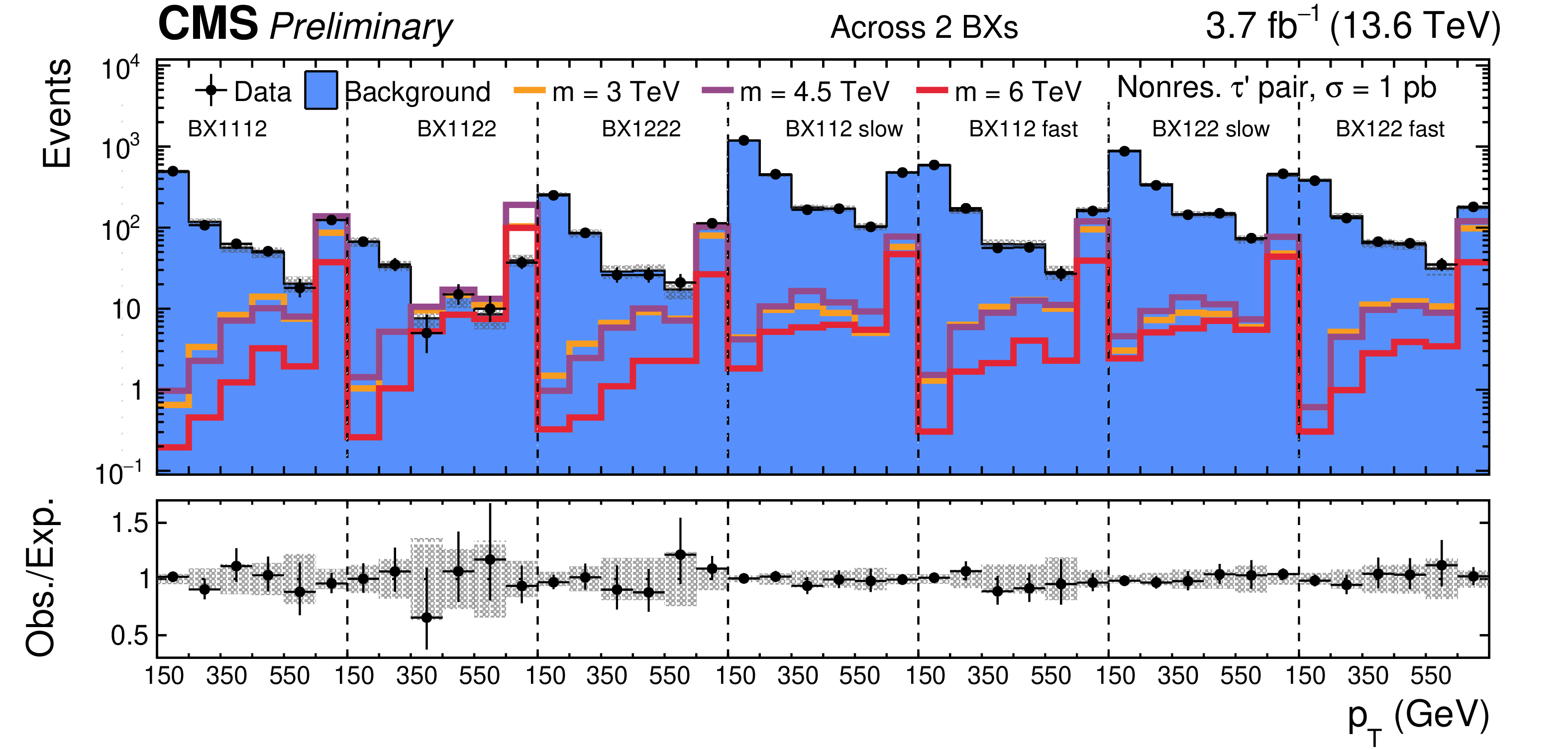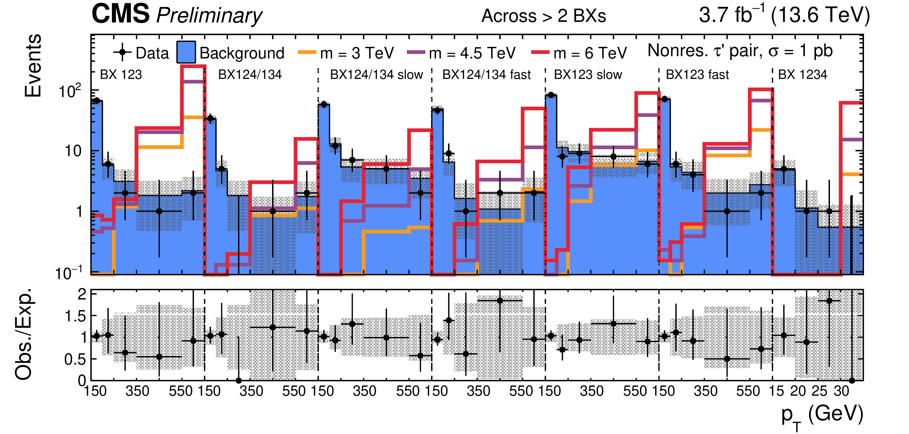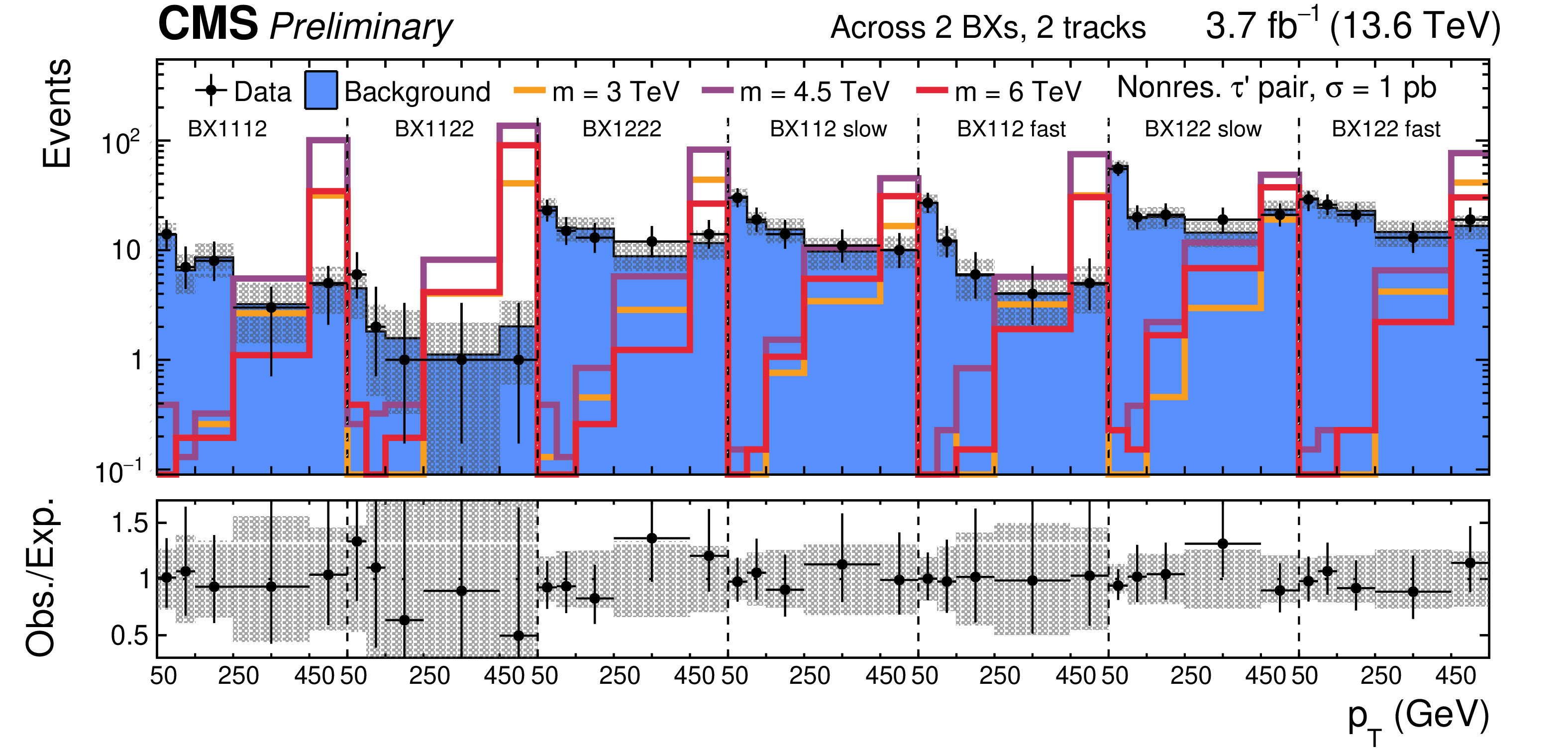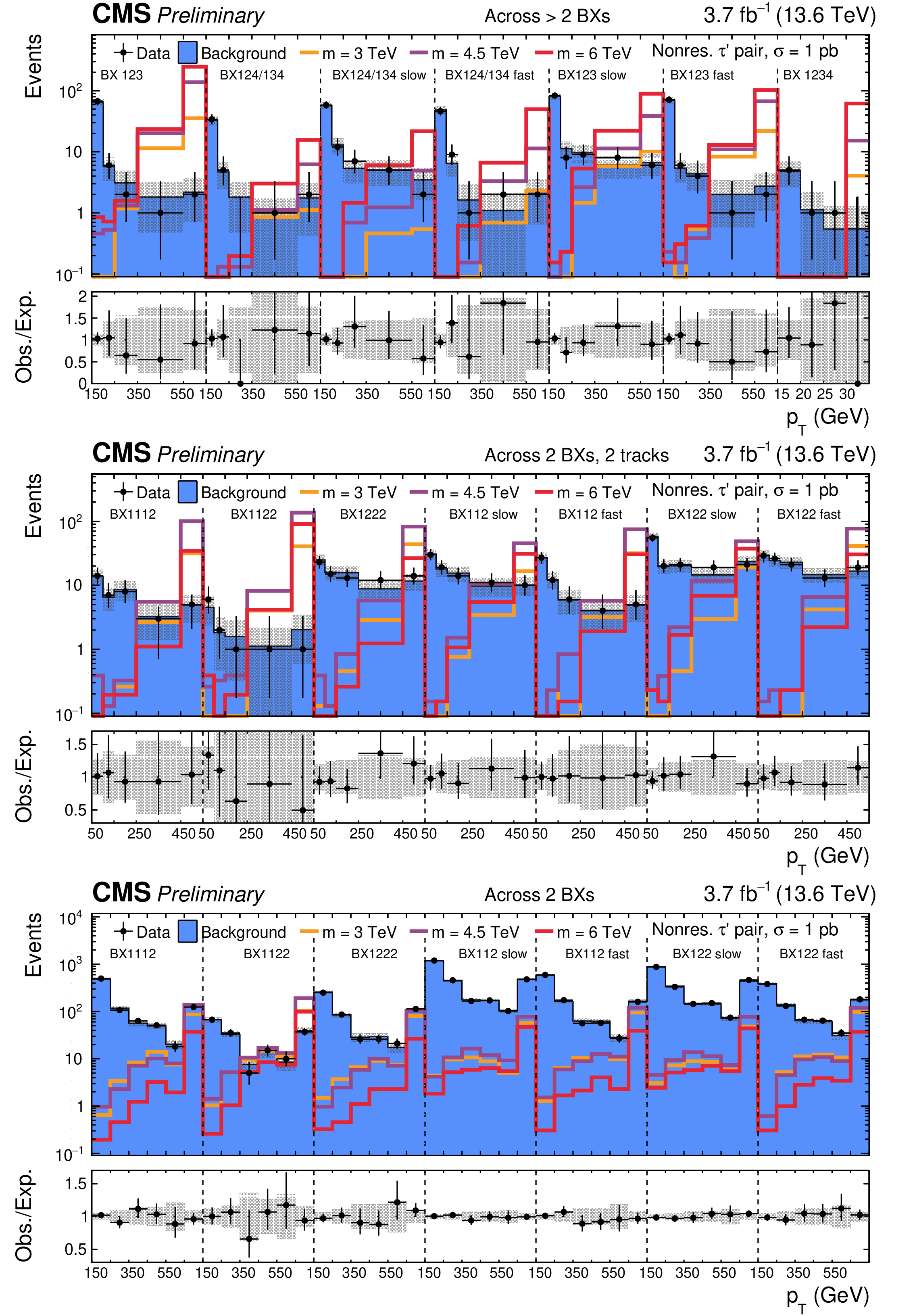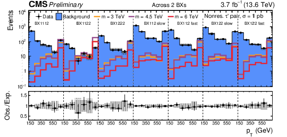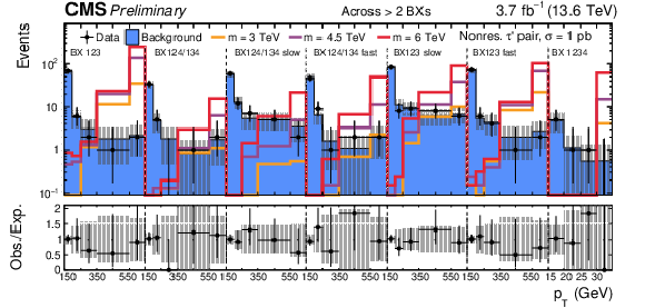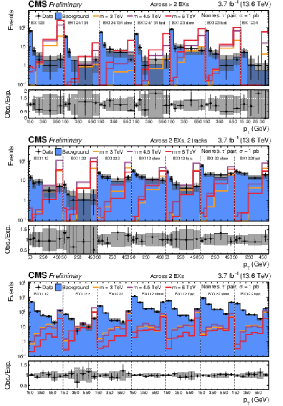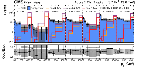 SR distributions for the categories with tracks across $ > $ 2 ($ = $ 2,$ = $ 2) BXs without (with, without) additional track requirement are shown in the upper (center, lower) part of the figure. The background distributions are the result of the maximum likelihood fit. The signal is shown for a few mass hypotheses of the nonresonant fourth-generation lepton model, using a production cross section of 1 pb. |