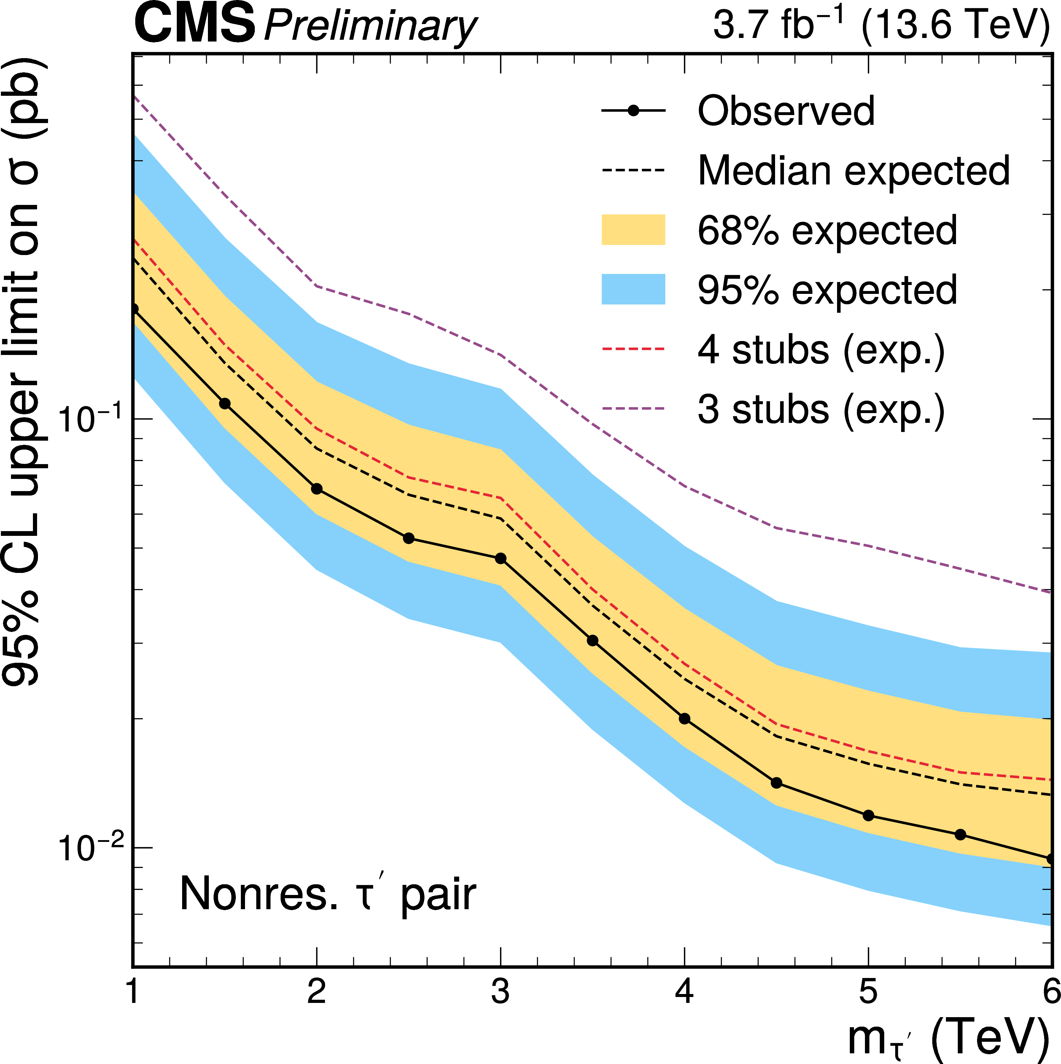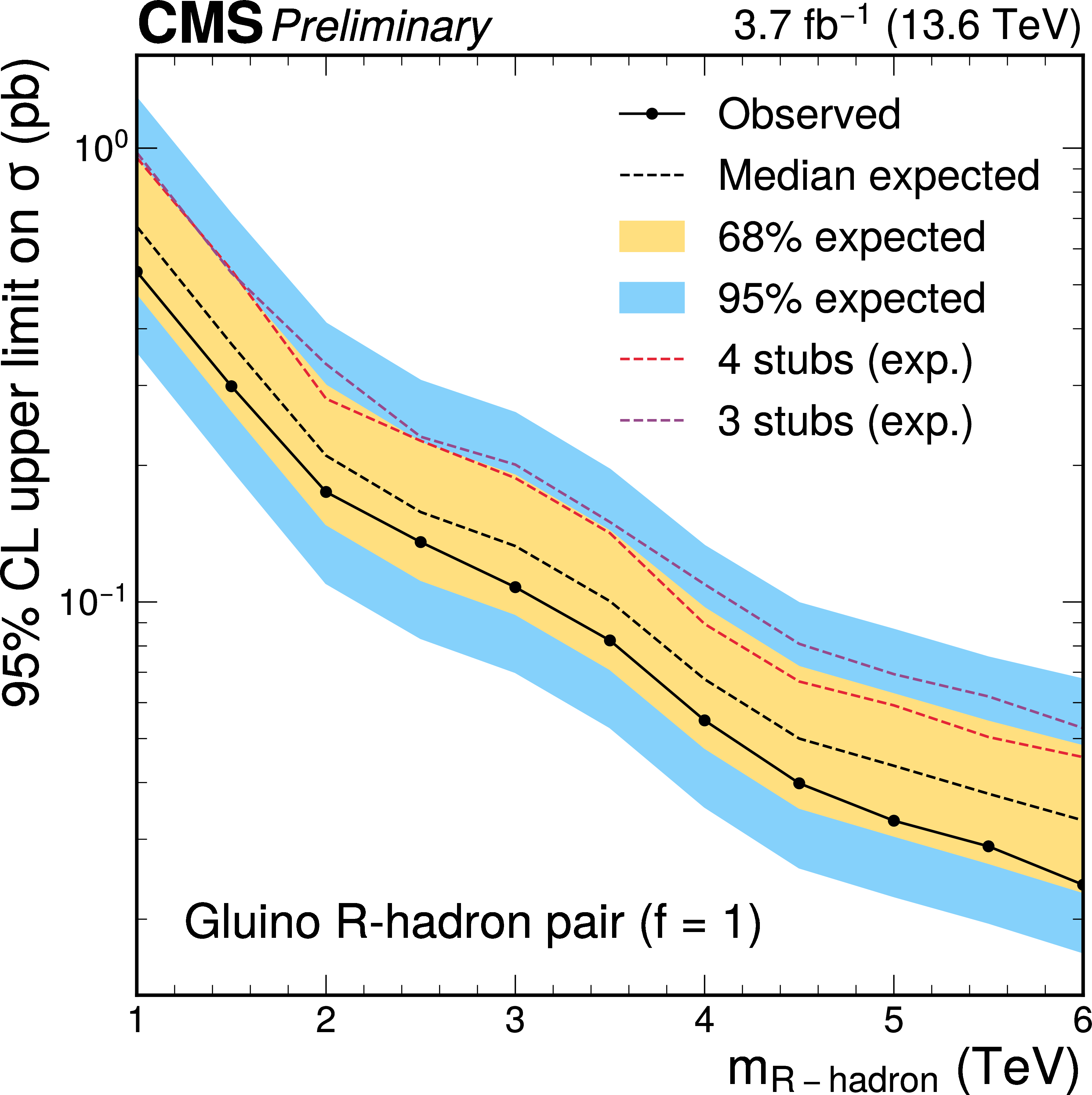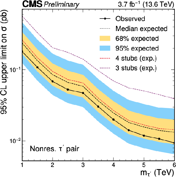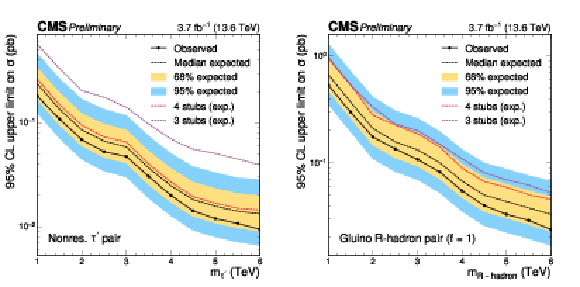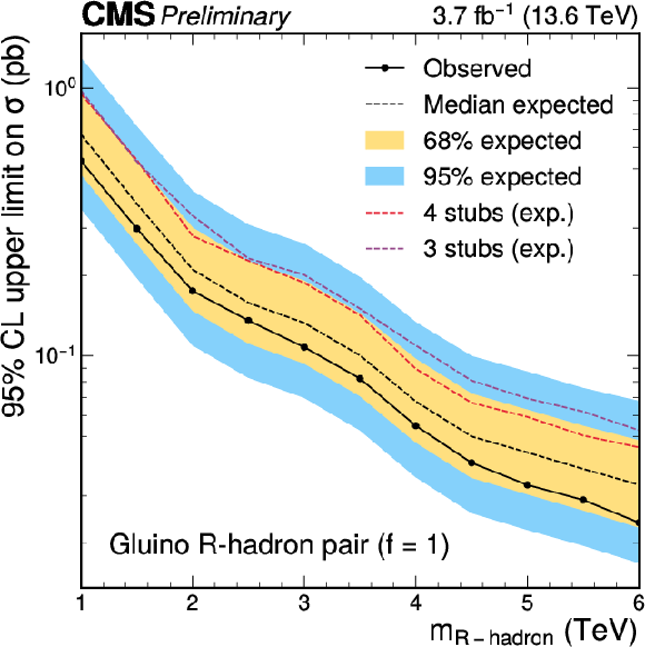 Observed (full line with markers) and expected (dashed black line) upper limits at 95% CL on the production cross section of heavy fourth-generation leptons through nonresonant DY production (left) and of a gluino $ R $-hadron pair with $ f= $ 1 (right). The inner (yellow) band and the outer (blue) band indicate the regions containing 68 and 95%, respectively, of the distribution of limits expected under the background-only hypothesis. The expected limits for the combinations of three-stub (dashed purple line) and four-stub (dashed-red line) categories are also shown. |