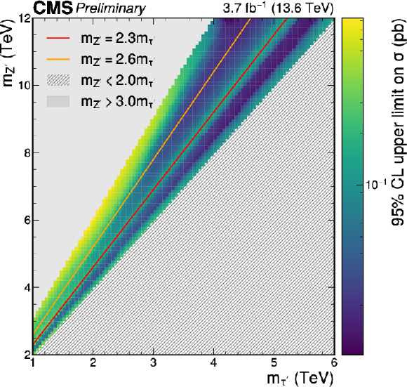 Observed upper limits at 95% CL on the production cross section of heavy fourth-generation leptons through $ \mathrm{Z}' $ decays. Lines indicate different values of the ratio of $ \mathrm{Z}' $ to $ \tau' $ masses, for which $ \beta $ values are typically similar. For $ m_{\mathrm{Z}'} > $ 3.0 $m_{\tau'} $, the HSCPs typically have high $ \beta $ and are reconstructed in the same BX. |