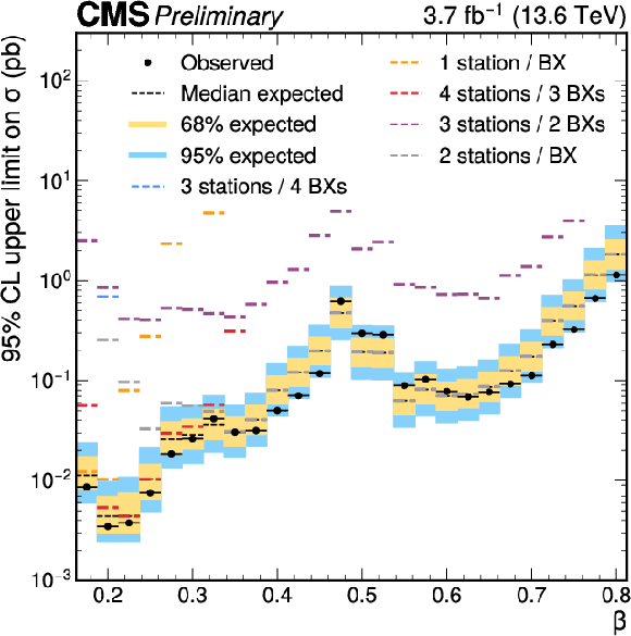 Observed and expected upper limits at 95% CL on the fiducial cross section of a heavy particle leaving a signature in the muon stations with $ p_{\mathrm{T}} > $ 500 GeV, $ |\eta| < $ 0.83, and a given $ \beta $ range. The inner (yellow) band and the outer (blue) band indicate the regions containing 68 and 95%, respectively, of the distribution of limits expected under the background-only hypothesis. The expected limits for groups of categories corresponding to a different number of stations crossed per BX are also shown with colorful dashed lines. |