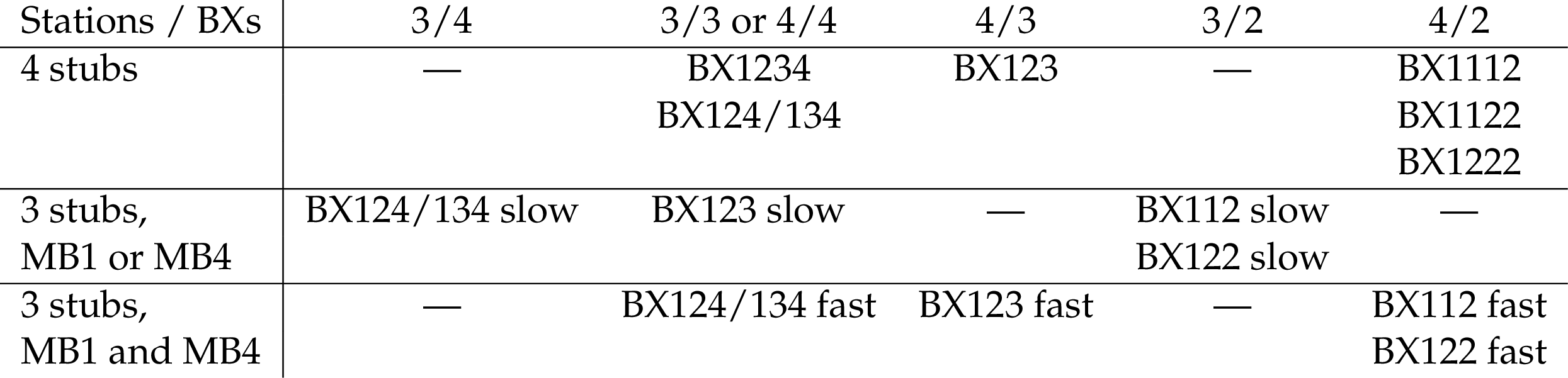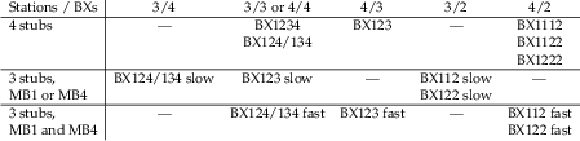 Categories based on the stub multiplicity of the track, the stations with stubs, and the speed expressed as the number of crossed stations divided by the number of BXs spent to cross them. BX1112 (1122, 1222) corresponds to three (two, one) stubs in the first BX, and one (two, three) stubs in the next BX, whereas BX112 (122) corresponds to two (one) stubs in the first BX and one (two) stubs in the next BX. For three-stub (four-stub) tracks, BX124/134 corresponds to three (four) stubs in three different BXs across a range of 4 BXs. Three-stub categories denoted "fast" have the first stub in MB1 and the last one in MB4, corresponding to a longer distance crossed in the same amount of time as their "slow" counterparts, which do not have stubs in both extreme stations. |
