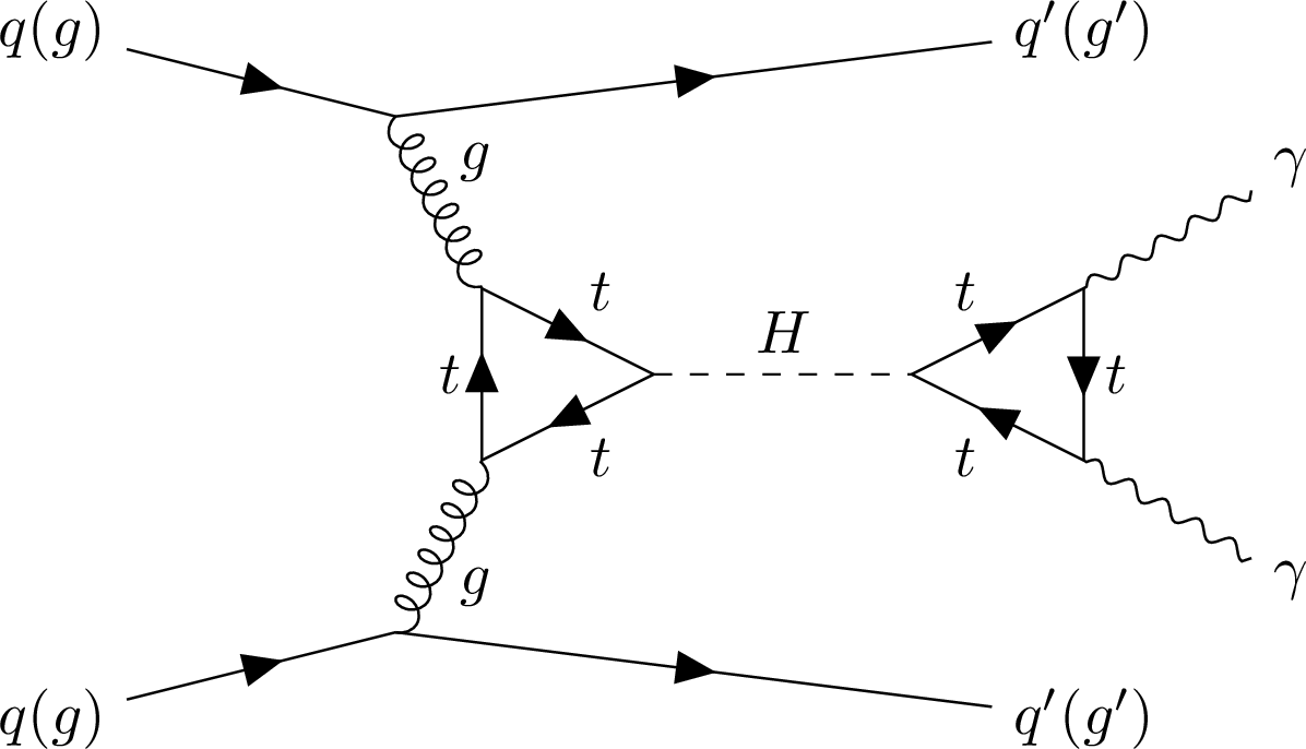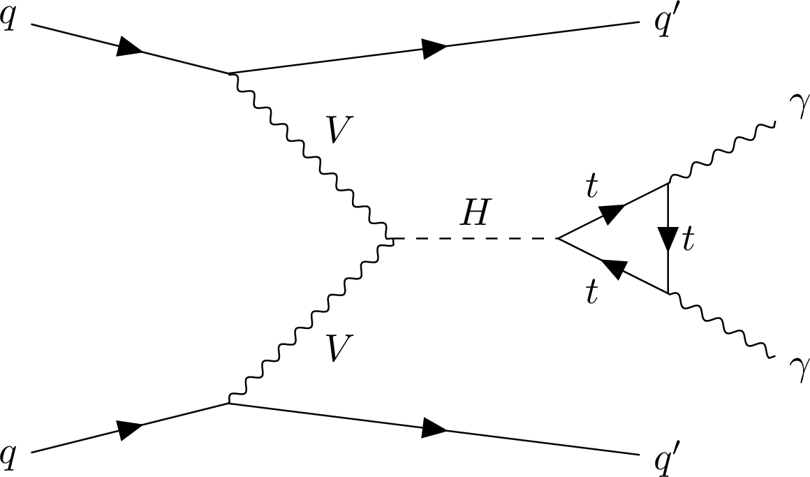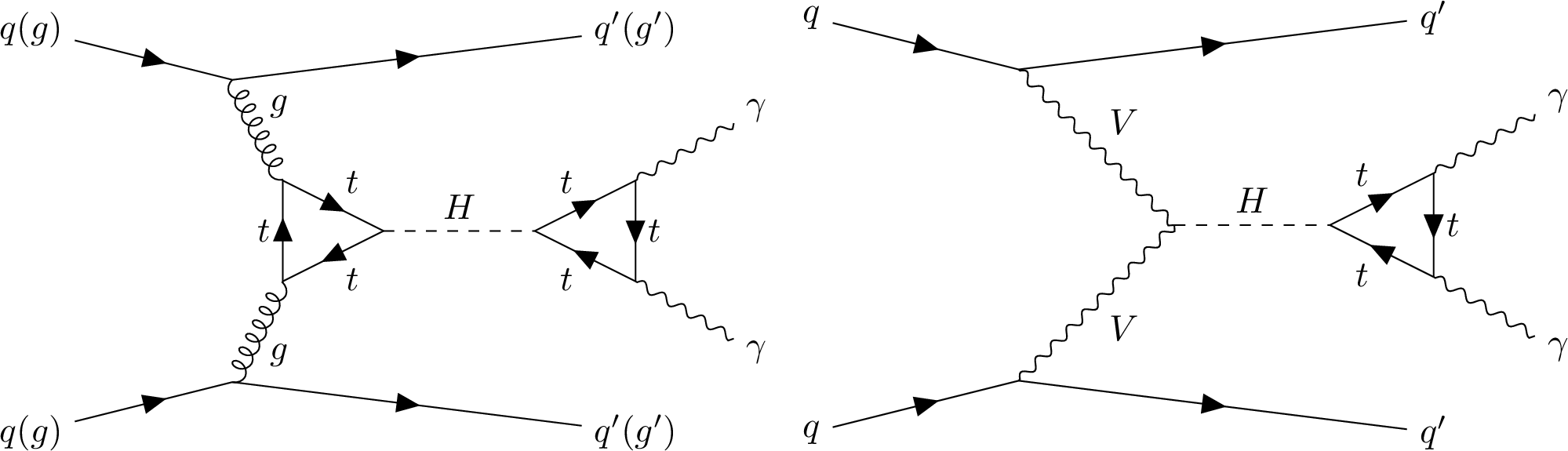 Example of diagrams for the process in which a Higgs boson decaying into a pair of photons is produced via gluon fusion in association with two jets (left) and via vector boson fusion (right). |
