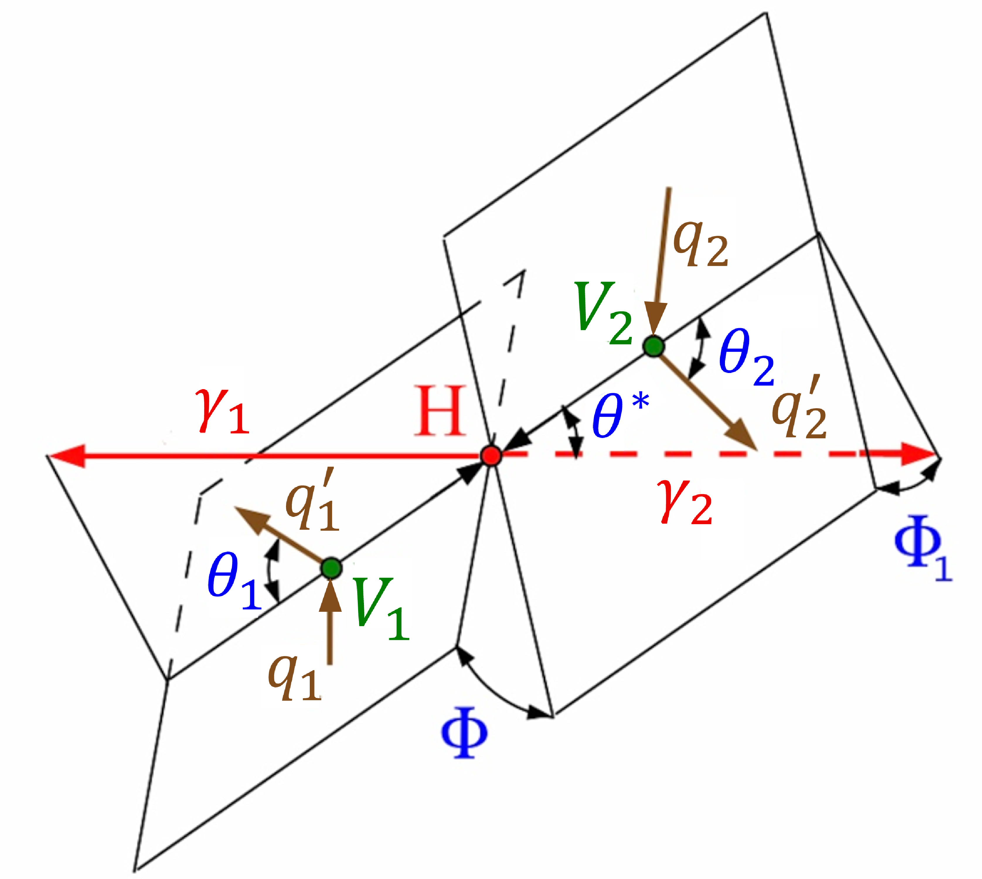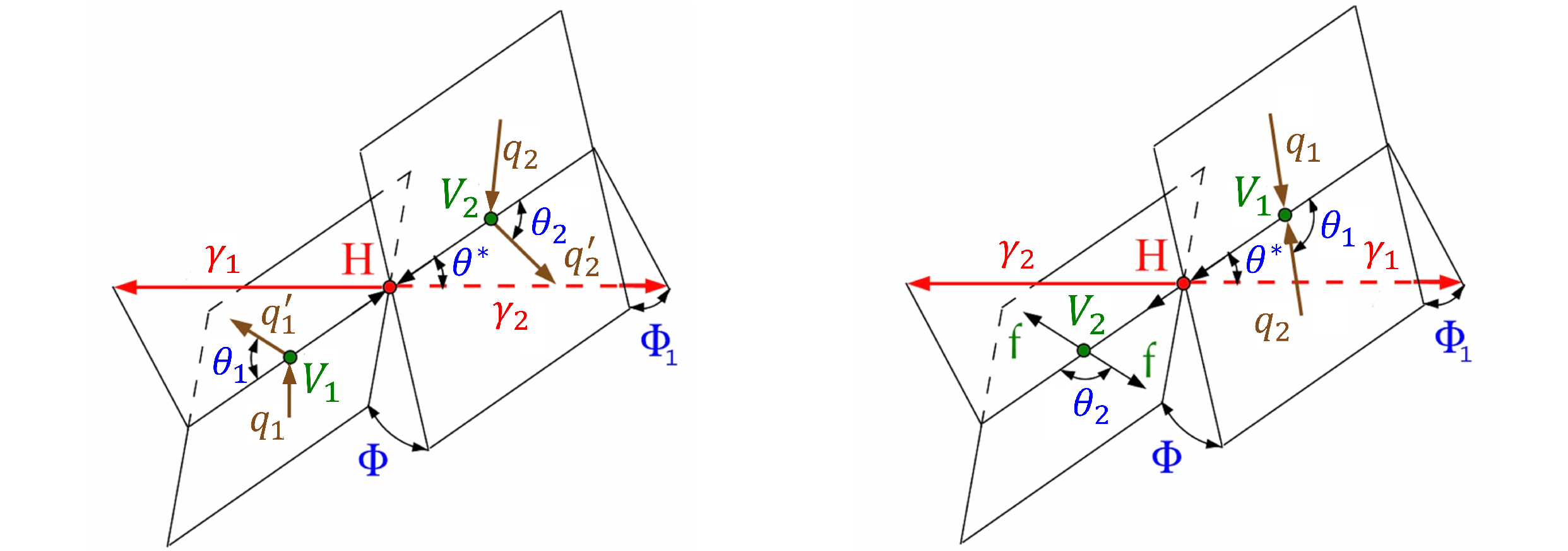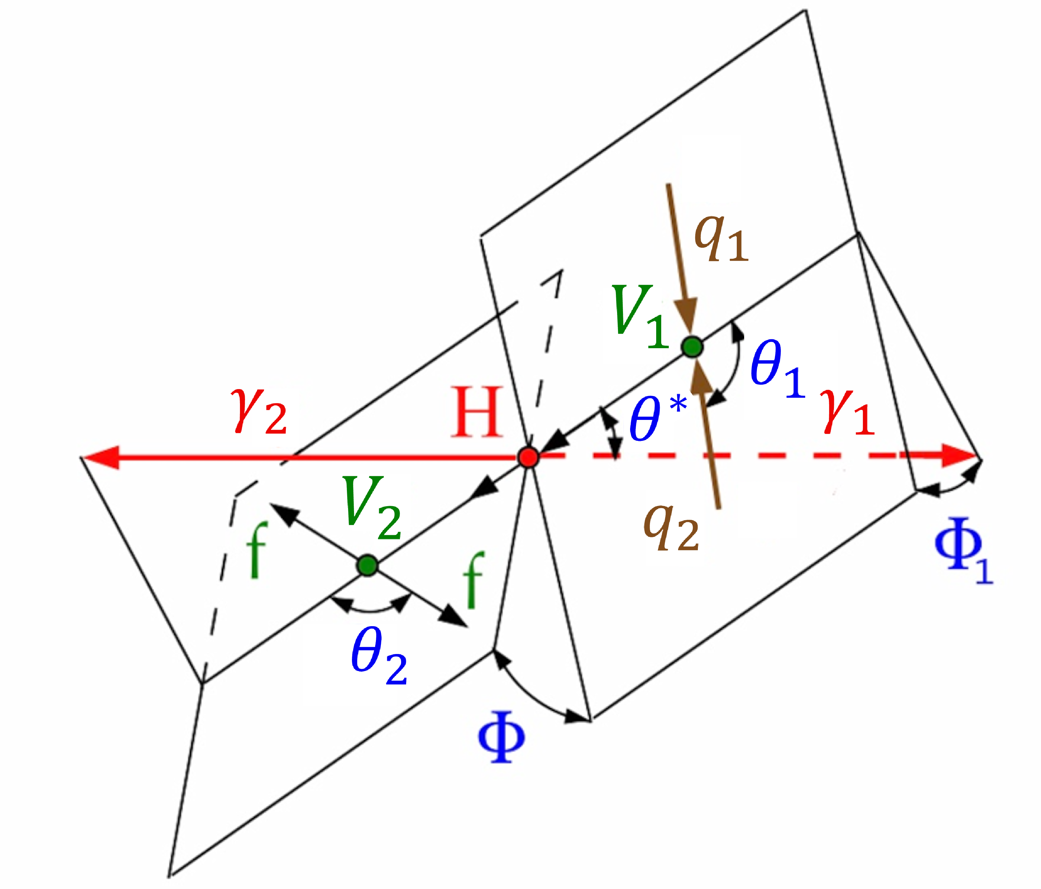 Topologies of the H production and decay, useful for the measurement of $ \mathrm{H}\mathrm{V}\mathrm{V} $ couplings: EW vector boson fusion $ q_1 q_2\to \mathrm{V}_1\mathrm{V}_2 + q_1^{'}q_2^{'} \to \mathrm{H} + q_1^{'}q_2^{'} \to \gamma_1\gamma_2 + q_1^{'}q_2^{'} $ (left); associated production $ q_1 q_2\to \mathrm{V}_1 \to \mathrm{V}_2\mathrm{H} \to \gamma_1\gamma_2 +\mathrm{ff} $ (right). The figure on the left is also valid to describe gluon fusion events in association with two jets, useful for the measurement of $ \mathrm{H}\mathrm{g}\mathrm{g} $ couplings, when $ \mathrm{V} = \mathrm{g} $. The incoming partons are shown in brown and the intermediate or final-state particles are shown in red and green. The angles characterizing kinematic distributions are shown in blue and are defined in the respective rest frames [39,44,47]. |