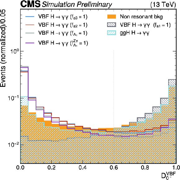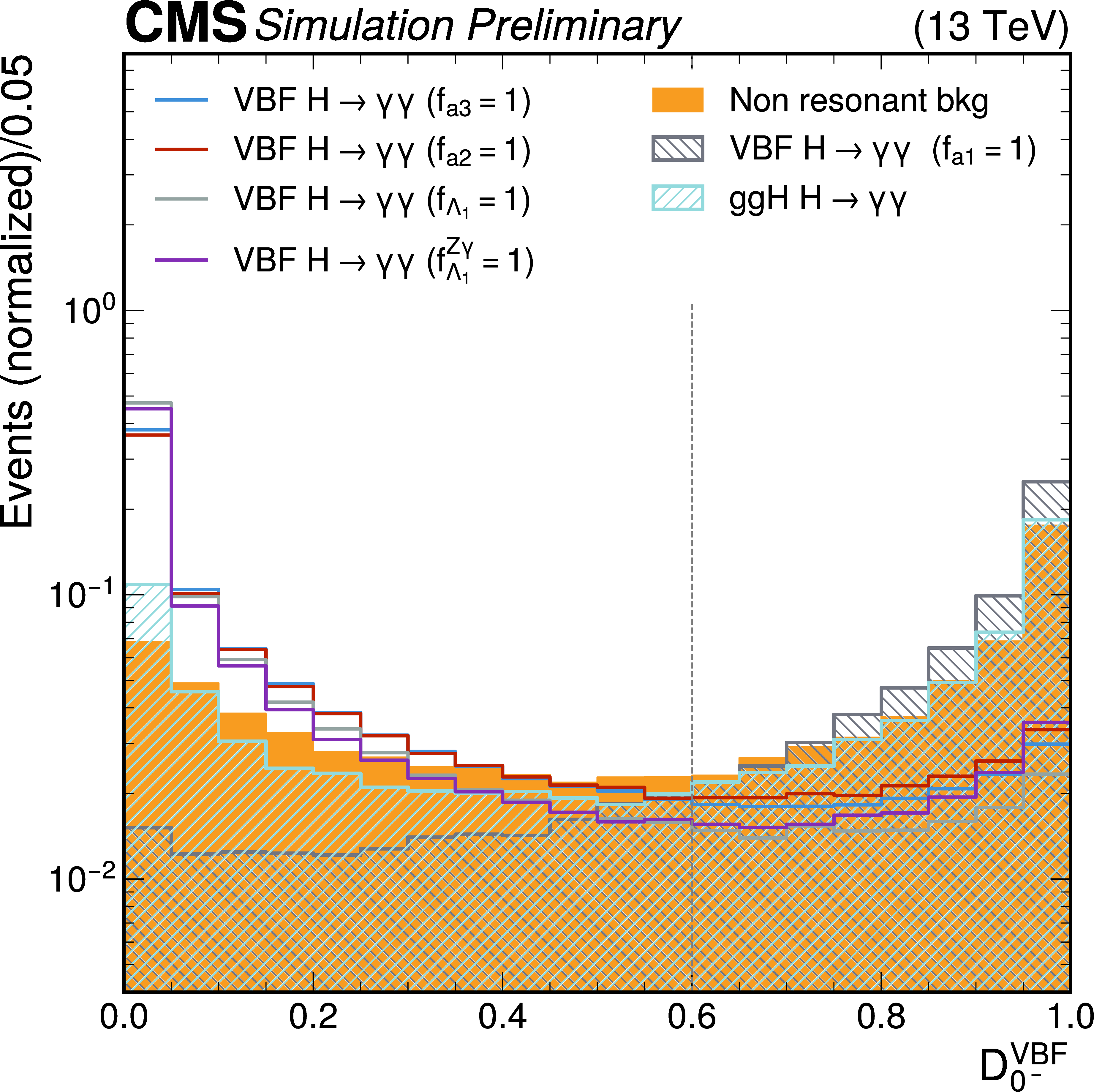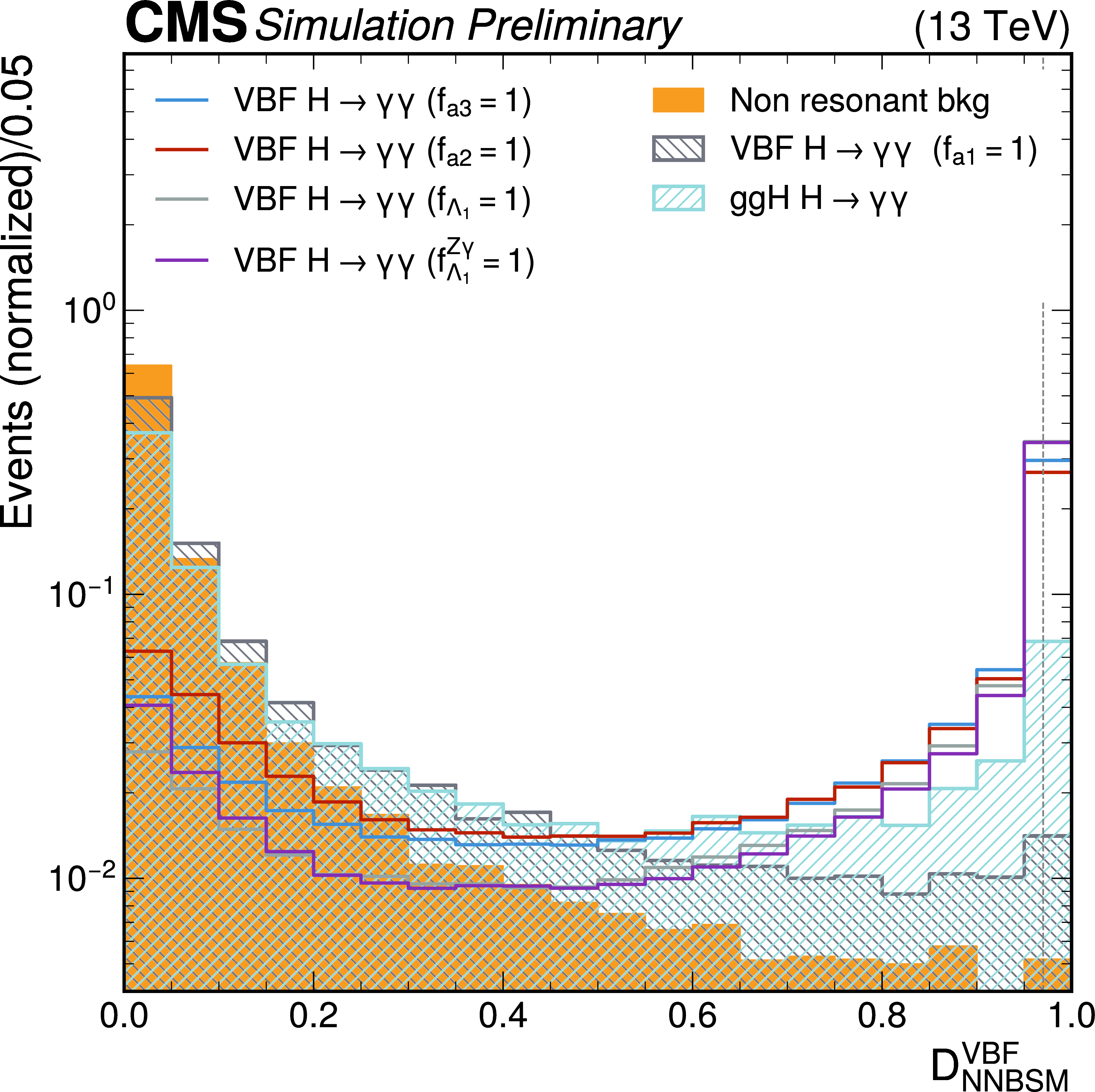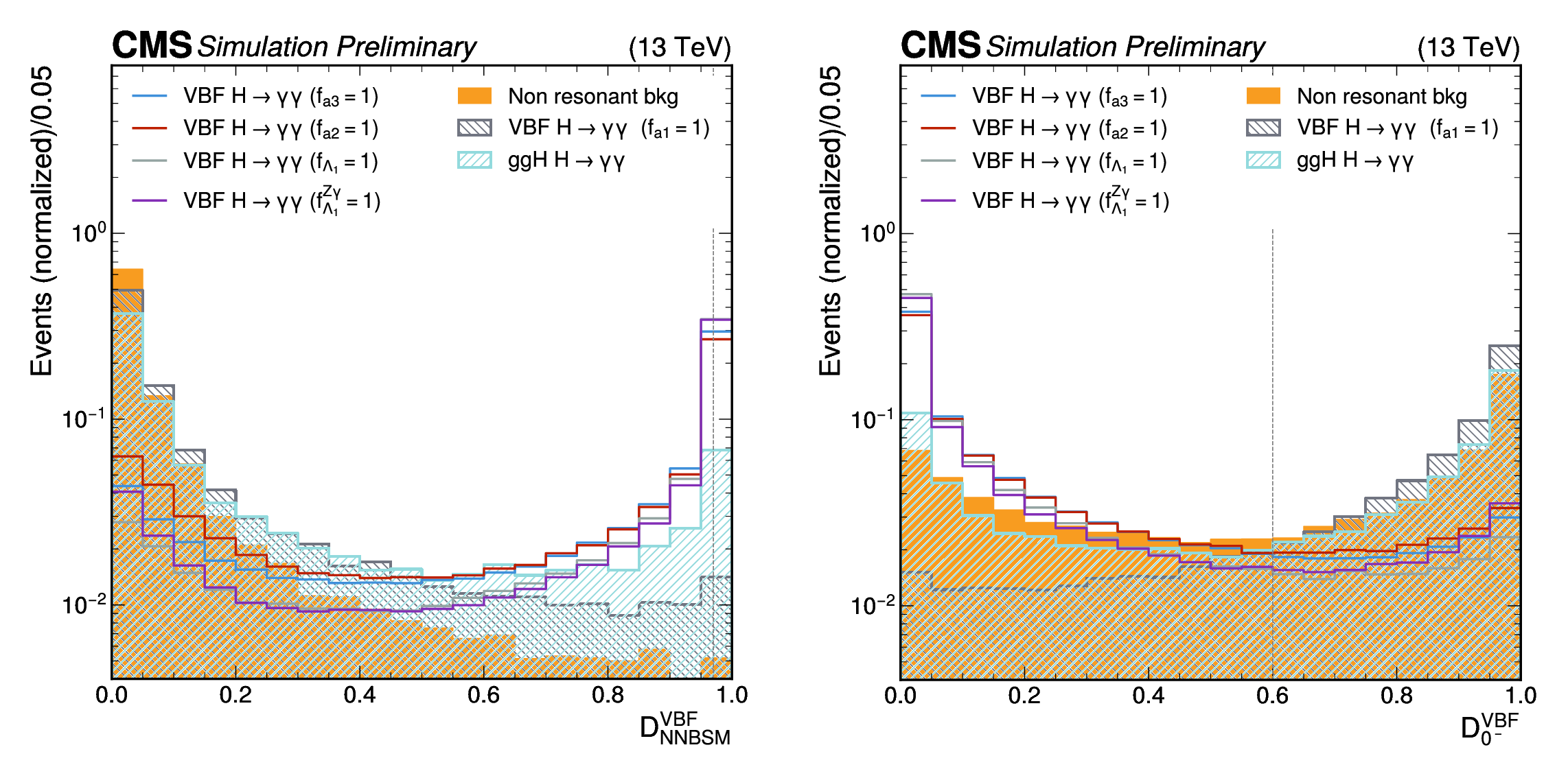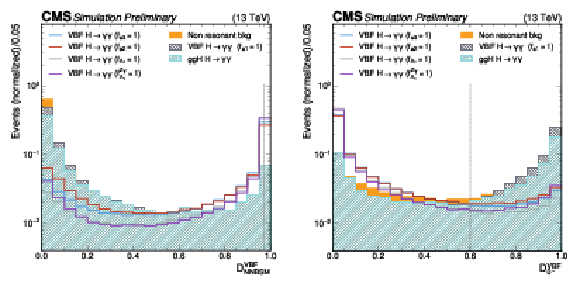 Distribution of the $ \mathcal{D}^\mathrm{VBF}_\mathrm{NNBSM} $ (left) and $ \mathcal{D}^\mathrm{VBF}_\mathrm{0-} $ (right) discriminant for the SM $ \mathrm{VBF} $ signal and for four anomalous coupling hypotheses, shown together with the main resonant background (SM $ \mathrm{g}\mathrm{g}\mathrm{H} $ production), and the continuous diphoton background. The distributions are shown after the VBF preselection described in the text and are normalized to the unit area. The vertical dashed lines indicate the category boundaries applied in the analysis. |