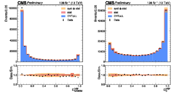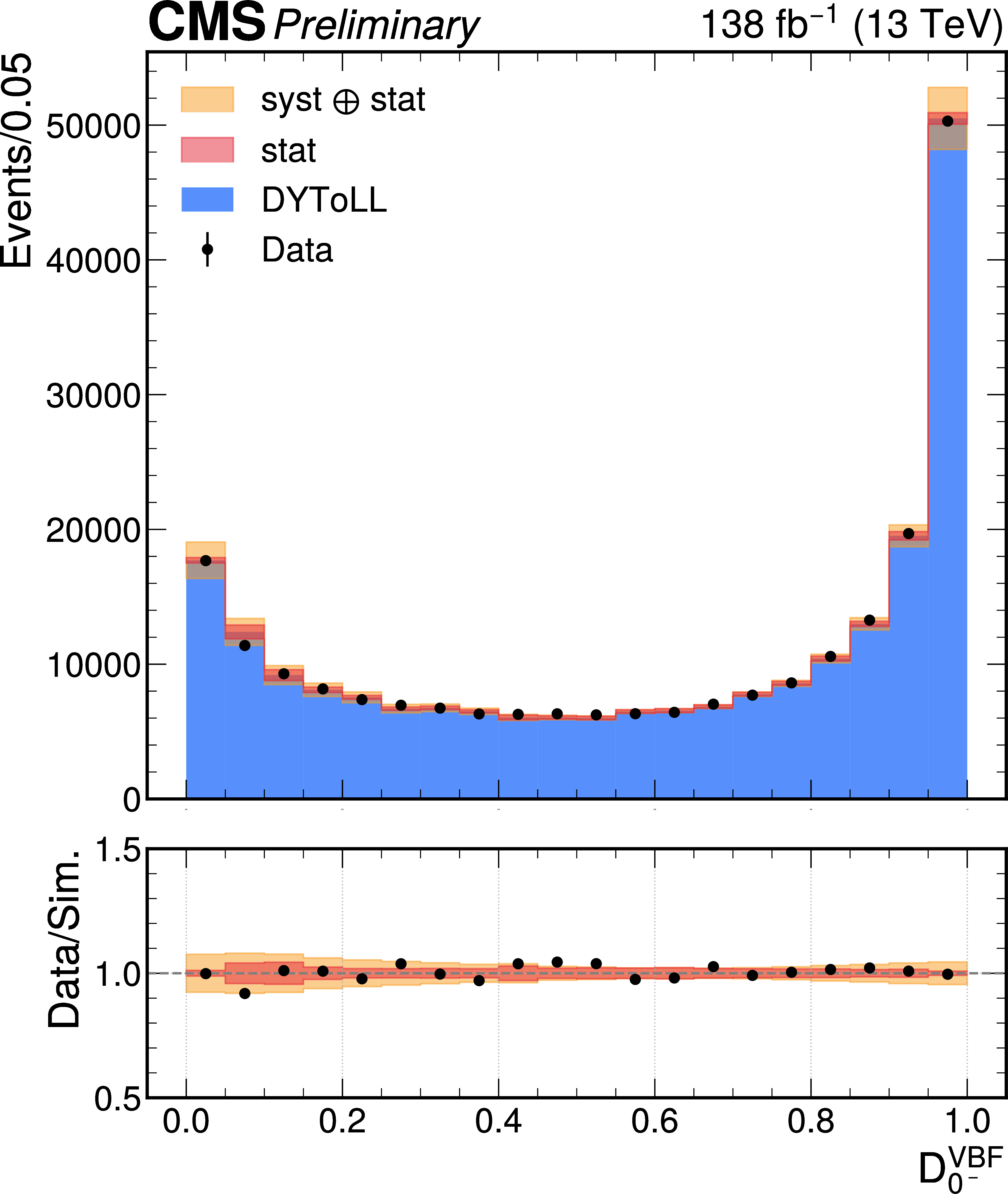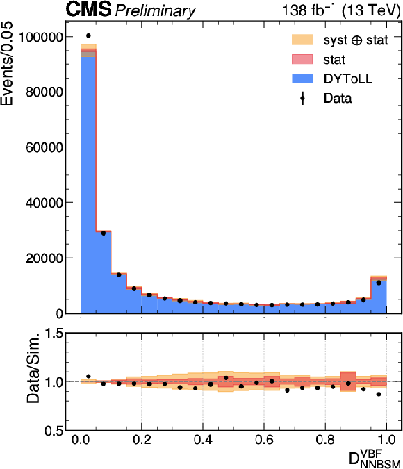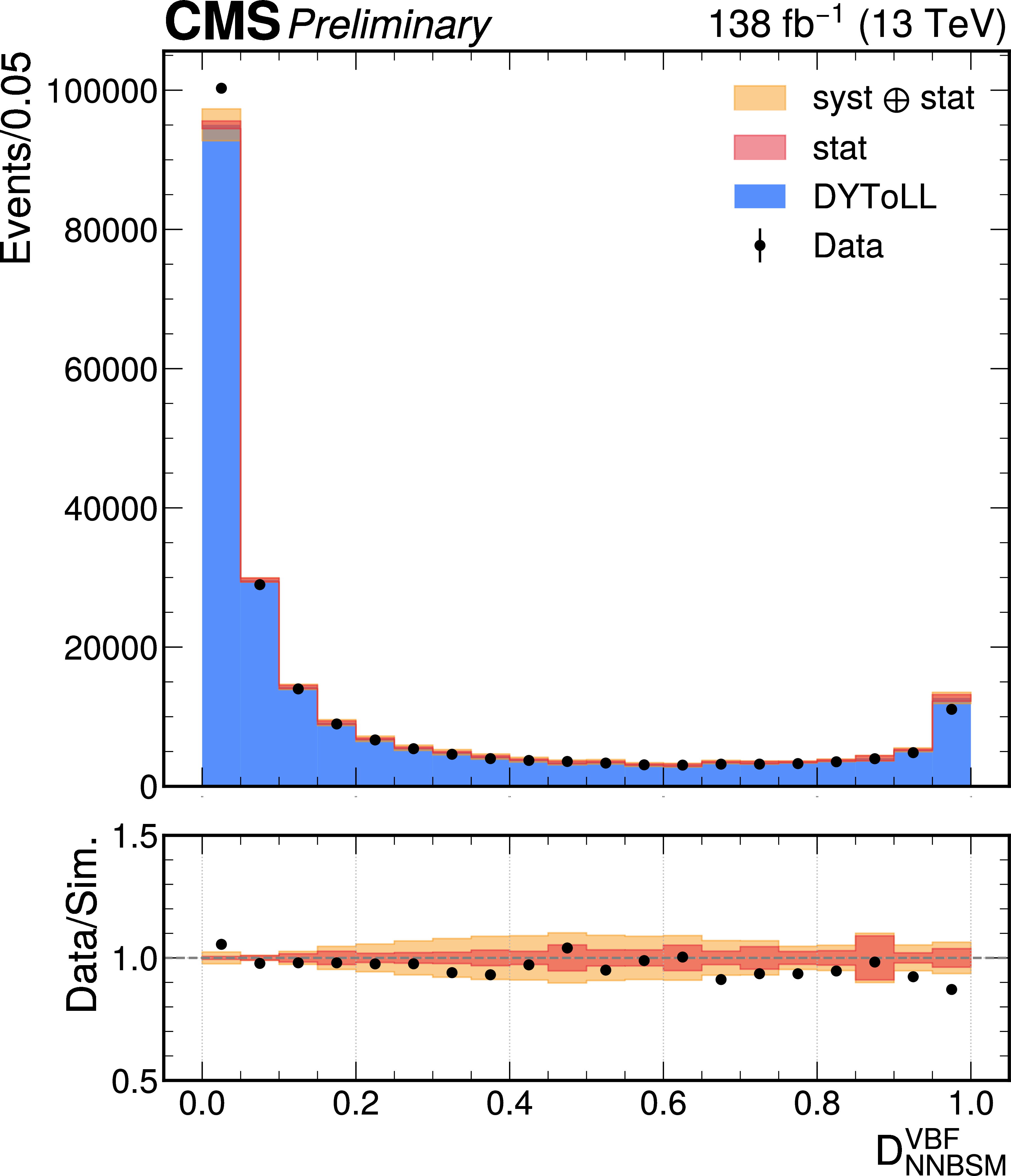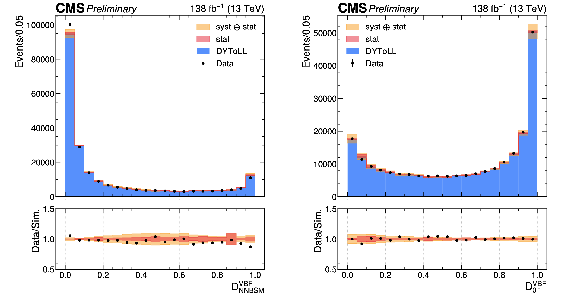 The comparison between simulation (blue filled histograms, normalized to the data integral) and Z($ \rightarrow ee $) + jets data events (black markers) is shown, along with the corresponding ratio plots for the $ \mathcal{D}^\mathrm{VBF}_\mathrm{NNBSM} $ (left) and $ \mathcal{D}^\mathrm{VBF}_\mathrm{0-} $ (right) outputs. The systematic uncertainty is estimated by comparing NLO and LO Drell-Yan simulations, and is treated as a shape uncertainty. |