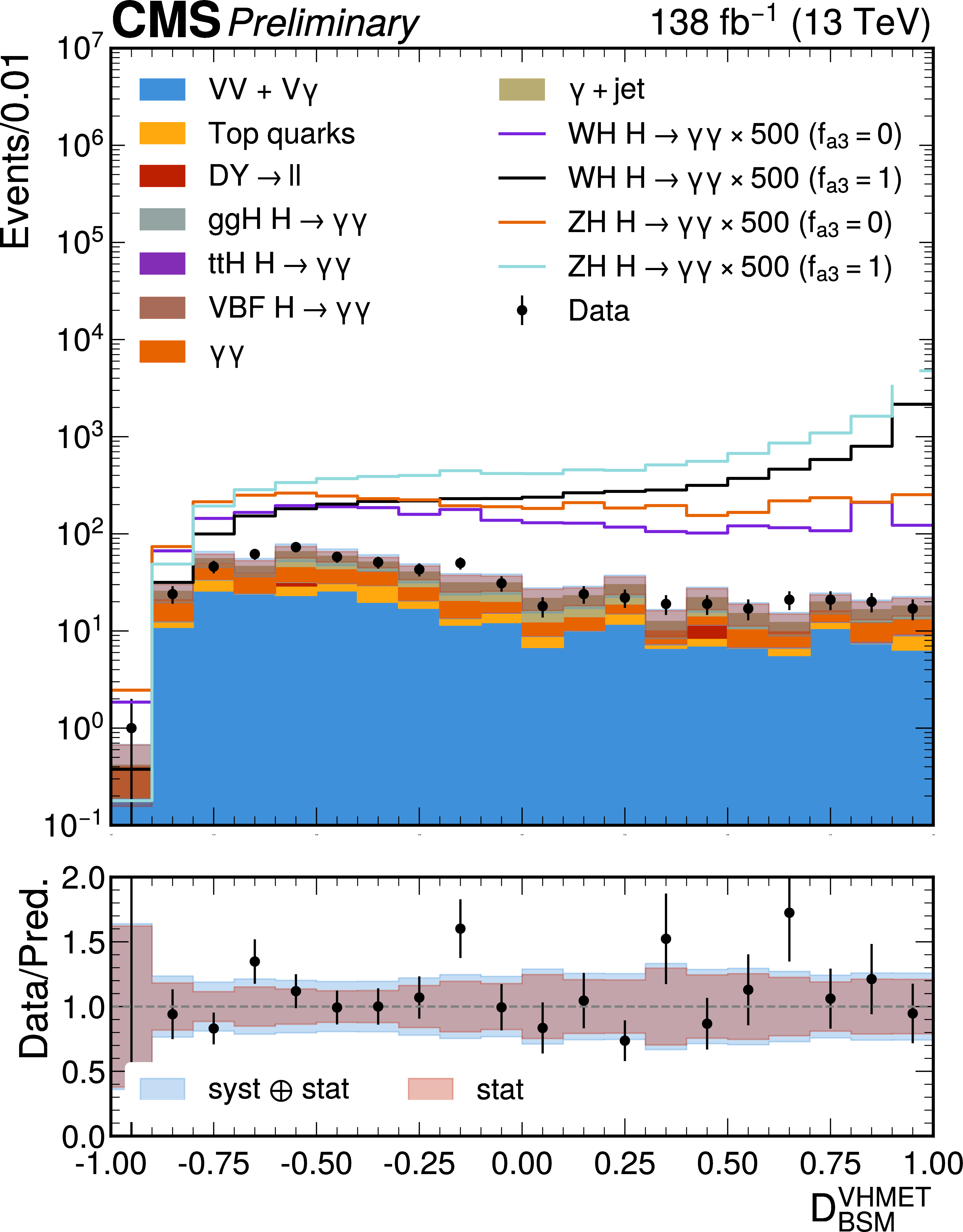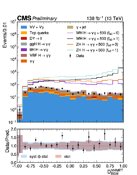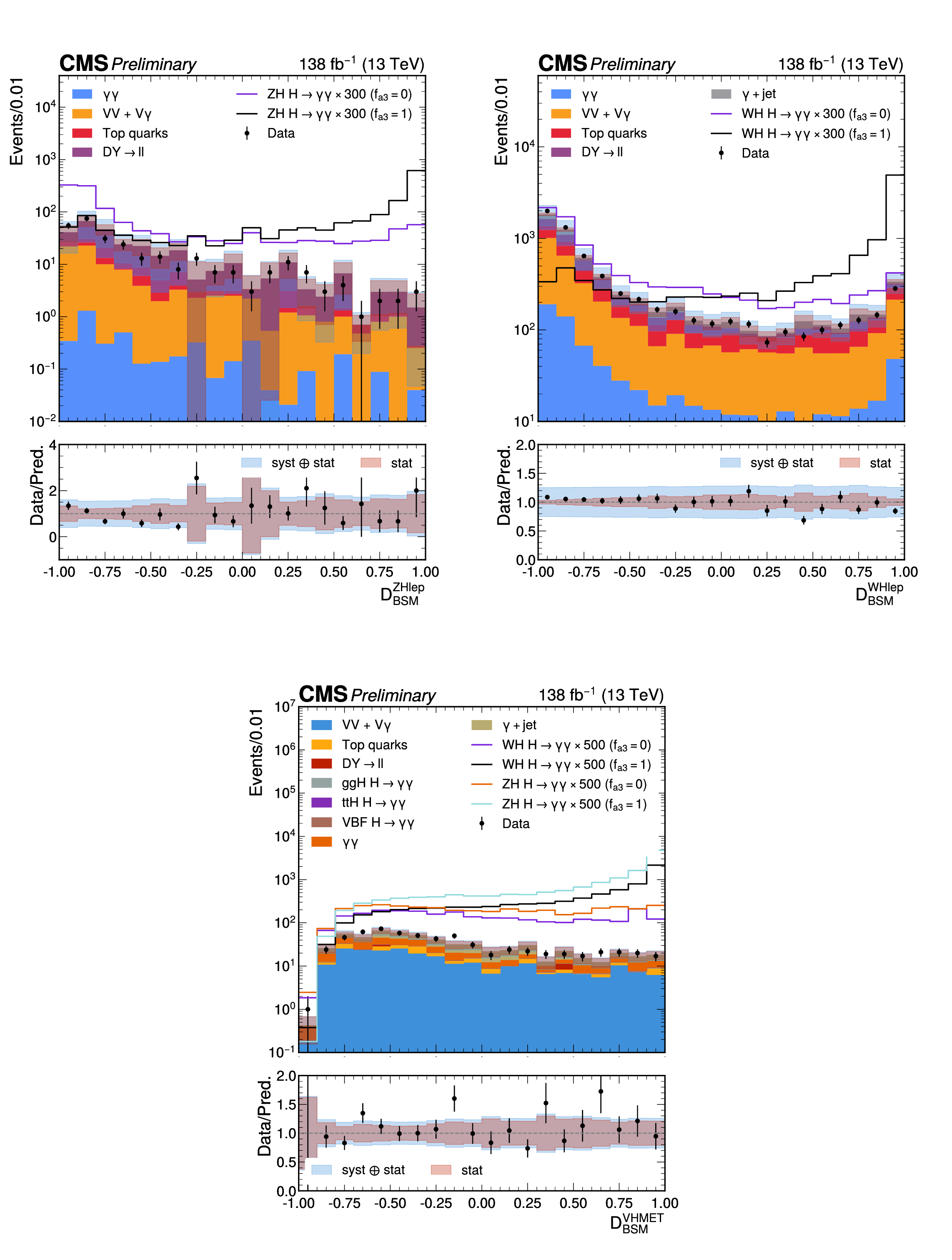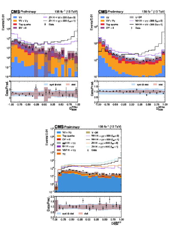 Stacked distributions of the output scores for the V(lep)H BDTs, $ \mathcal{D}^\mathrm{\mathrm{Z}\mathrm{H} lep}_\mathrm{BSM} $ (top left), $ \mathcal{D}^\mathrm{\mathrm{W}\mathrm{H} lep}_\mathrm{BSM} $ (top right), $ \mathcal{D}^\mathrm{\mathrm{V}\mathrm{H} MET}_\mathrm{BSM} $ (bottom) trained to separate the SM H from $ CP $-odd $ (f_{a3}=1) $ sample. The statistical uncertainty in the data points is denoted as vertical bars and that on the background simulation by the gray/blue bars. The simulated signal and background distributions are normalized to the luminosity of the data. To increase its visibility, the signal is scaled by a factor of either 300 or 500 for the different discriminants. For the $ \mathcal{D}^\mathrm{\mathrm{V}\mathrm{H} MET}_\mathrm{BSM} $ distribution, a requirement of $ \mathcal{D}^\mathrm{\mathrm{V}\mathrm{H} MET}_\mathrm{STXS} > $ 0.619 is applied to exclude events not used in the analysis. A systematic uncertainty is assigned to the data-driven component of the non-resonant background, to account for discrepancies between data and simulation. |
