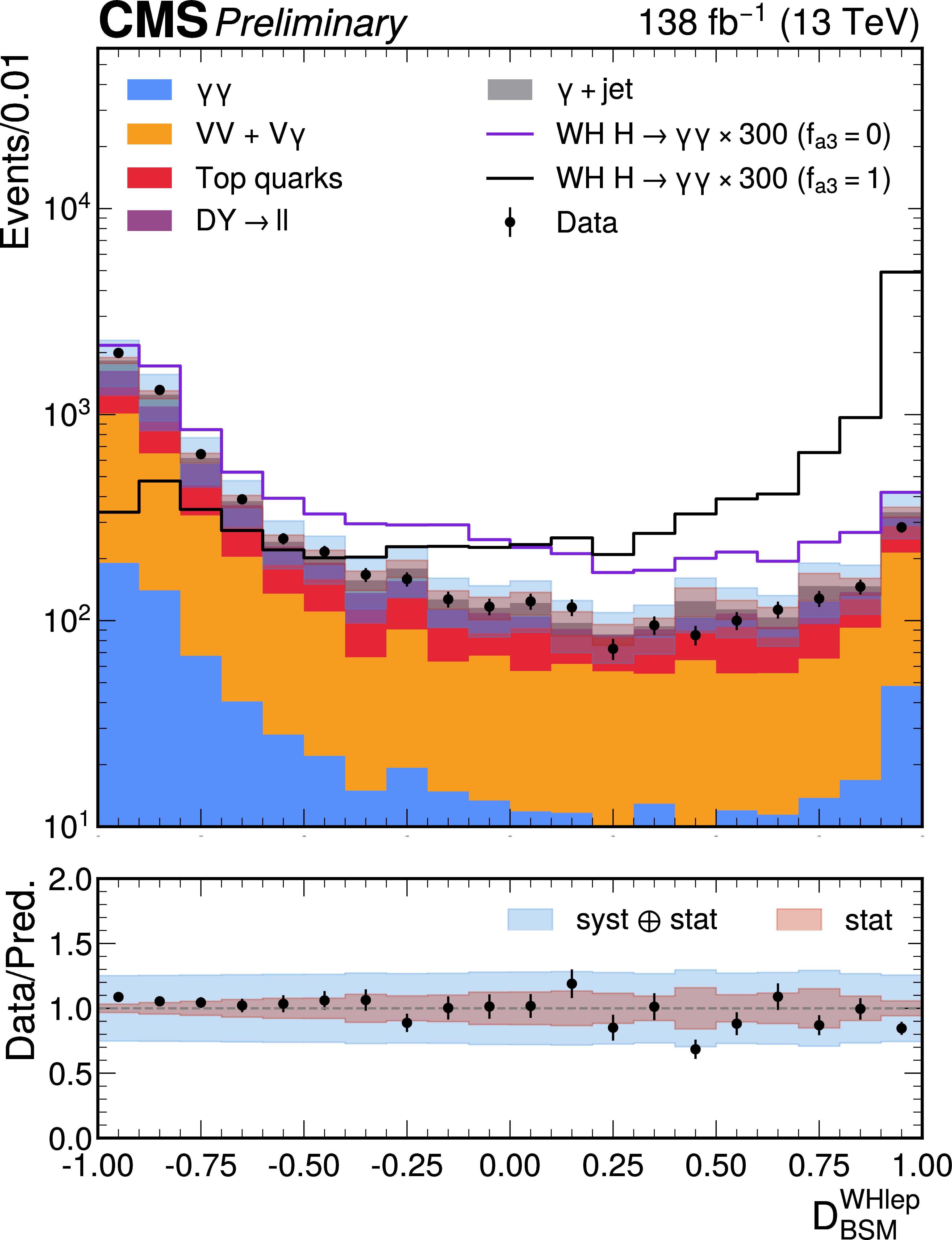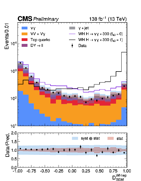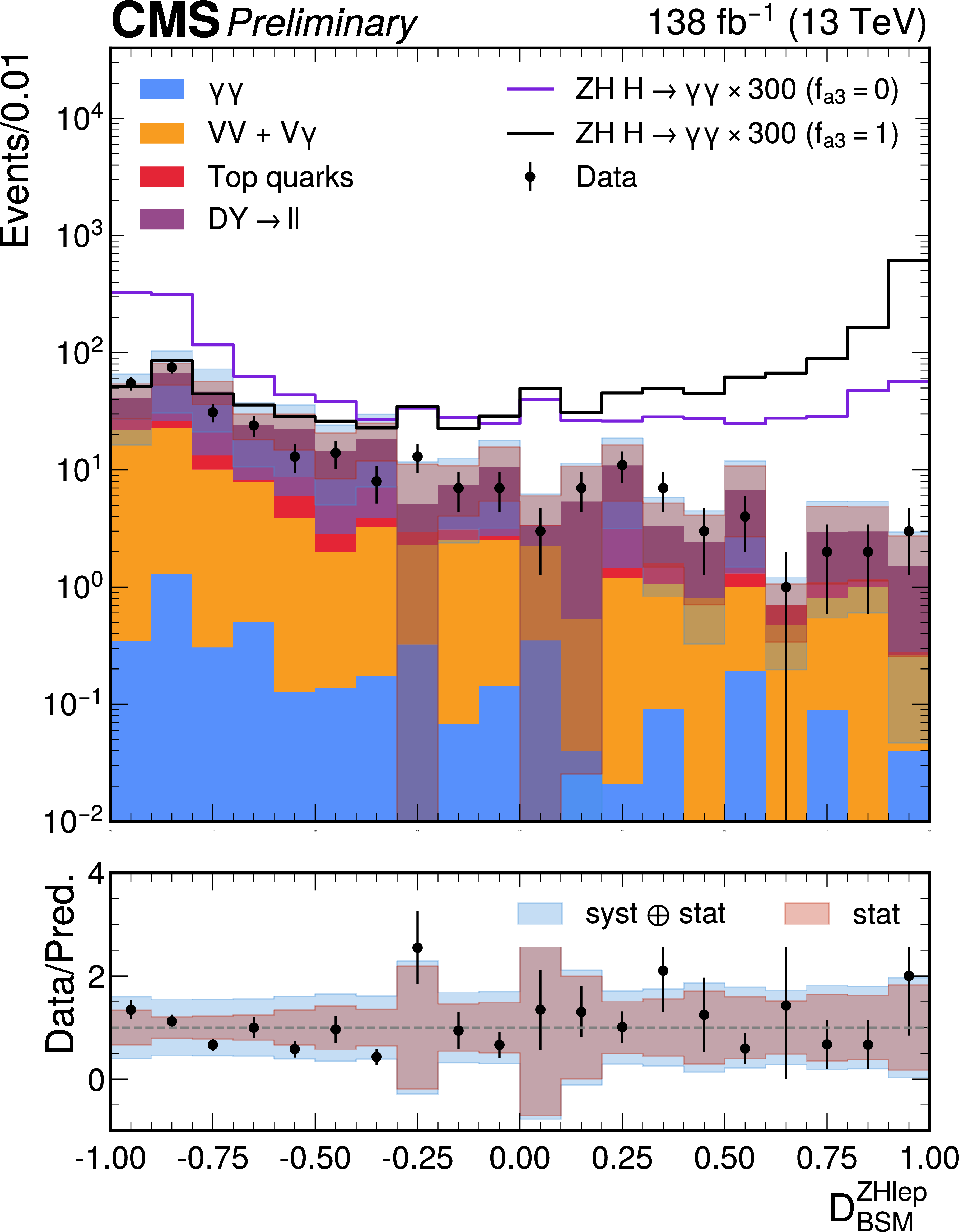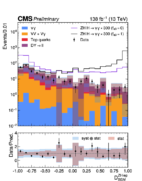 Stacked distributions of the output scores for the V(lep)H BDTs, $ \mathcal{D}^\mathrm{\mathrm{Z}\mathrm{H} lep}_\mathrm{BSM} $ (top left), $ \mathcal{D}^\mathrm{\mathrm{W}\mathrm{H} lep}_\mathrm{BSM} $ (top right), $ \mathcal{D}^\mathrm{\mathrm{V}\mathrm{H} MET}_\mathrm{BSM} $ (bottom) trained to separate the SM H from $ CP $-odd $ (f_{a3}=1) $ sample. The statistical uncertainty in the data points is denoted as vertical bars and that on the background simulation by the gray/blue bars. The simulated signal and background distributions are normalized to the luminosity of the data. To increase its visibility, the signal is scaled by a factor of either 300 or 500 for the different discriminants. For the $ \mathcal{D}^\mathrm{\mathrm{V}\mathrm{H} MET}_\mathrm{BSM} $ distribution, a requirement of $ \mathcal{D}^\mathrm{\mathrm{V}\mathrm{H} MET}_\mathrm{STXS} > $ 0.619 is applied to exclude events not used in the analysis. A systematic uncertainty is assigned to the data-driven component of the non-resonant background, to account for discrepancies between data and simulation. |