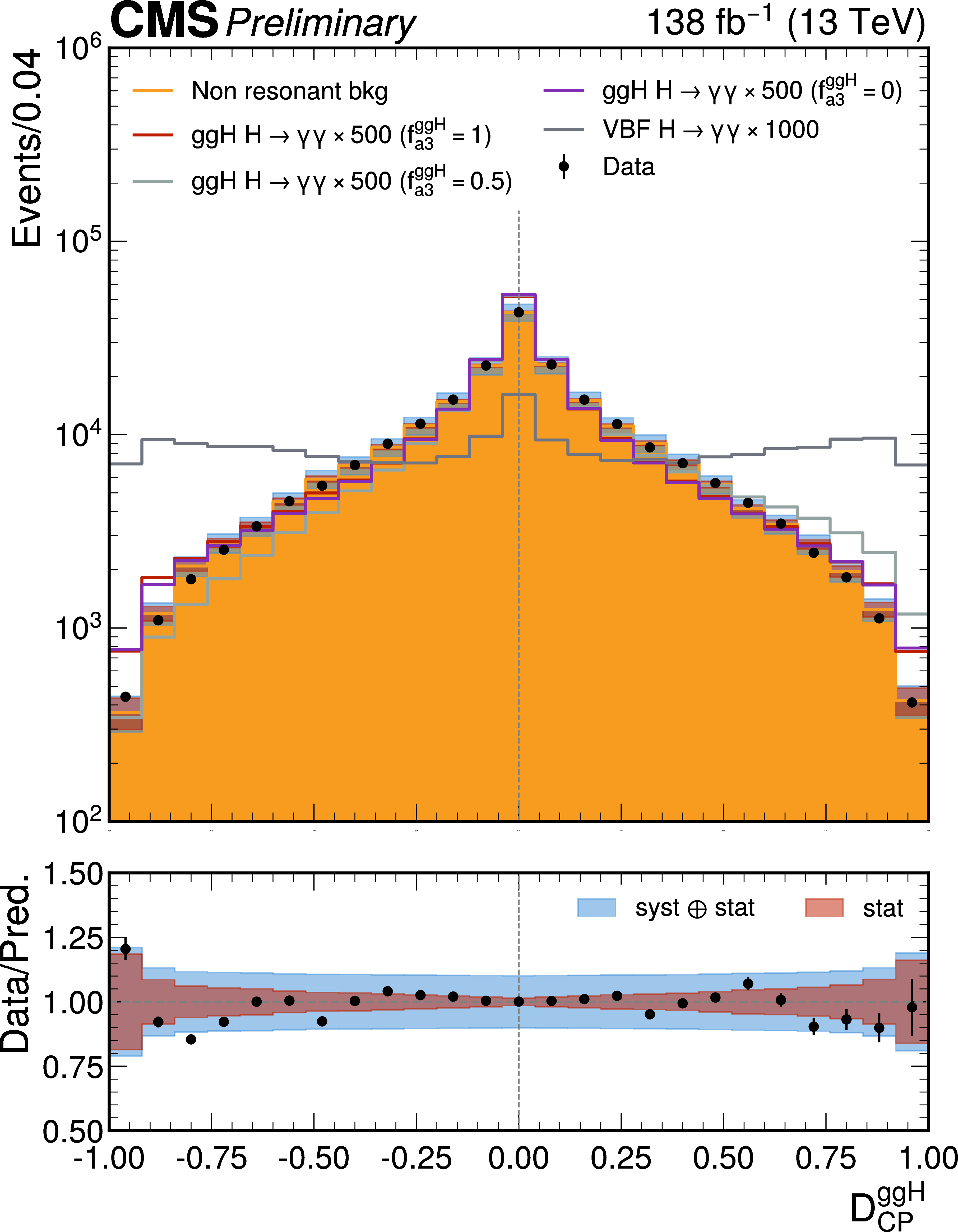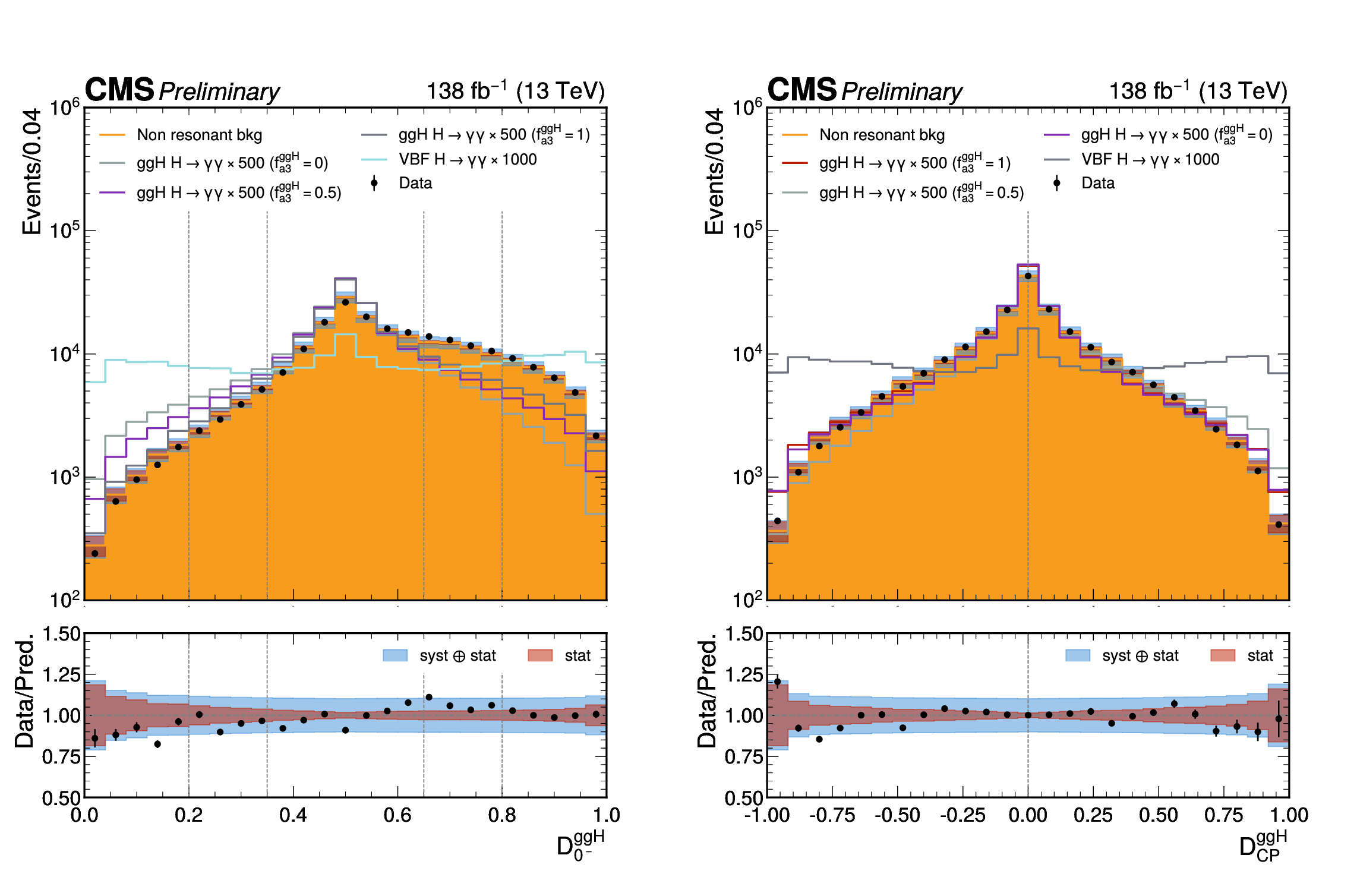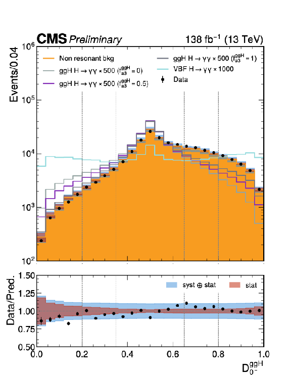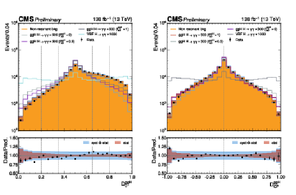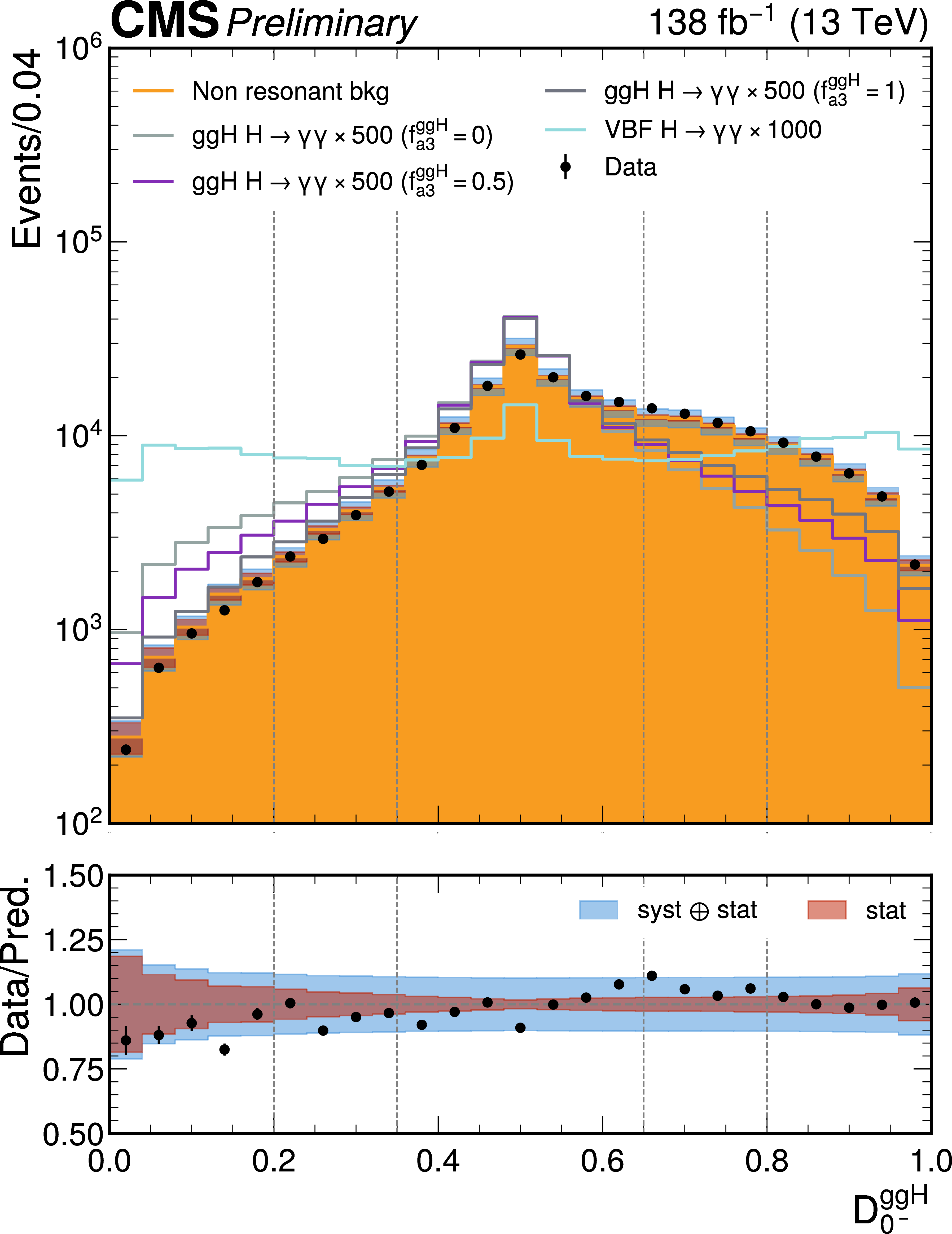 Signal and background distributions for MELA discriminants $ \mathcal{D}_{0-}^{\mathrm{g}\mathrm{g}\mathrm{H}} $ (right) and $ \mathcal{D}_\mathrm{CP}^{\mathrm{g}\mathrm{g}\mathrm{H}} $ (left) used in the $ \mathrm{H}\mathrm{g}\mathrm{g} $ analysis. Events are requested to have two jets with $ p_{\mathrm{T}} > $ 30 GeV. The non-resonant background is normalized to the data integral. The dashed lines indicate the bin boundaries applied in the analysis. A 10% systematic uncertainty is assigned to the data-driven component of the non-resonant background, to account for discrepancies between data and simulation. |
