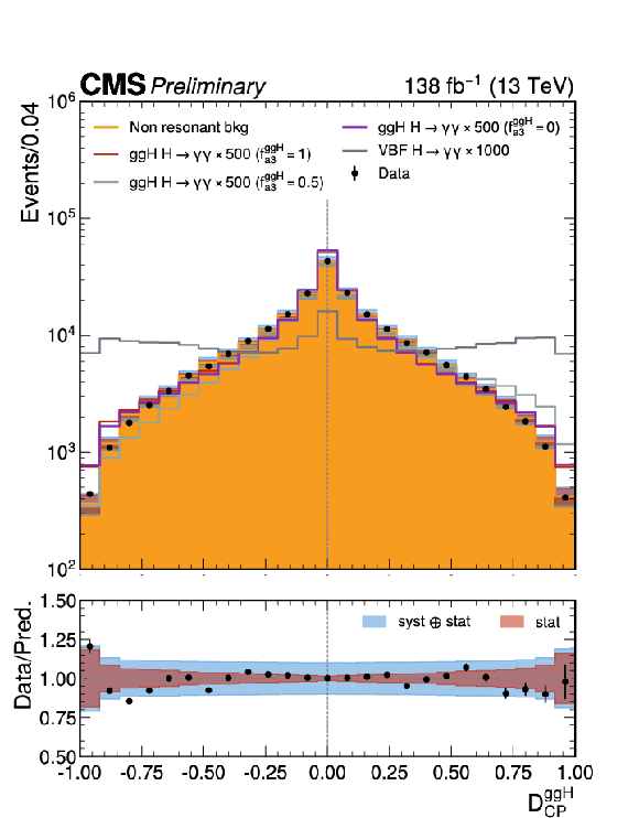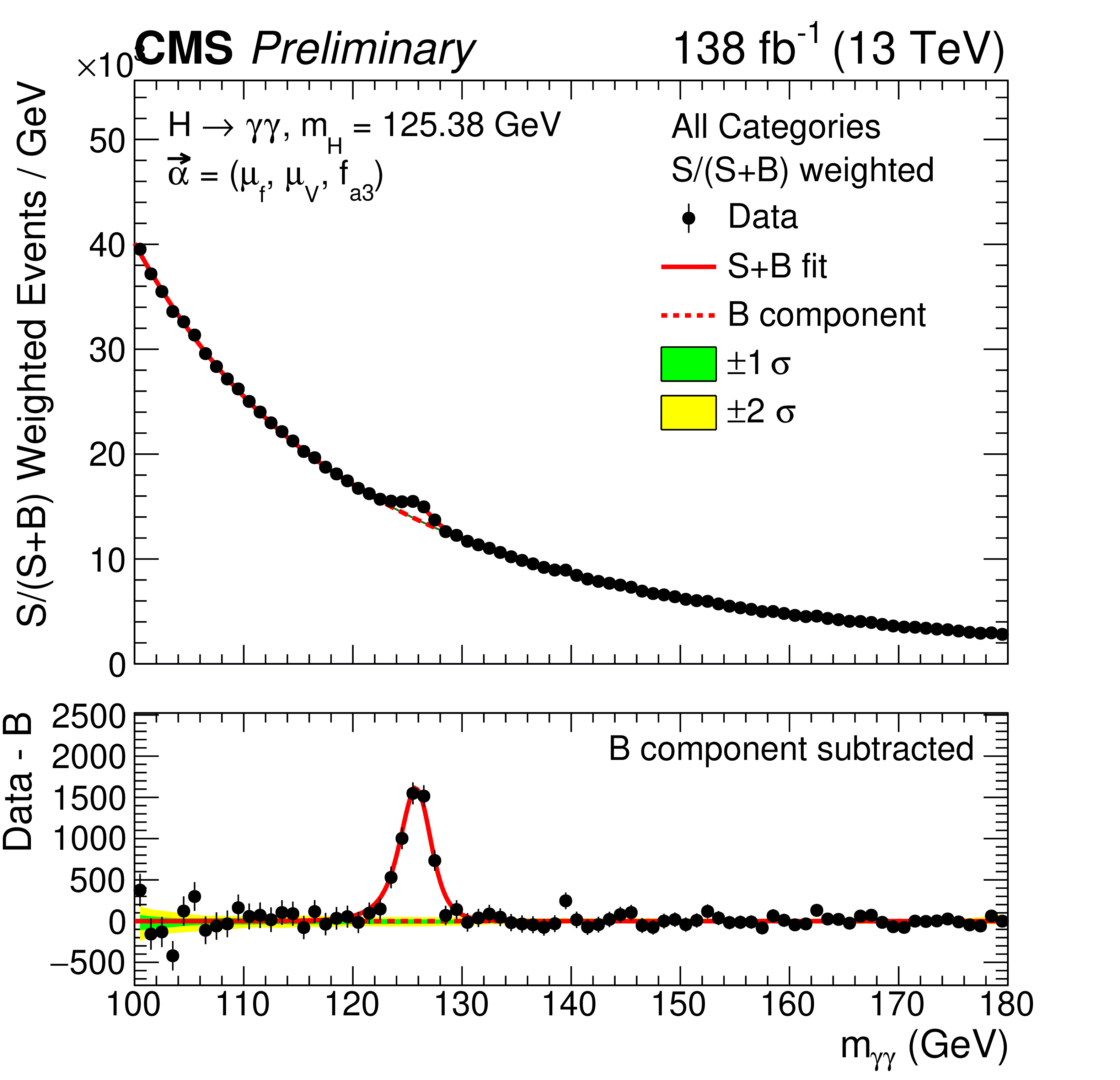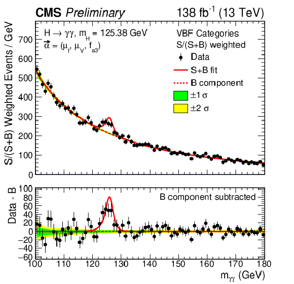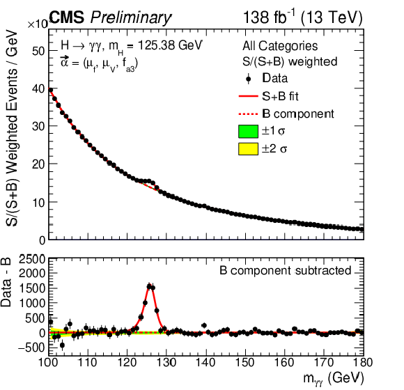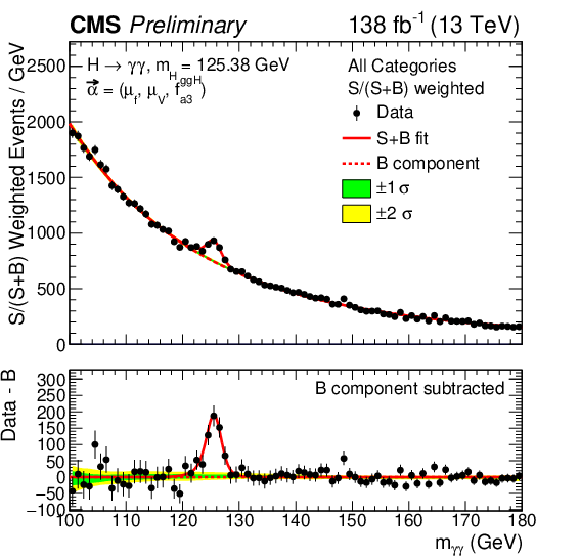 The best fit signal-plus-background model is shown overlaid on the S/(S+B)-weighted distribution of the data points (black) from the fit to the $ f_{a3}^{\mathrm{g}\mathrm{g}\mathrm{H}} $ anomalous coupling parameter, for the sum of all the $ \mathrm{H}\mathrm{g}\mathrm{g} $ analysis categories. S and B represent the fitted number of Higgs boson candidates and background events in the mass peak region. The green and yellow bands correspond to the one and two standard deviation uncertainties on the background component of the fit. The solid red line indicates the total signal-plus-background prediction, while the dashed red line represents the background-only contribution. The lower panel displays the residuals obtained by subtracting the background component from the data. |