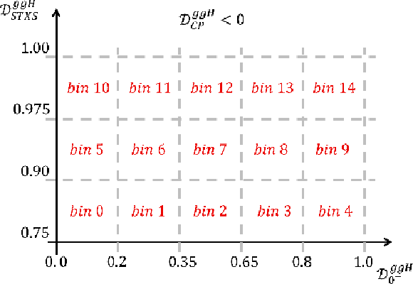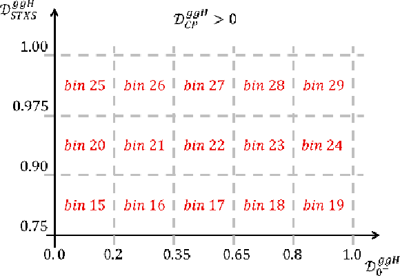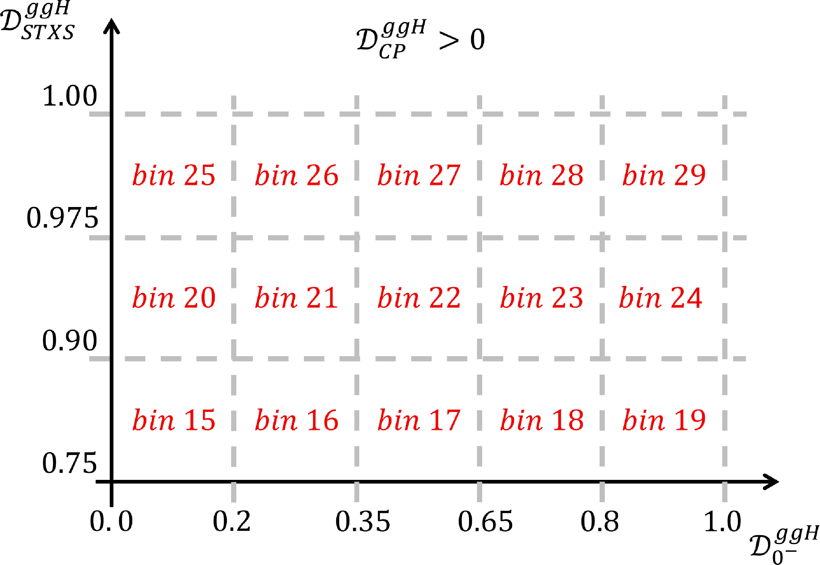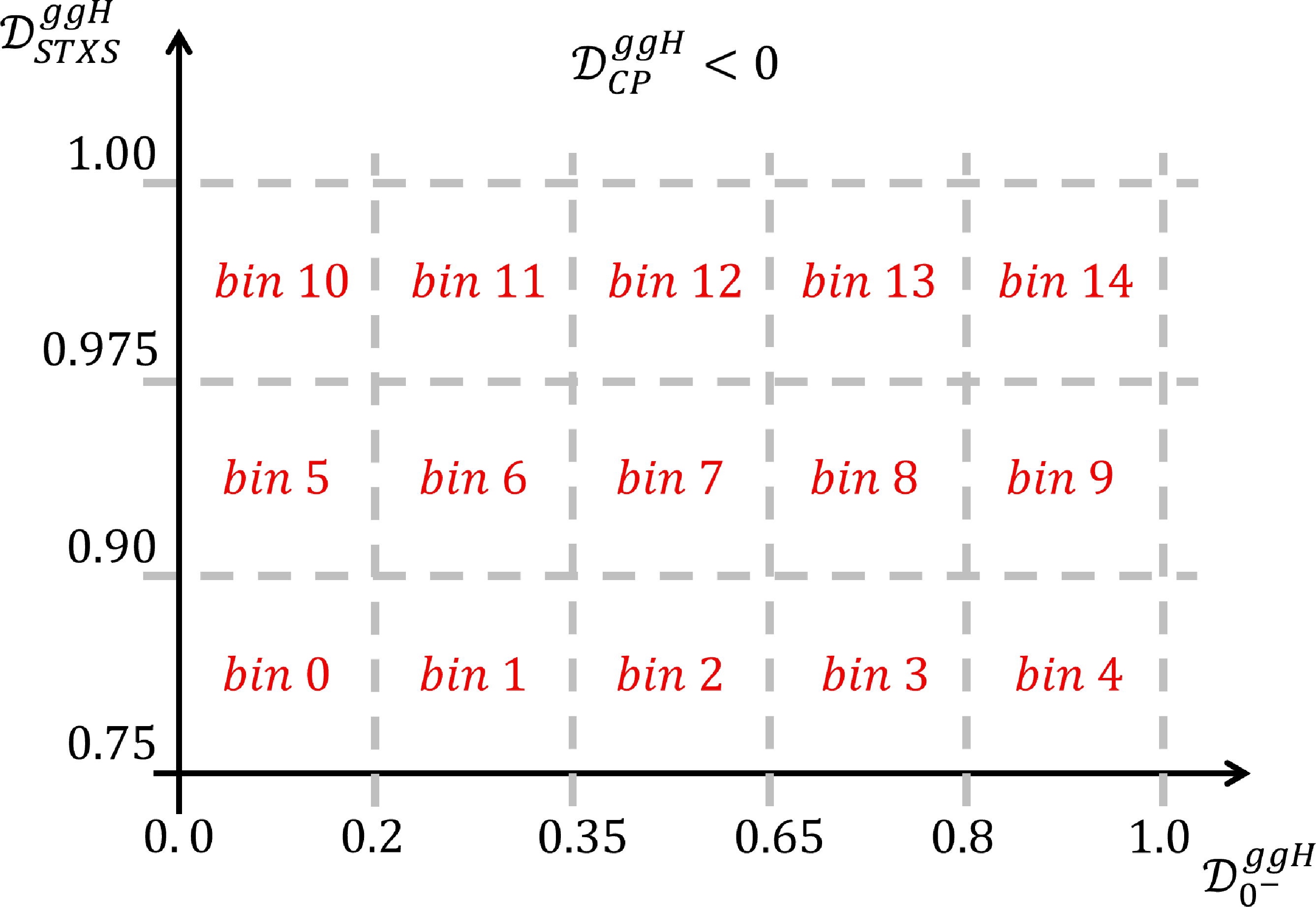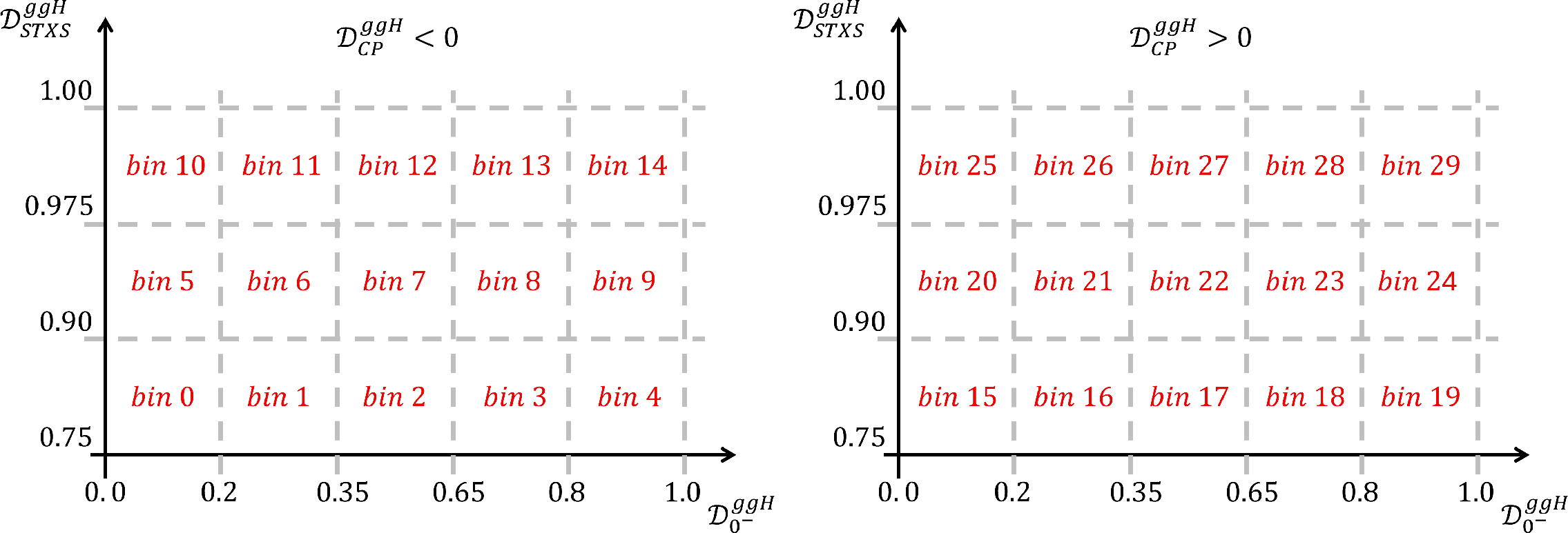 Definition of the $ \mathrm{H}\mathrm{g}\mathrm{g} $ analysis categories defined in bins of $ \mathcal{D}_{0-}^{\mathrm{g}\mathrm{g}\mathrm{H}} $ and $ \mathcal{D}^\mathrm{\mathrm{g}\mathrm{g}\mathrm{H}}_\mathrm{STXS} $, for negative (left) and positive (right) values of $ \mathcal{D}_\mathrm{CP}^{\mathrm{g}\mathrm{g}\mathrm{H}} $. |