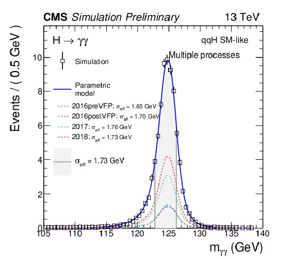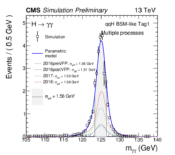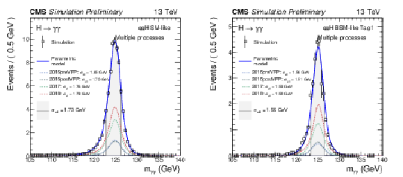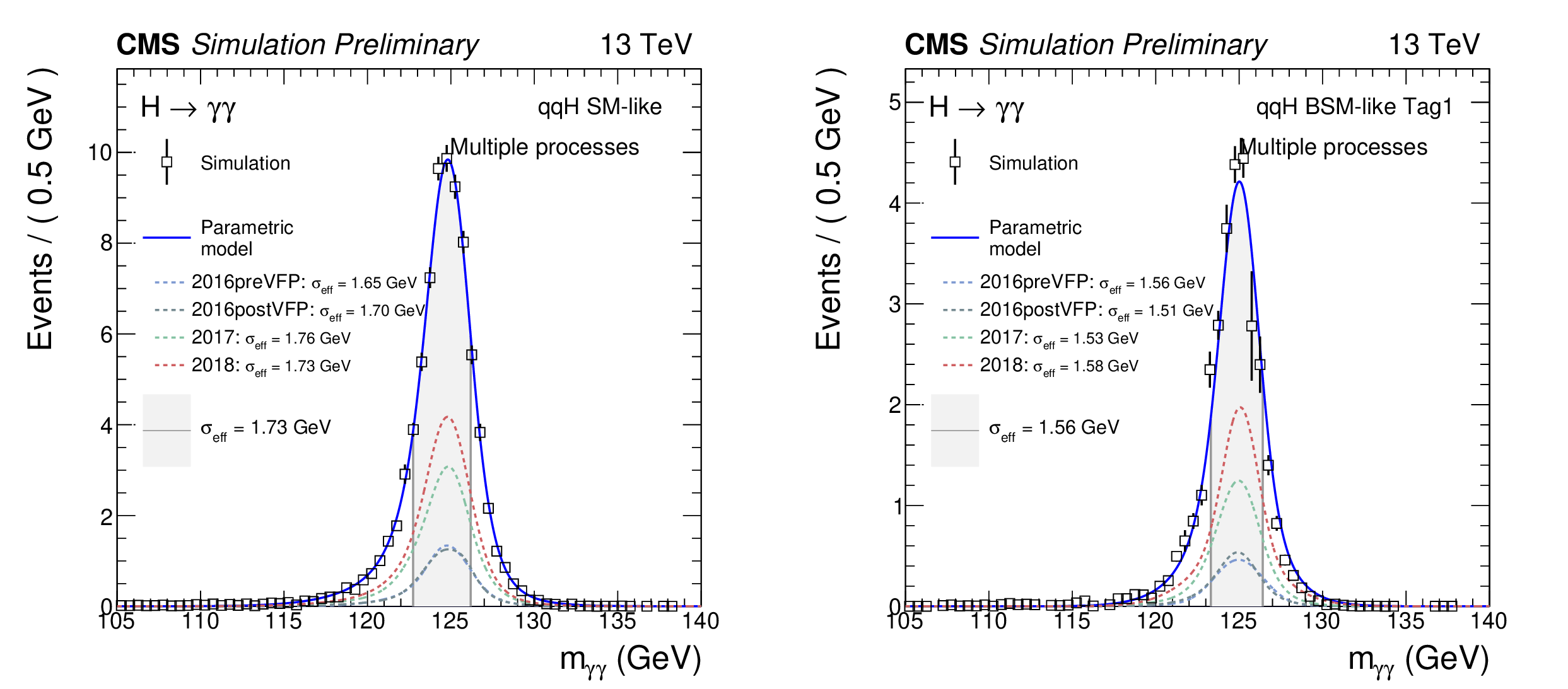Examples of fits to the $ m_{\gamma\gamma} $ distribution for SM signal samples with $ m_\mathrm{H} = $ 125 GeV are shown for the luminosity-weighted average of the three Run 2 data-taking years, in two categories targeting $ \mathrm{VBF} $ production: one dominated by BSM-like events and the other by SM-like events. Different Higgs production modes are summed according to their expected SM cross sections. The points represent simulation events weighted by their respective event weights, while the blue lines show the corresponding signal models. Colored lines represent the individual signal models for each data-taking year. The effective mass resolution ($ \sigma_{\text{eff}} $) of the $ m_{\gamma\gamma} $ distribution is also indicated in the figure. |