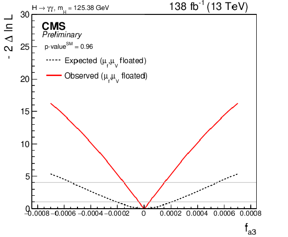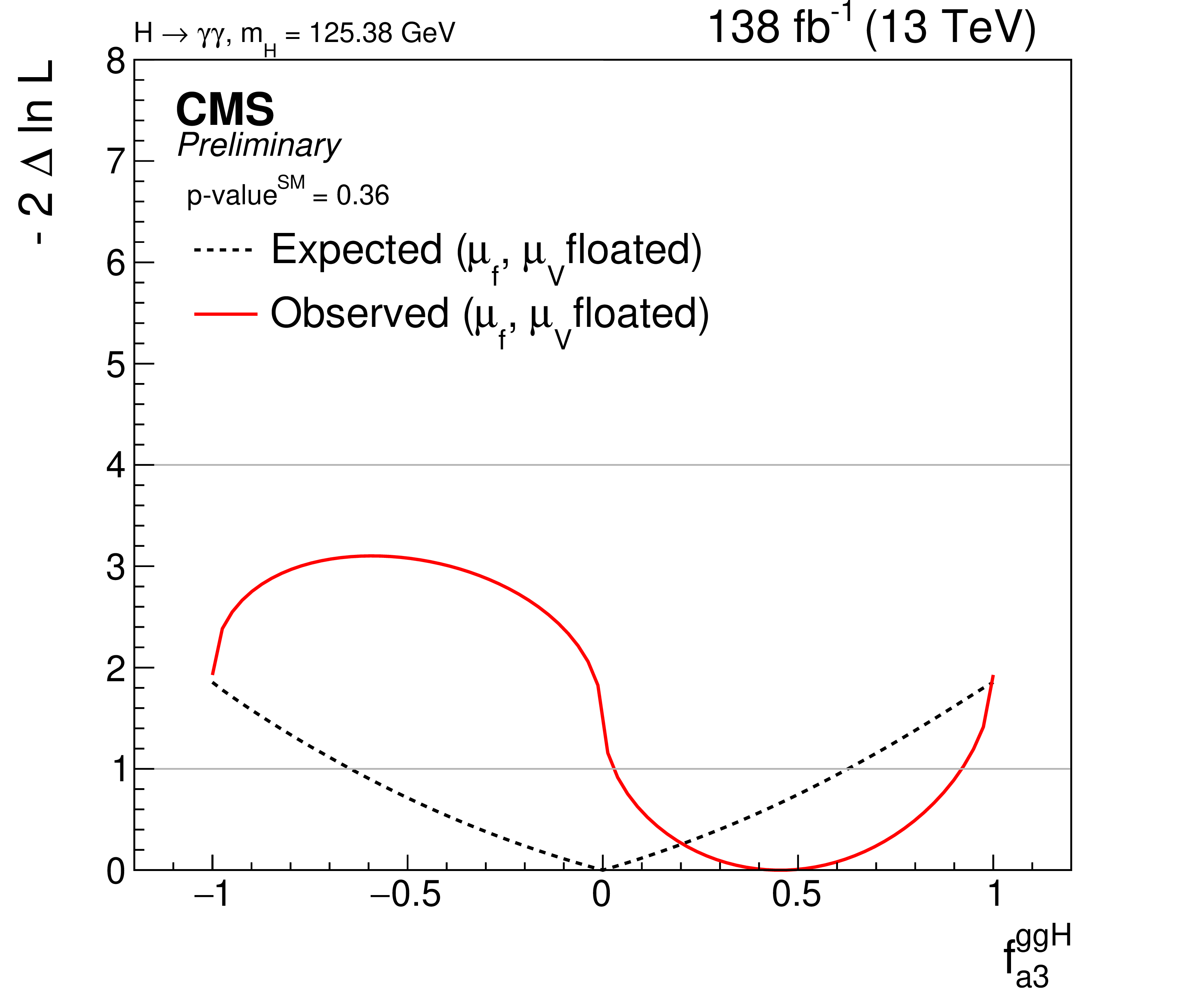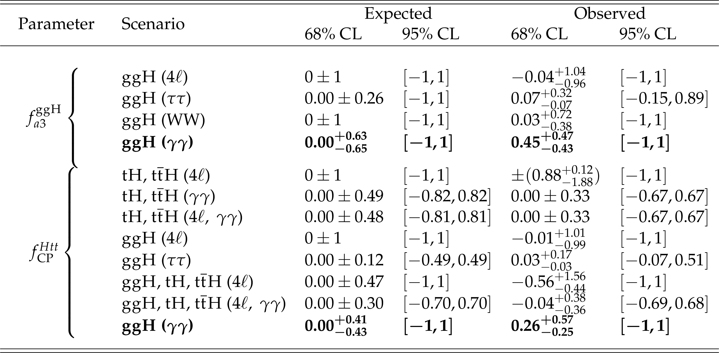 Constraints on the $ f_{a3}^{\mathrm{g}\mathrm{g}\mathrm{H}} $ and $ f_{\rm CP}^{Htt} $ parameters with the best fit values and allowed 68% CL (quoted uncertainties) and 95% CL (within square brackets) intervals, limited to the physical range of $ [-1, 1] $. The $ f_{a3}^{\mathrm{g}\mathrm{g}\mathrm{H}} $ constraints obtained in this work are compared to those obtained in the $ \mathrm{t}\mathrm{H} $ and $ \mathrm{t}\overline{\mathrm{t}}\mathrm{H} \mathrm{H}\to\gamma\gamma $ channel [20], the ggH $ \mathrm{H}\to4\ell $ [none-none-none-none], $ \mathrm{H}\to\tau\tau $ [19], and $ \mathrm{H}\to\mathrm{W}\mathrm{W} $ [34] channels respectively. The interpretation of the $ f_{a3}^{\mathrm{g}\mathrm{g}\mathrm{H}} $ result under the assumption of the top quark dominance in the gluon fusion loop are presented in terms of the $ f_{\rm CP}^{Htt} $ parameter, where either $ \mathrm{g}\mathrm{g}\mathrm{H} $ or its combination with $ \mathrm{t}\mathrm{H} $ and $ \mathrm{t}\overline{\mathrm{t}}\mathrm{H} $ results are shown. |