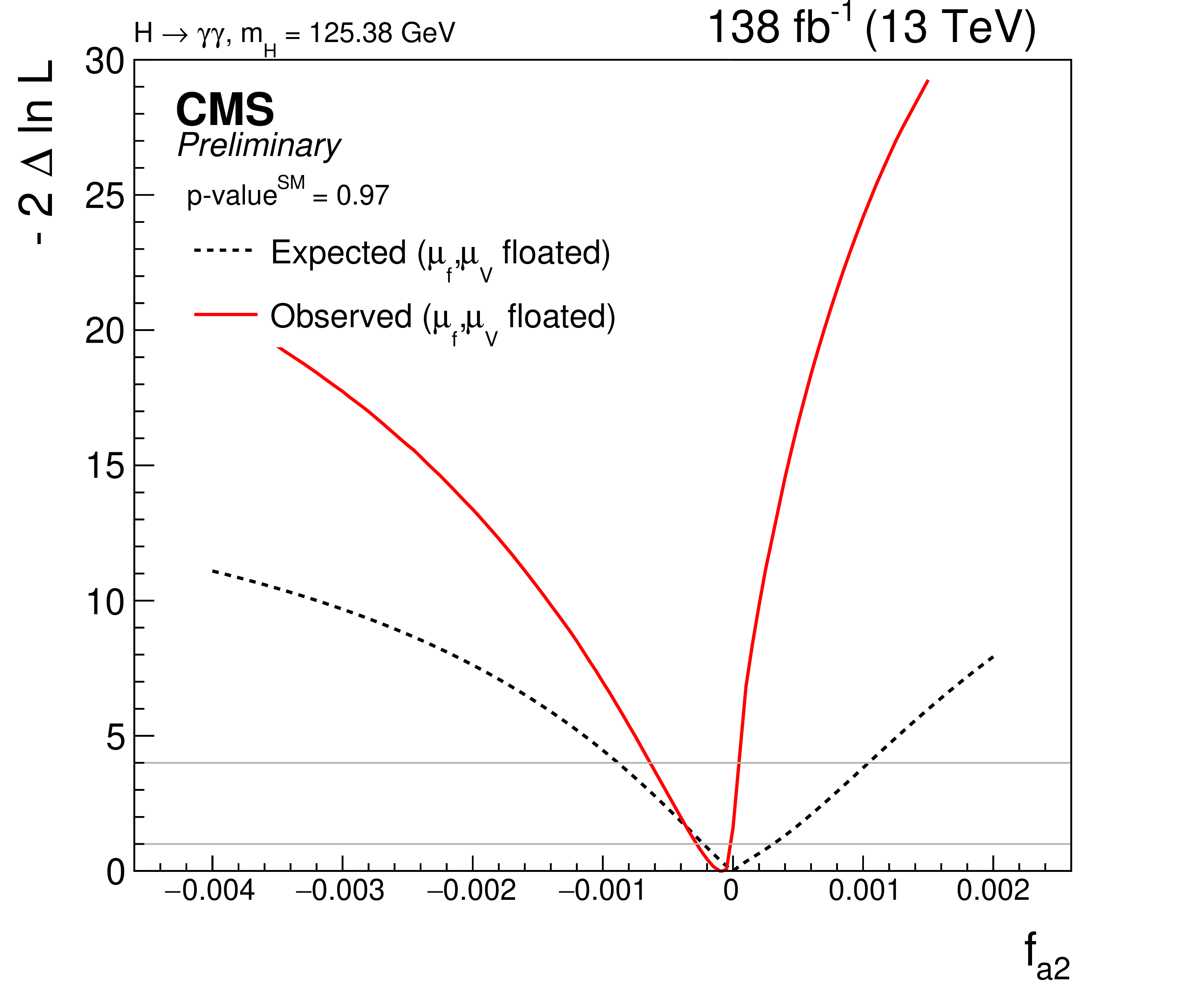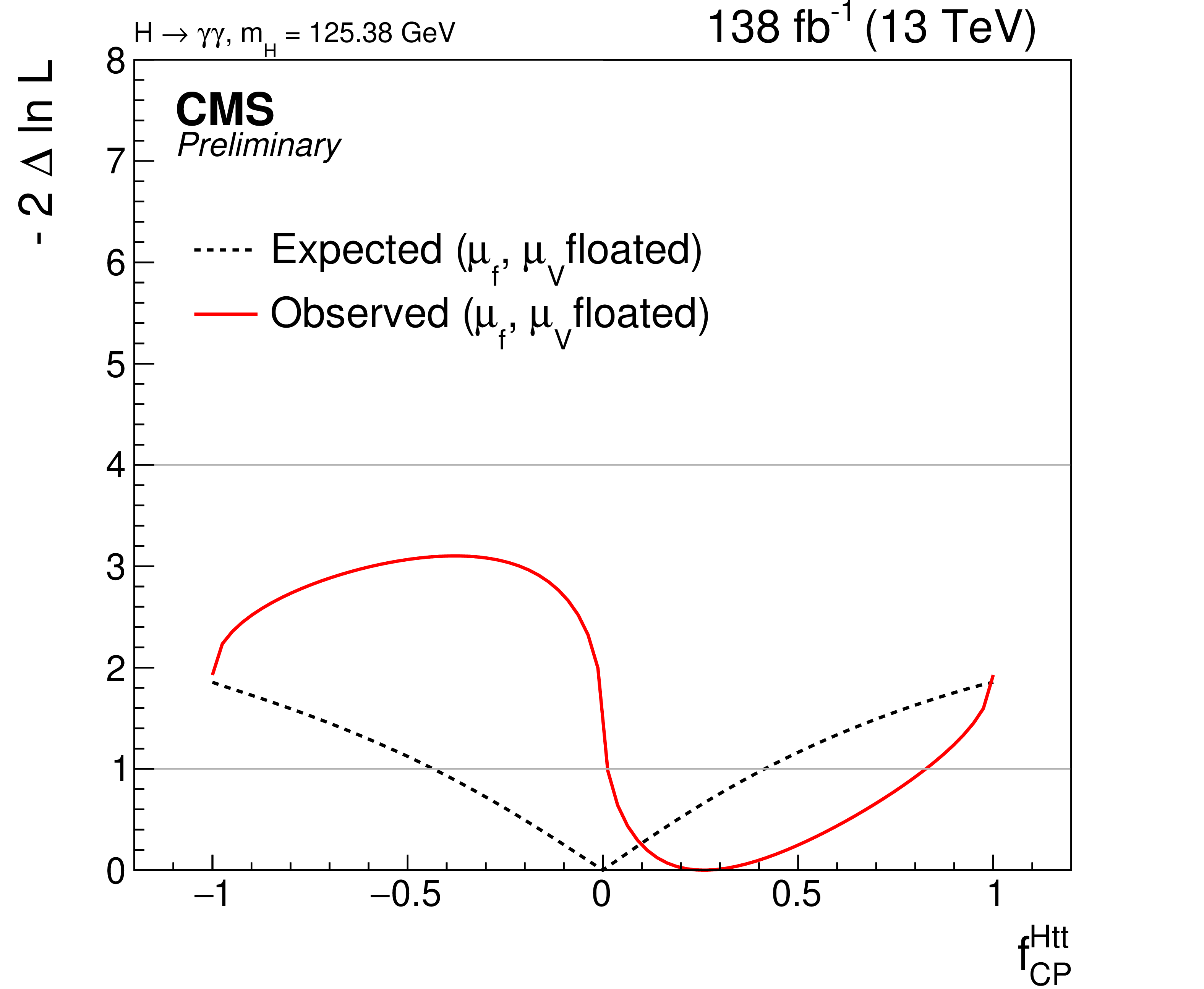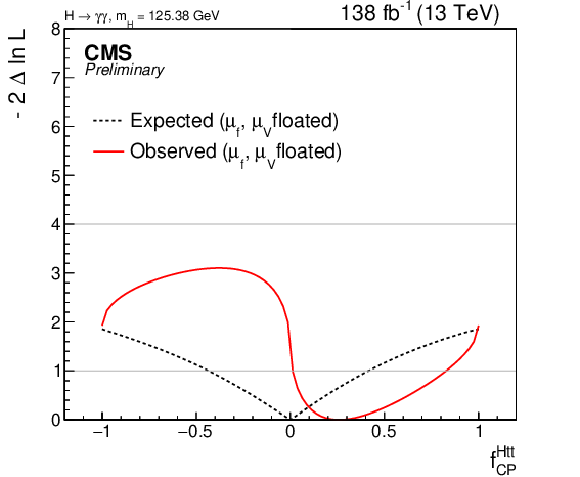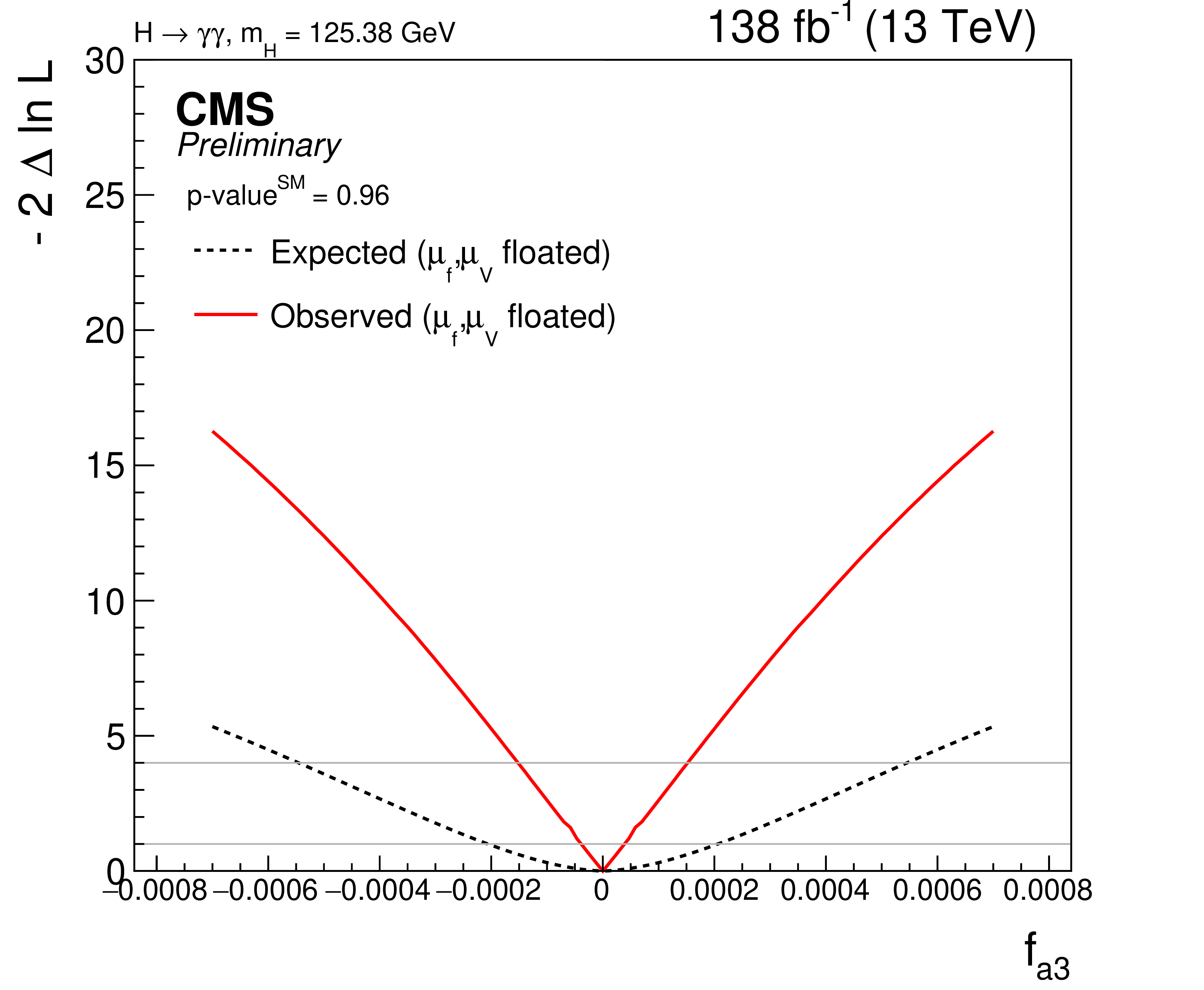 Constraints on the $ f_{a3}^{\mathrm{g}\mathrm{g}\mathrm{H}} $ and $ f_{\rm CP}^{Htt} $ parameters with the best fit values and allowed 68% CL (quoted uncertainties) and 95% CL (within square brackets) intervals, limited to the physical range of $ [-1, 1] $. The $ f_{a3}^{\mathrm{g}\mathrm{g}\mathrm{H}} $ constraints obtained in this work are compared to those obtained in the $ \mathrm{t}\mathrm{H} $ and $ \mathrm{t}\overline{\mathrm{t}}\mathrm{H} \mathrm{H}\to\gamma\gamma $ channel [20], the ggH $ \mathrm{H}\to4\ell $ [none-none-none-none], $ \mathrm{H}\to\tau\tau $ [19], and $ \mathrm{H}\to\mathrm{W}\mathrm{W} $ [34] channels respectively. The interpretation of the $ f_{a3}^{\mathrm{g}\mathrm{g}\mathrm{H}} $ result under the assumption of the top quark dominance in the gluon fusion loop are presented in terms of the $ f_{\rm CP}^{Htt} $ parameter, where either $ \mathrm{g}\mathrm{g}\mathrm{H} $ or its combination with $ \mathrm{t}\mathrm{H} $ and $ \mathrm{t}\overline{\mathrm{t}}\mathrm{H} $ results are shown. |