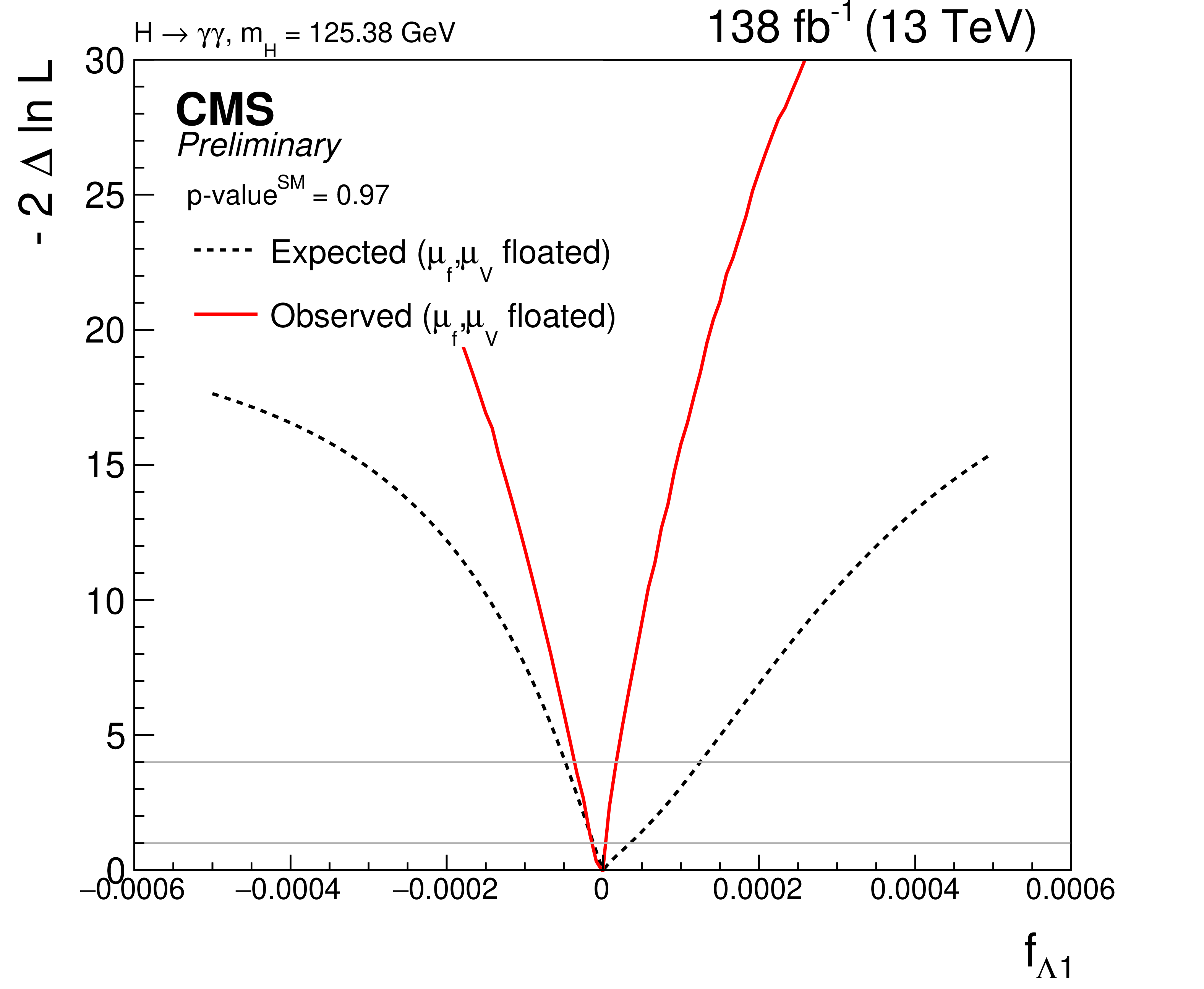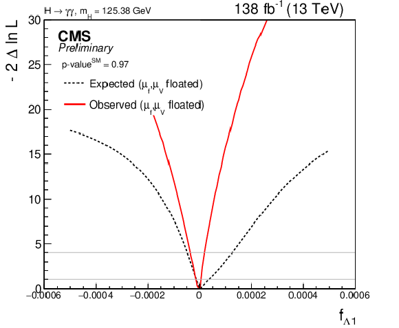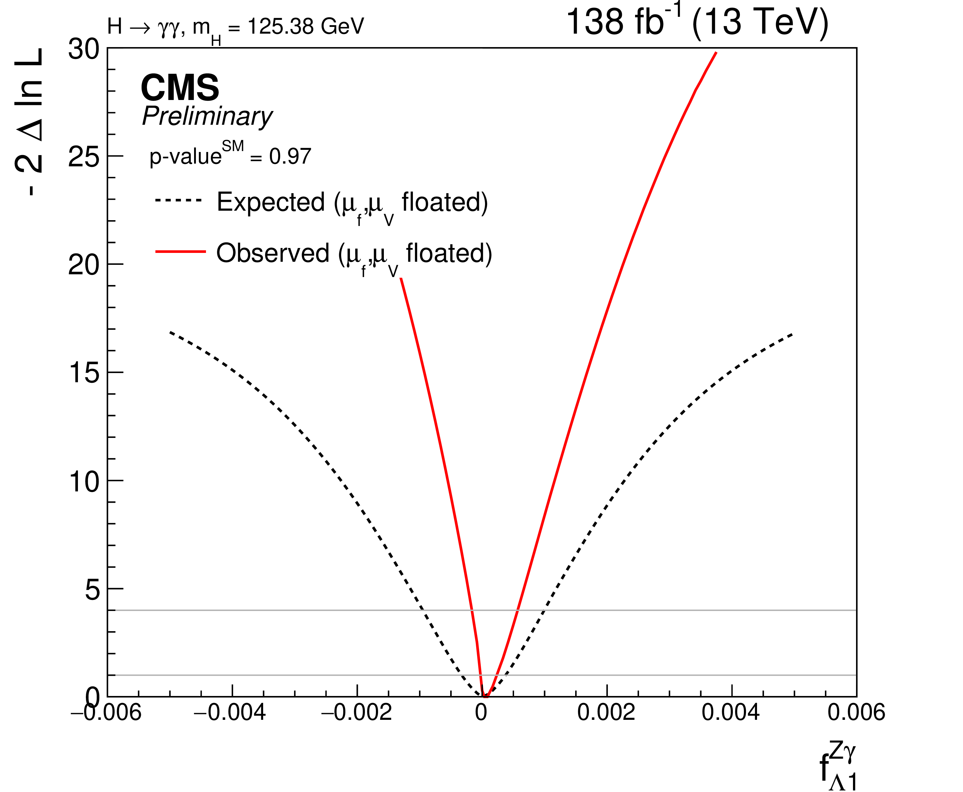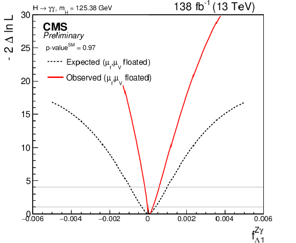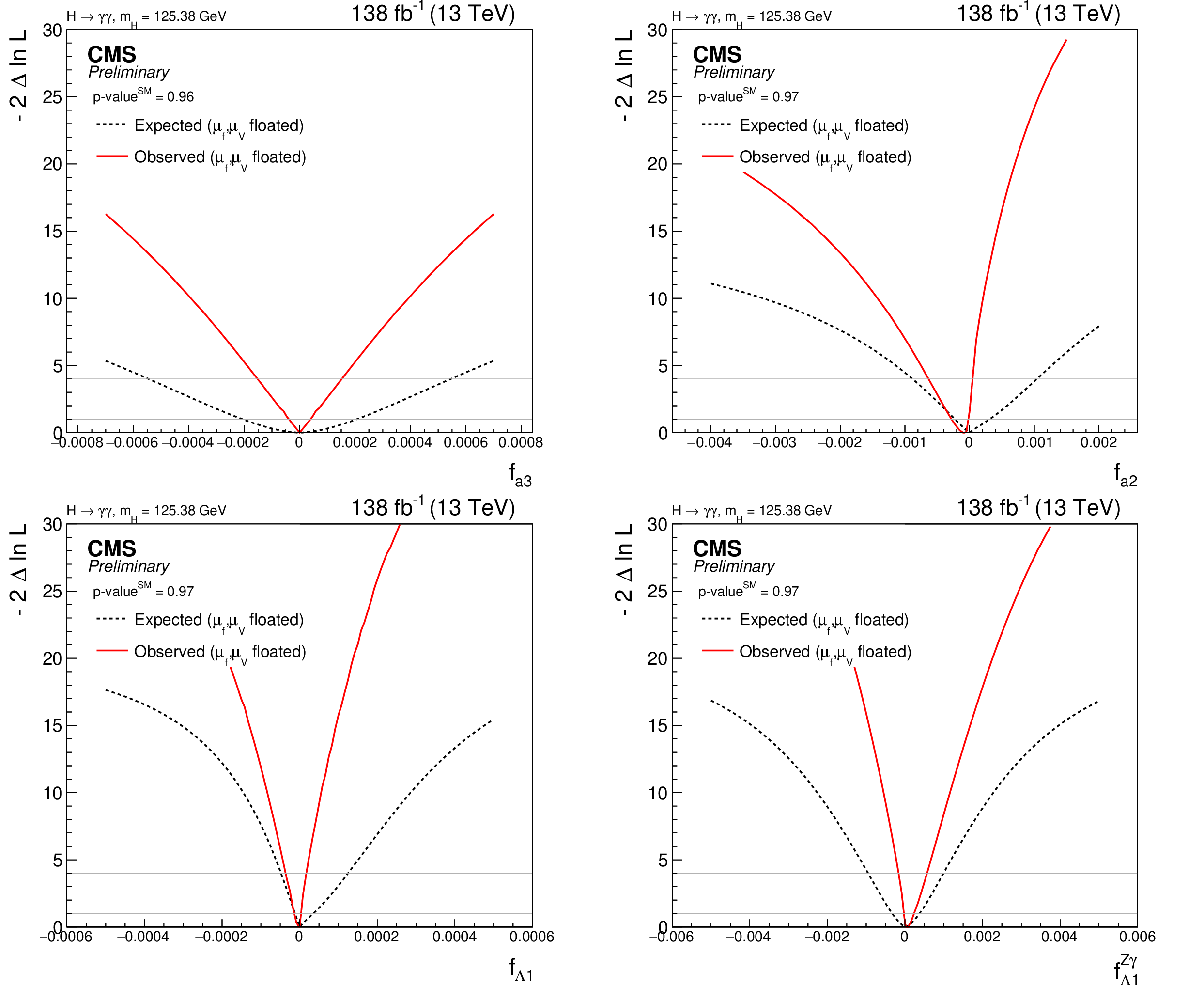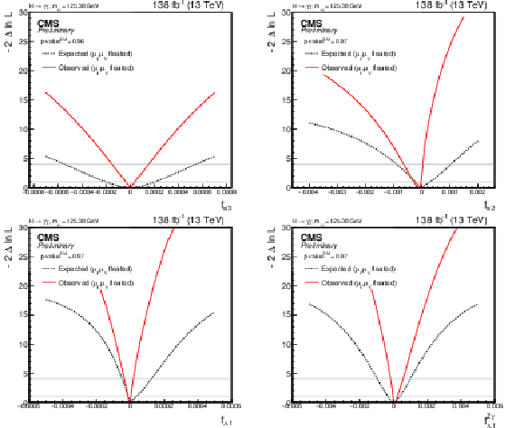 Likelihood scan for the expected and observed constraints of the $ \mathrm{H}\mathrm{V}\mathrm{V} $ coupling parameters: $ f_{a3} $ (top left, p-$ \mathrm{value^{SM}} = $ 0.96), $ f_{a2} $ (top right, p-$ \mathrm{value^{SM}} = $ 0.97), $ f_{\Lambda1} $ (bottom left, p-$ \mathrm{value^{SM}} = $ 0.97), $ f_{\Lambda1}^{Z\gamma} $ (bottom right, p-$ \mathrm{value^{SM}} = $ 0.97). |