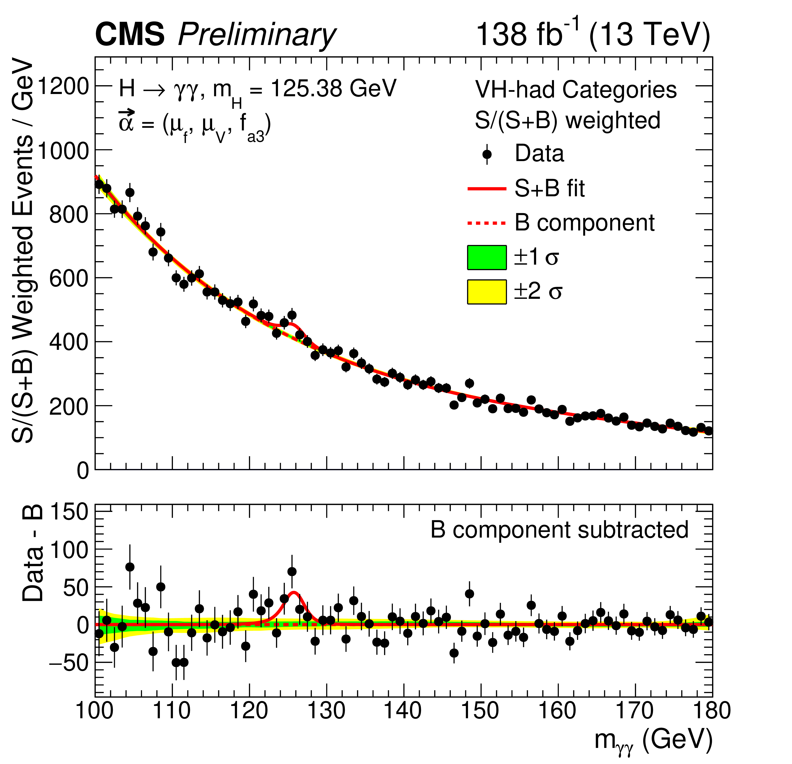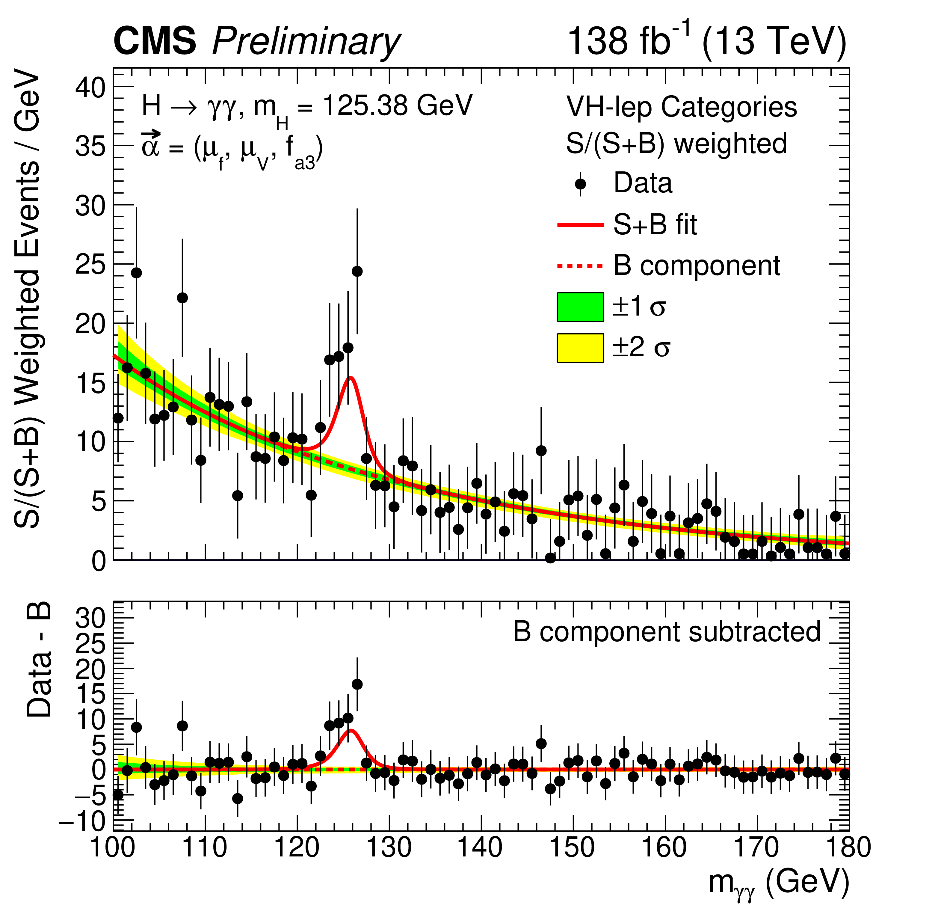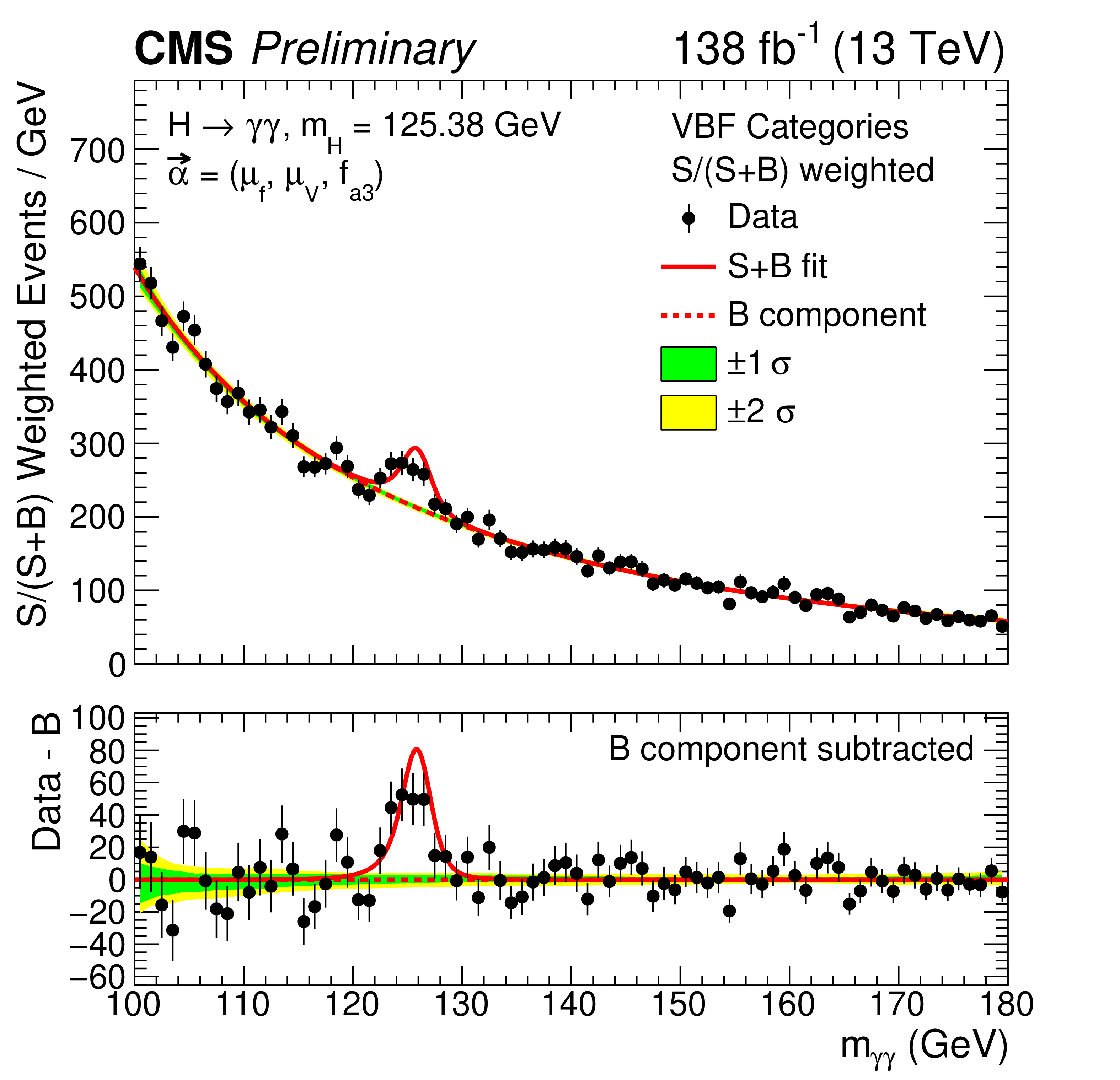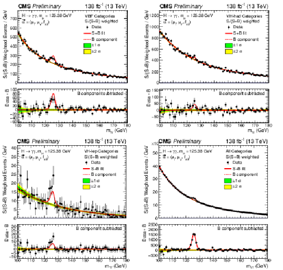 The best fit signal-plus-background model is shown overlaid on the S/(S+B)-weighted distribution of the data points (black) from the fit to the $ f_{a3} $ anomalous coupling parameter. The distributions are presented separately for categories optimized for VBF production (upper left), V(had)H (upper right), and V(lep)H (lower left). The lower right panel shows the combined distribution across all categories. S and B represent the fitted number of Higgs boson candidates and background events in the mass peak region. The green and yellow bands correspond to the one and two standard deviation uncertainties in the background component of the fit. The solid red line indicates the total signal-plus-background prediction, while the dashed red line represents the background-only contribution. The lower panel in each plot displays the residuals obtained by subtracting the background component from the data. |