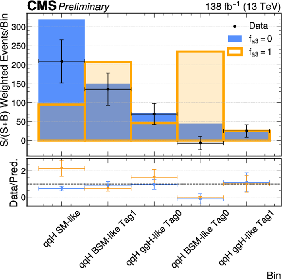 Distribution of events weighted by S/(S+B), using the bins optimized for the VBF production mode. S denotes the sum of all resonant signal events and B represents the non-resonant background. The plot shows the event yields in each bin within the mass window $ m_H - \sigma_{\text{eff}} < m_{\gamma\gamma} < m_H + \sigma_{\text{eff}} $, where $ \sigma_{\text{eff}} $ is defined as the smallest interval containing 68.3% of the $ m_{\gamma\gamma} $ distribution in each bin, for both the full BSM hypothesis (orange) and the SM hypothesis (blue). The data points (black dots) indicate the observed events in the same mass window, after background subtraction, and include statistical uncertainties. |