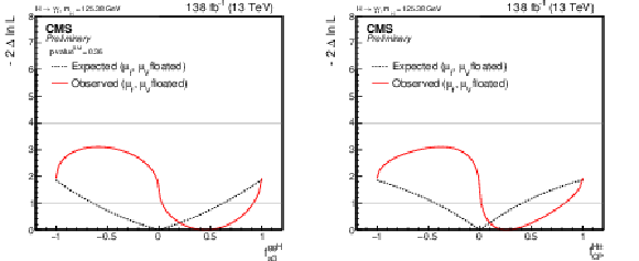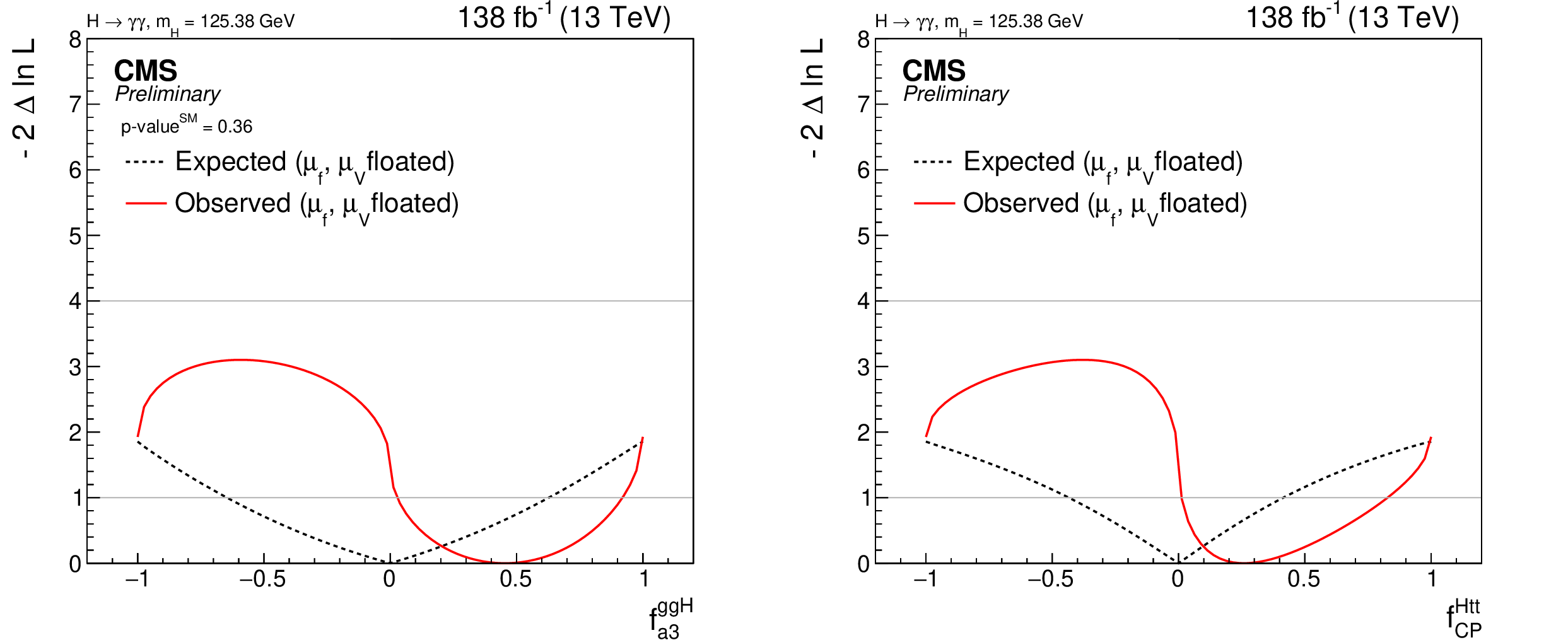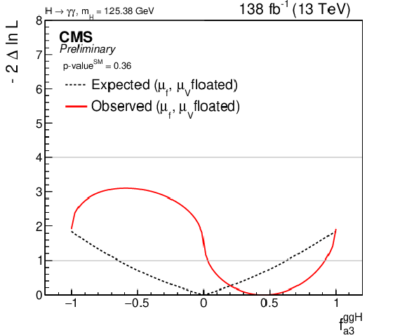 Likelihood profile for the observed and expected CP-odd anomalous coupling parameters: $ f_{a3}^{\mathrm{g}\mathrm{g}\mathrm{H}} $ (left, p-$ \mathrm{value^{SM}} $ = 0.36) and $ f_{\rm CP}^{Htt} $ (right). |