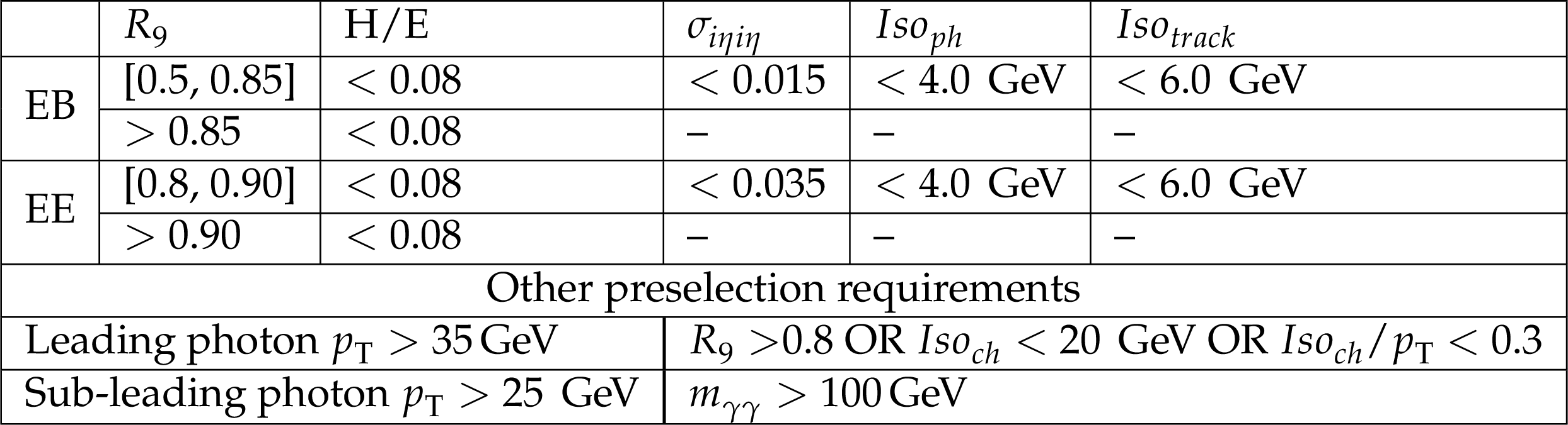 List of the $ \mathrm{H}\to\gamma\gamma $ preselection requirements. EB is the ECAL barrel region, with $ |\eta| < $ 1.442, while EE is the ECAL endcap region, with $ |\eta| > $ 1.566. |